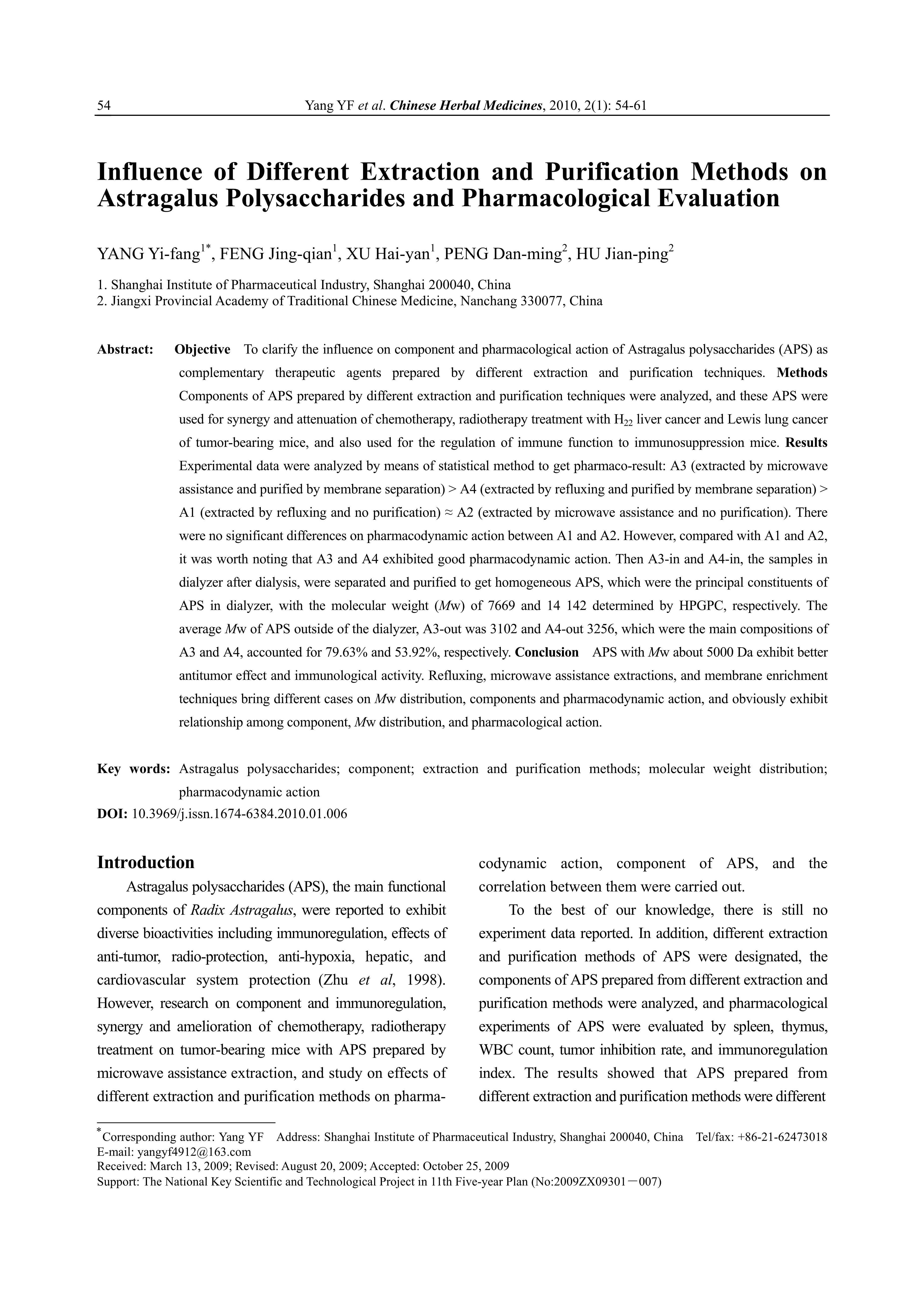 YANG Yi-fang, FENG Jing-qian, XU Hai-yan, PENG Dan-ming, HU Jian-ping. Influence of Different Extraction and Purification Methods on Astragalus Polysaccharides and Pharmacological Evaluation[J]. Chinese Herbal Medicines (CHM),2010,2(1):54-61