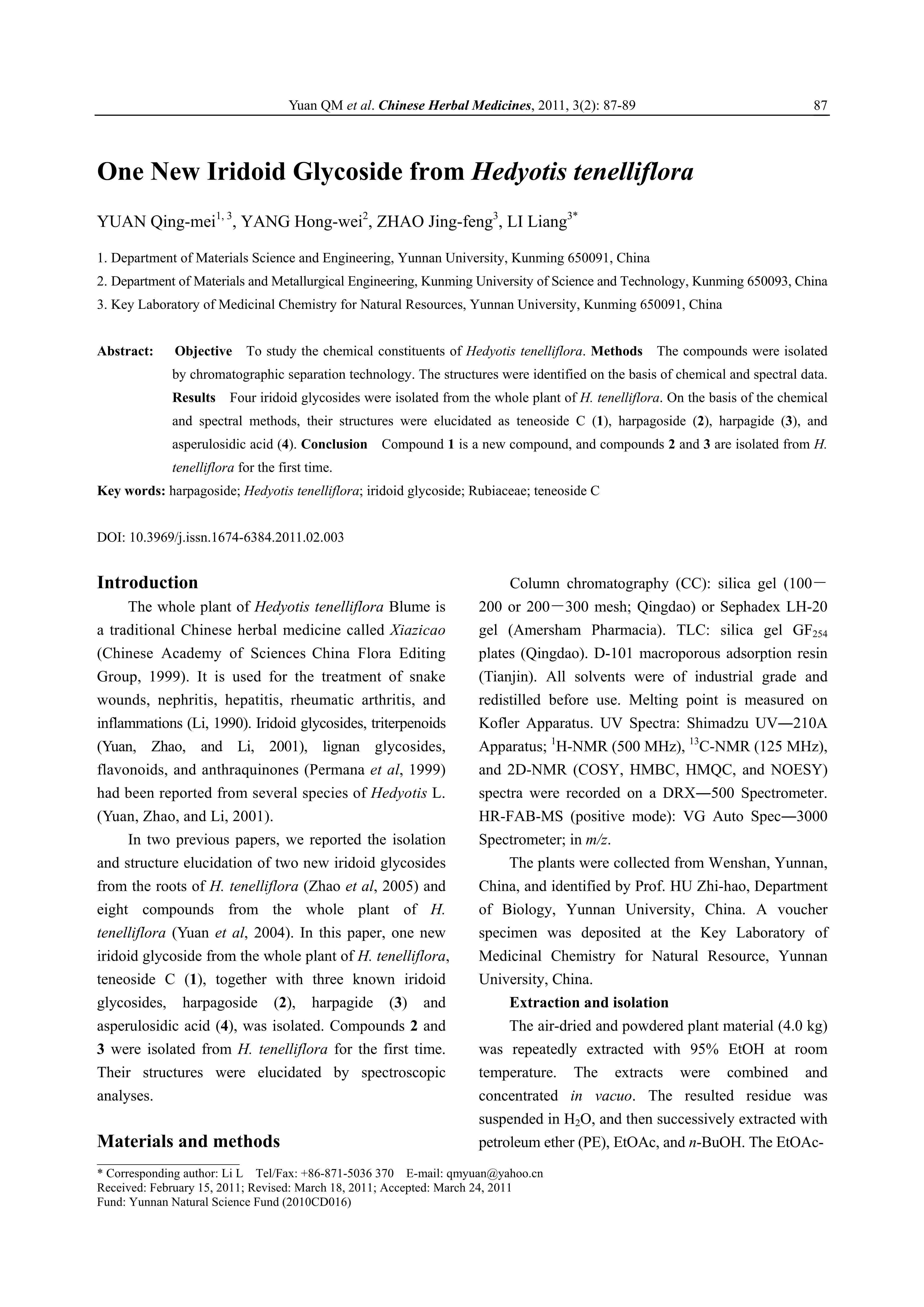 YUAN Qing-mei, YANG Hong-wei, ZHAO Jing-feng, LI Liang. One New Iridoid Glycoside from Hedyotis tenelliflora[J]. Chinese Herbal Medicines (CHM),2011,3(2):87-89