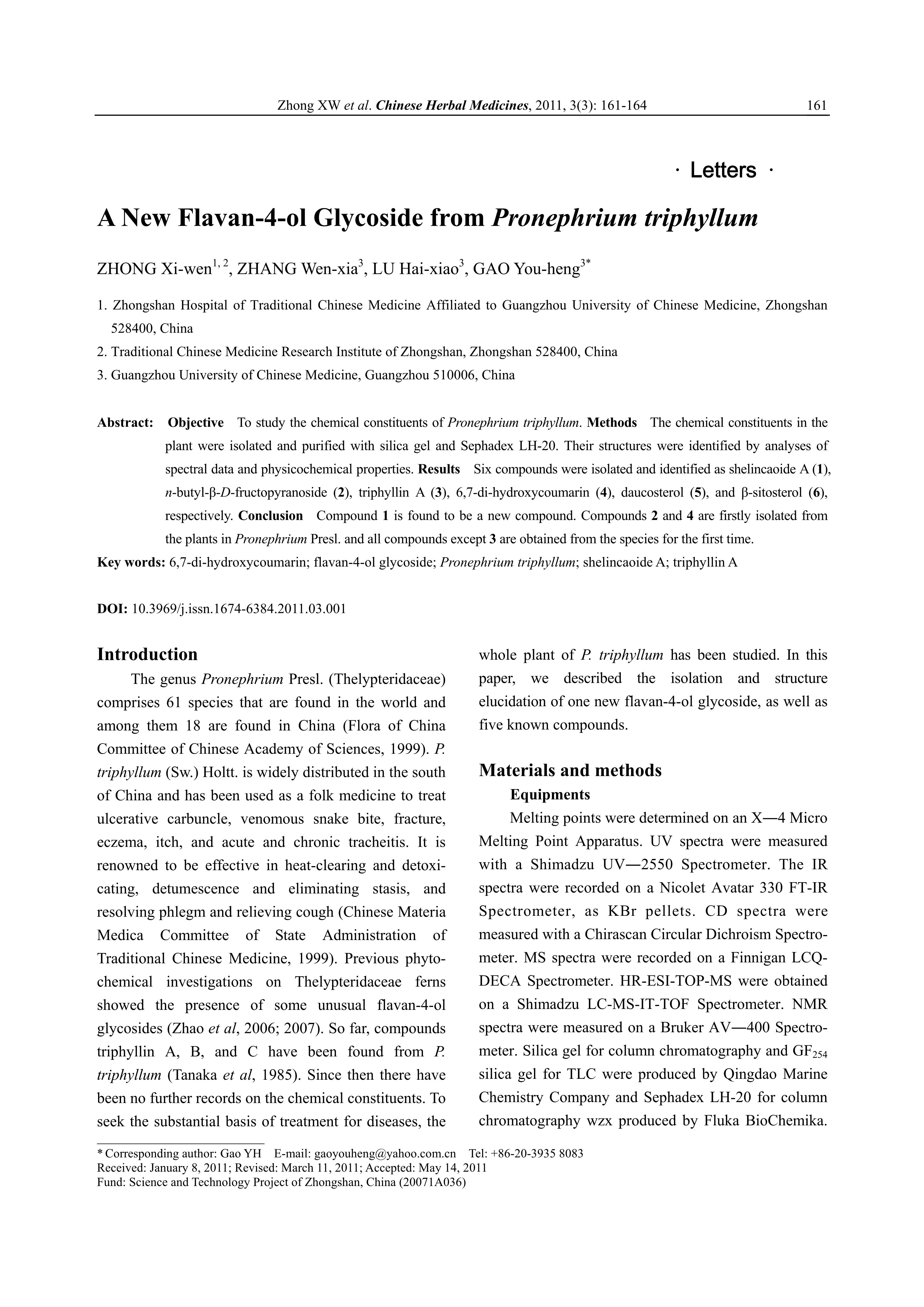 ZHONG Xi-wen, ZHANG Wen-xia, LU Hai-xiao, GAO You-heng. A New Flavan-4-ol Glycoside from Pronephrium triphyllum[J]. Chinese Herbal Medicines (CHM),2011,3(3):161-164