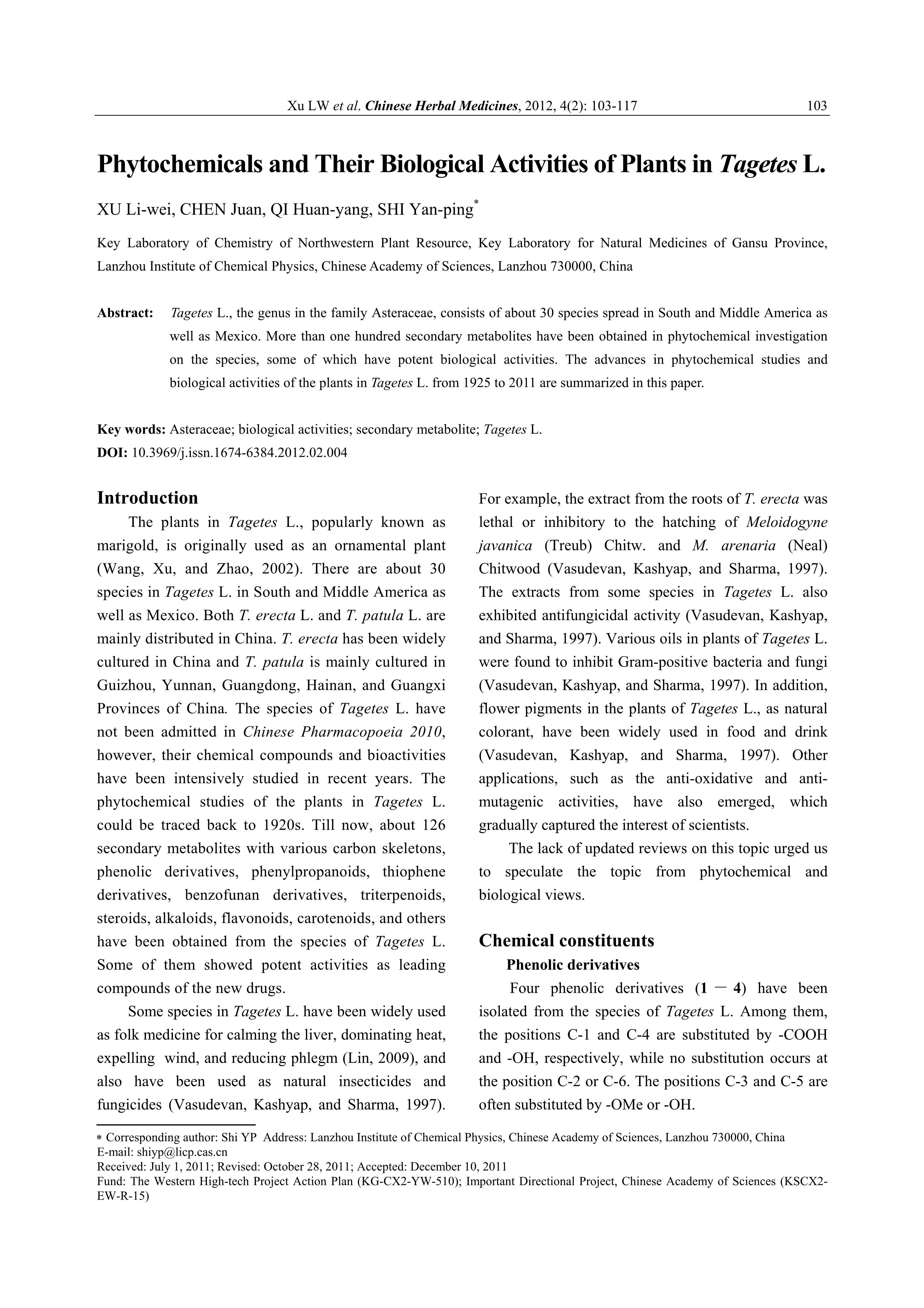 XU Li-wei, CHEN Juan, QI Huan-yang, SHI Yan-ping. Phytochemicals and Their Biological Activities of Plants in Tagetes L.[J]. Chinese Herbal Medicines (CHM),2012,4(2):103-117