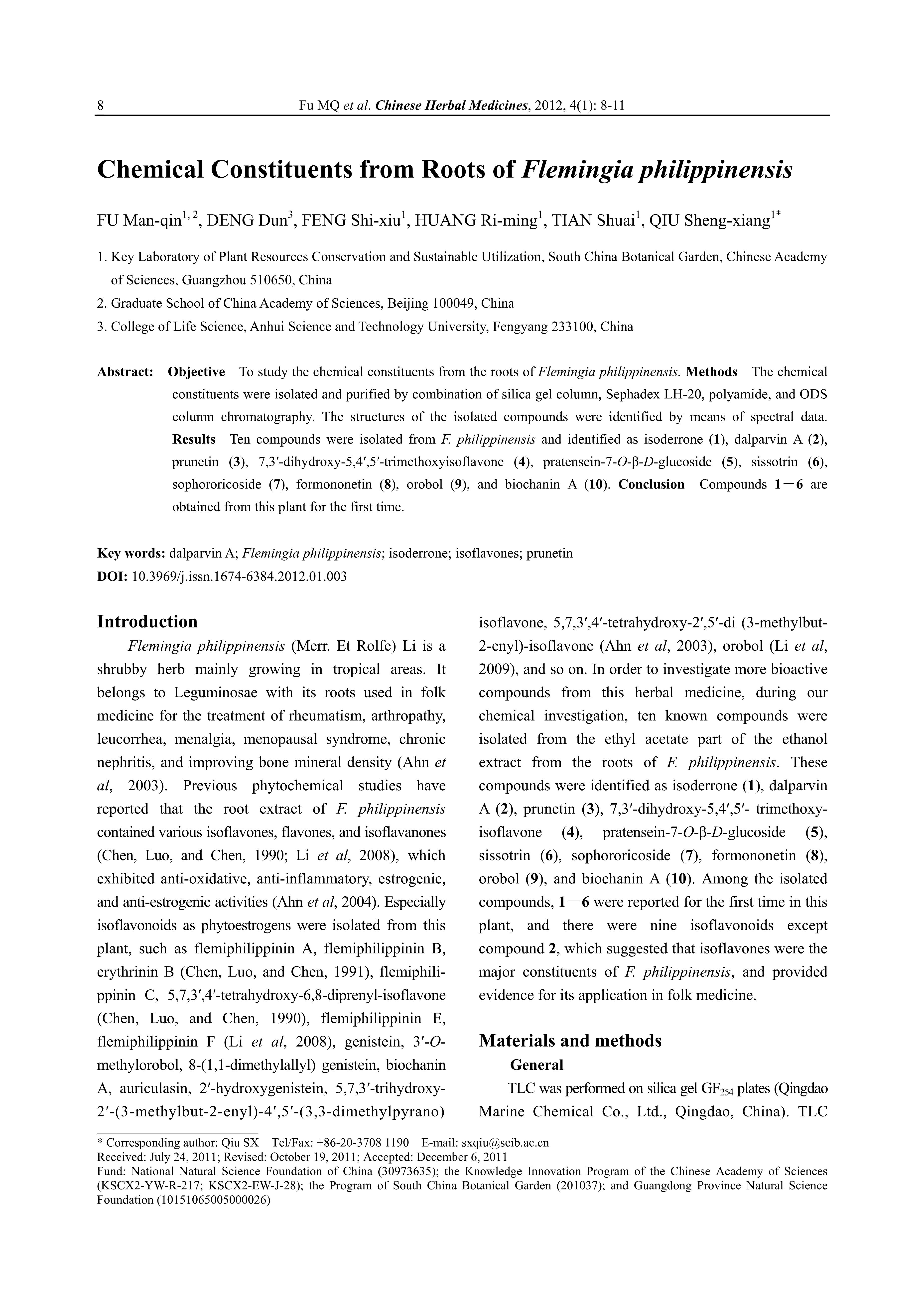 FU Man-qin, DENG Dun, FENG Shi-xiu, HUANG Ri-ming, TIAN Shuai, QIU Sheng-xiang. Chemical Constituents from Roots of Flemingia philippinensis[J]. Chinese Herbal Medicines (CHM),2012,4(1):8-11
