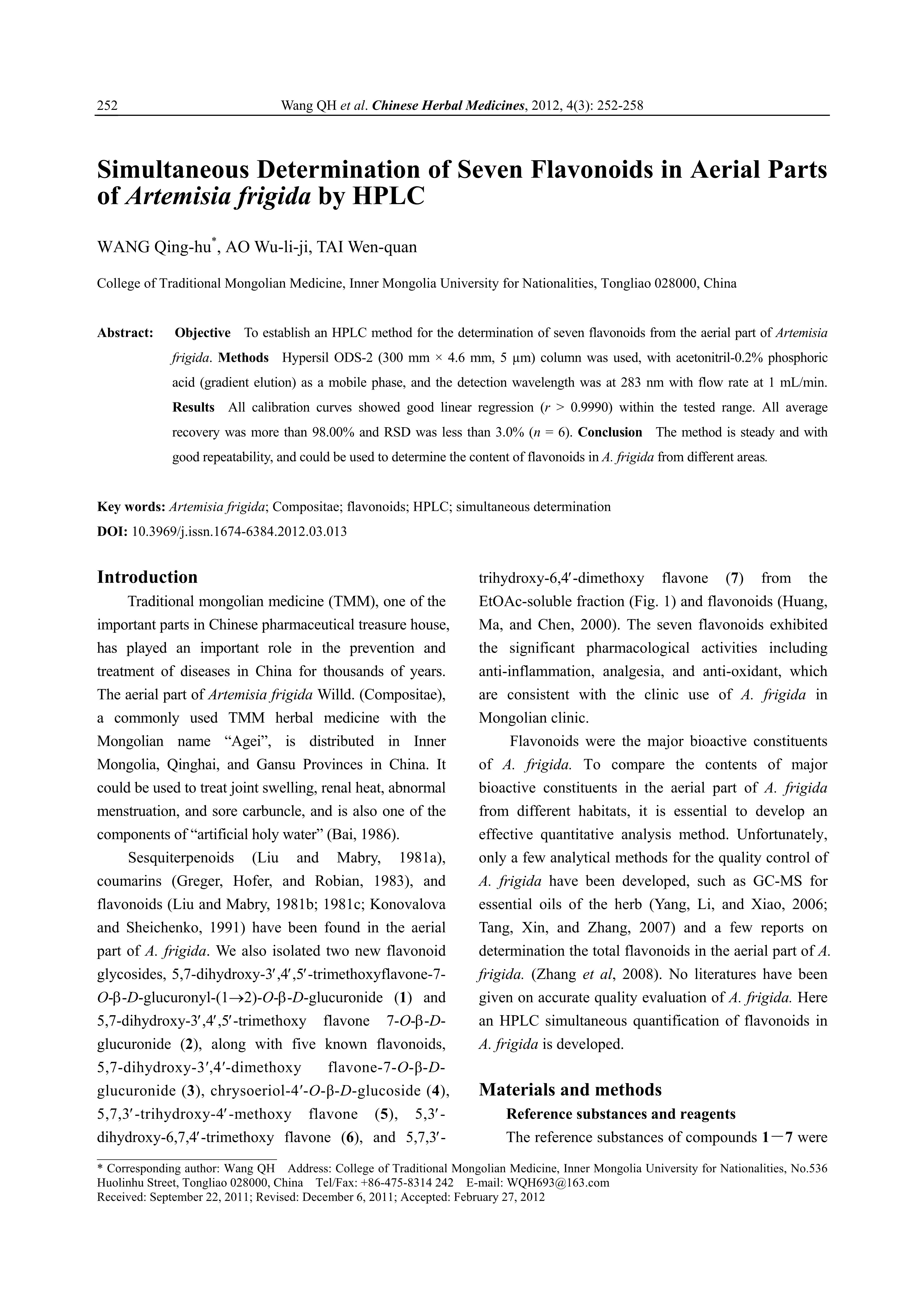 WANG Qing-hu, AO Wu-li-ji, TAI Wen-quan. Simultaneous Determination of Seven Flavonoids in Aerial Parts of Artemisia frigida by HPLC[J]. Chinese Herbal Medicines (CHM),2012,4(3):252-258