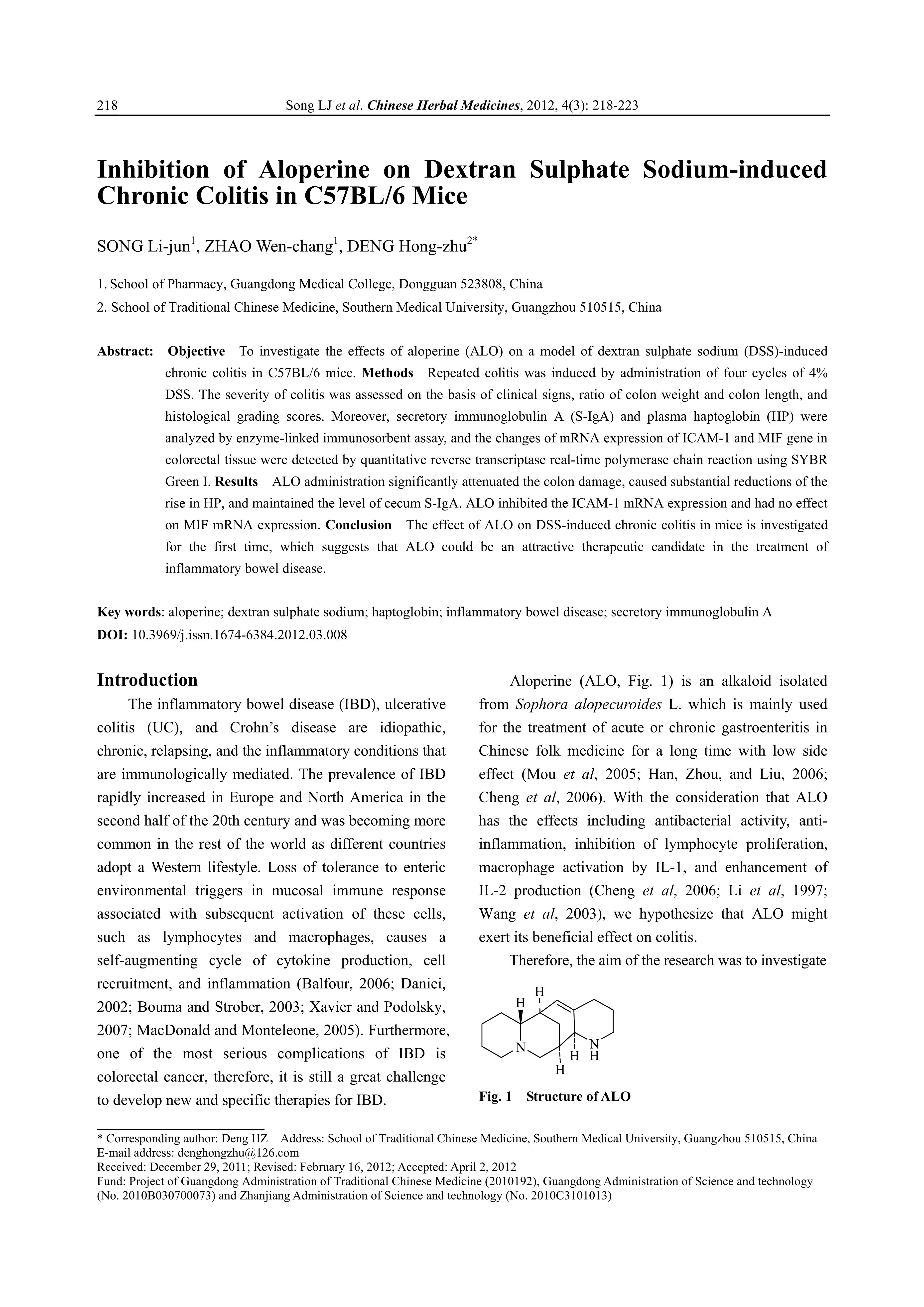 SONG Li-jun, ZHAO Wen-chang, DENG Hong-zhu. Inhibition of Aloperine on Dextran Sulphate Sodium-induced Chronic Colitis in C57BL/6 Mice[J]. Chinese Herbal Medicines (CHM),2012,4(3):218-223