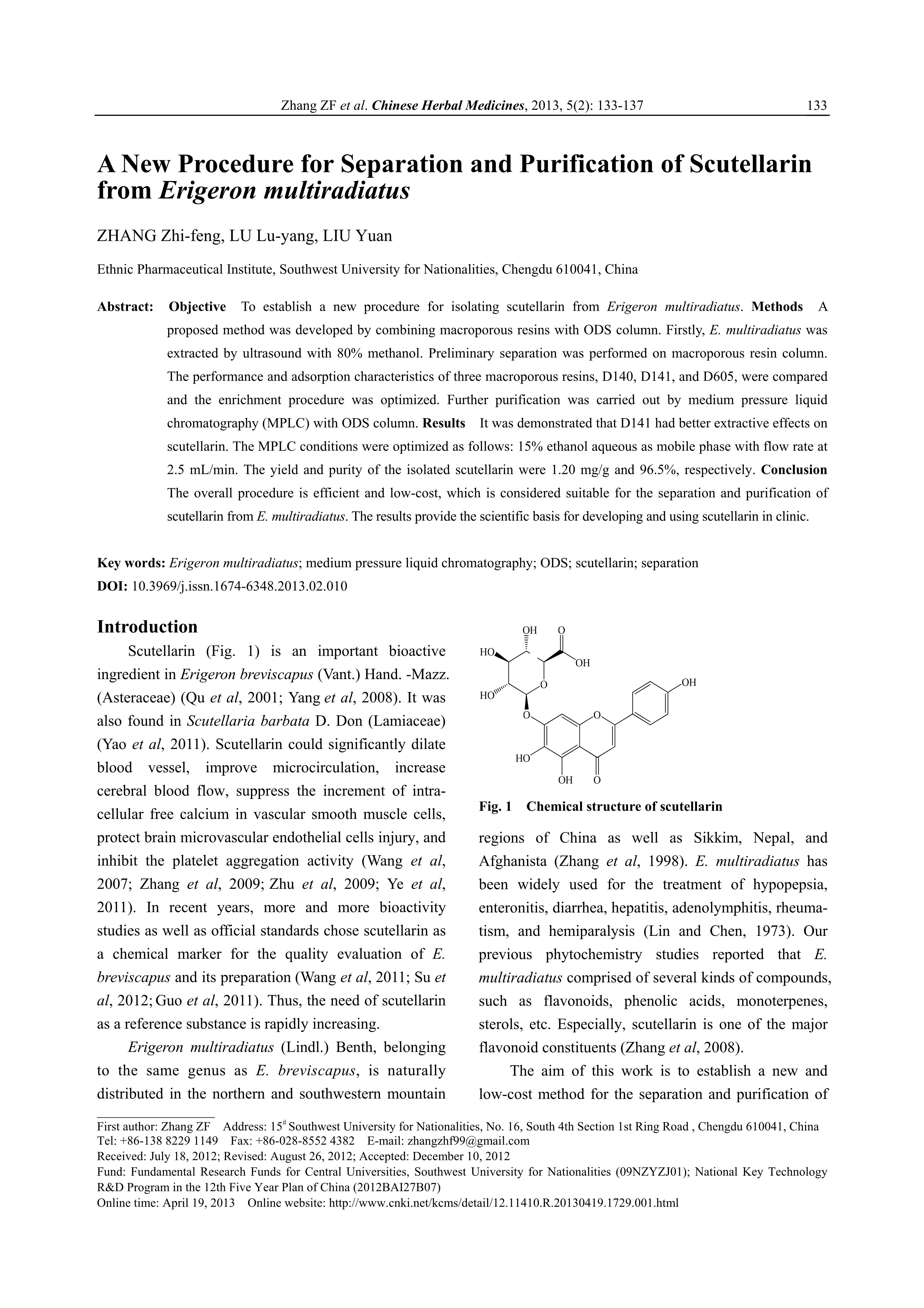 ZHANG Zhi-feng, LU Lu-yang, LIU Yuan. A New Procedure for Separation and Purification of Scutellarin from Erigeron multiradiatus[J]. Chinese Herbal Medicines (CHM),2013,5(2):133-137