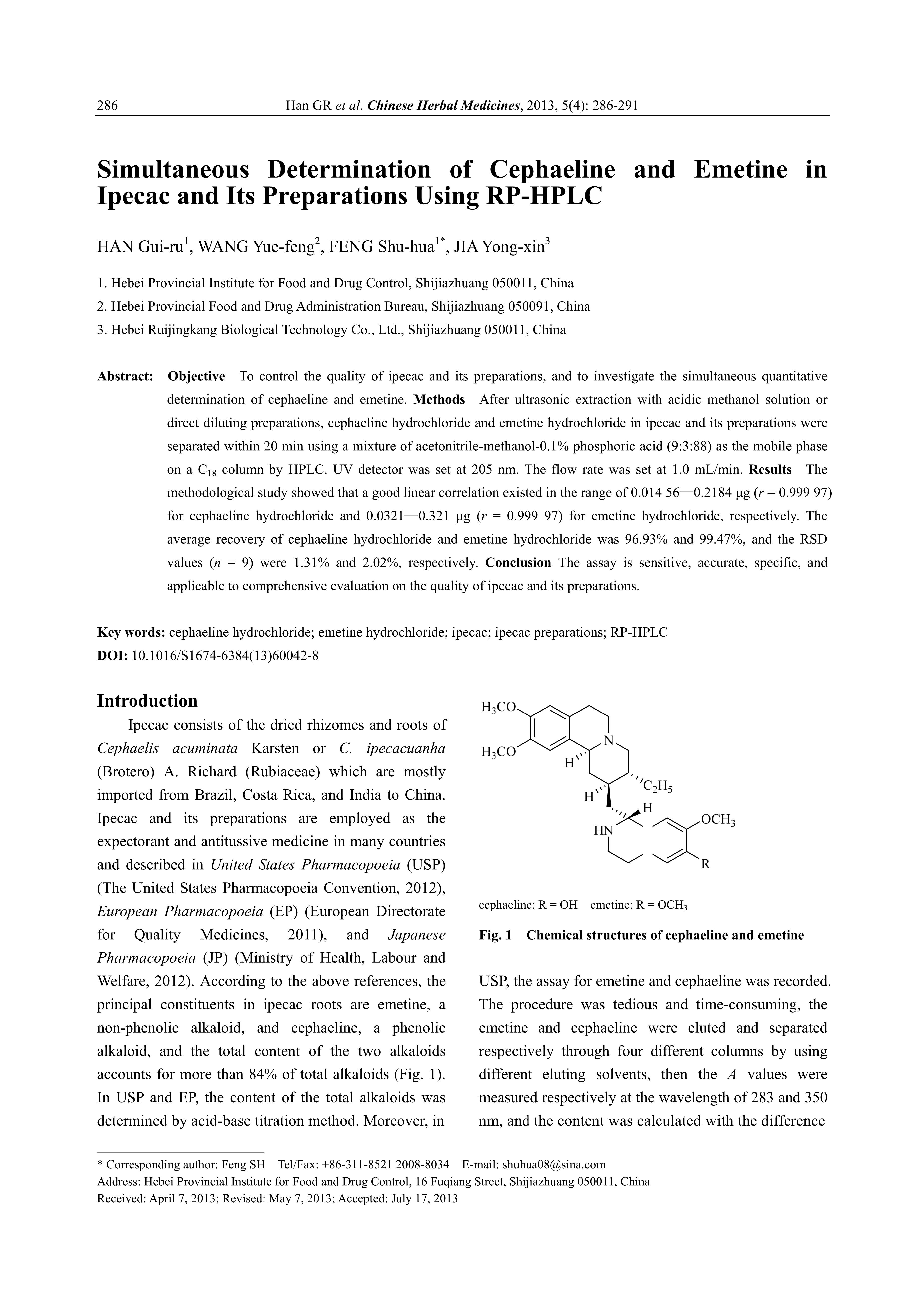 HAN Gui-ru, WANG Yue-feng, FENG Shu-hua, JIA Yong-xin. Simultaneous Determination of Cephaeline and Emetine in Ipecac and Its Preparations Using RP-HPLC[J]. Chinese Herbal Medicines (CHM),2013,5(4):286-291
