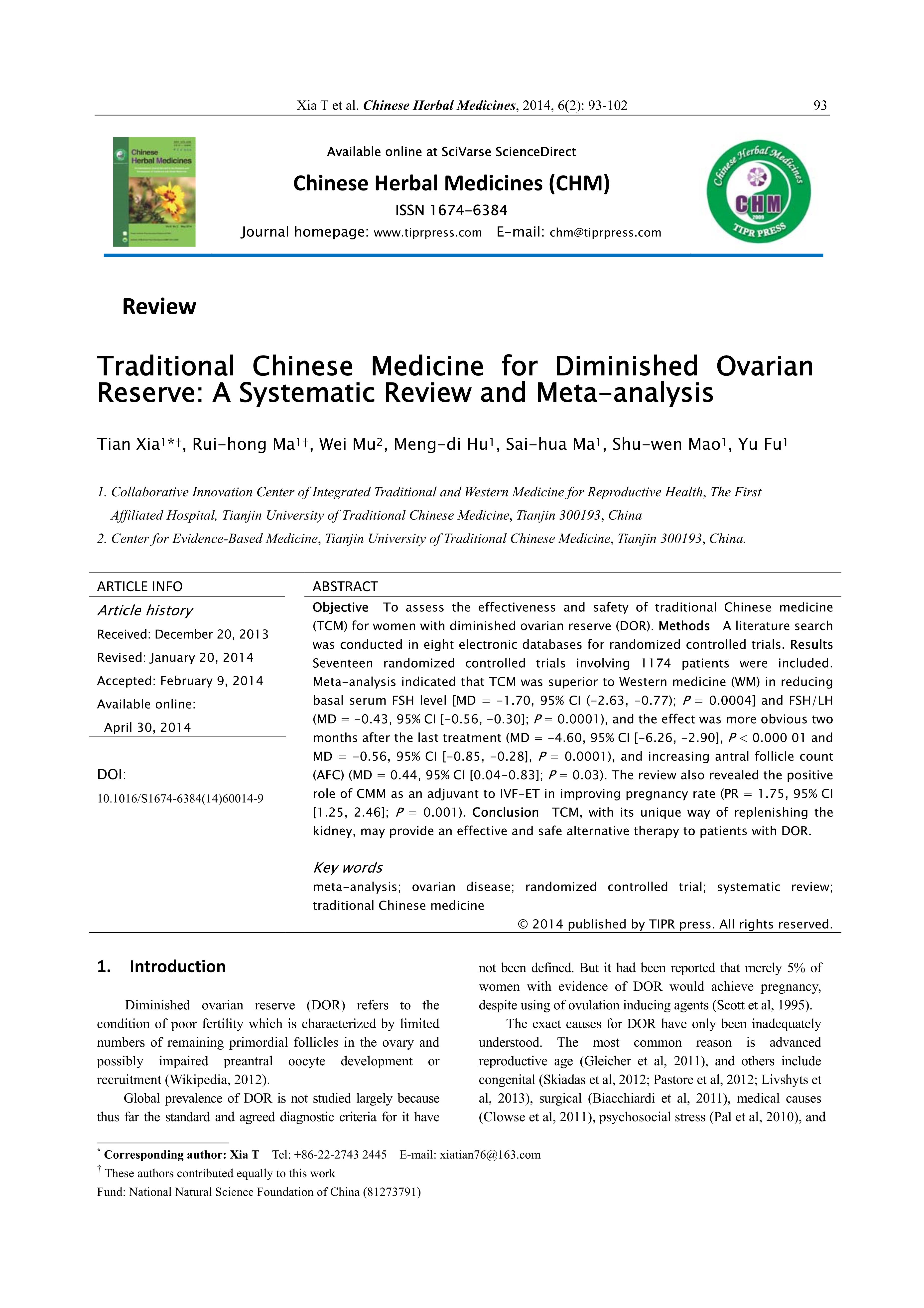 Tian Xia, Rui-hong Ma, Wei Mu, Meng-di Hu, Sai-hua Ma, Shu-wen Mao, Yu Fu. Traditional Chinese Medicine for Diminished Ovarian Reserve: A Systematic Review and Meta-analysis[J]. Chinese Herbal Medicines (CHM),2014,6(2):93-102