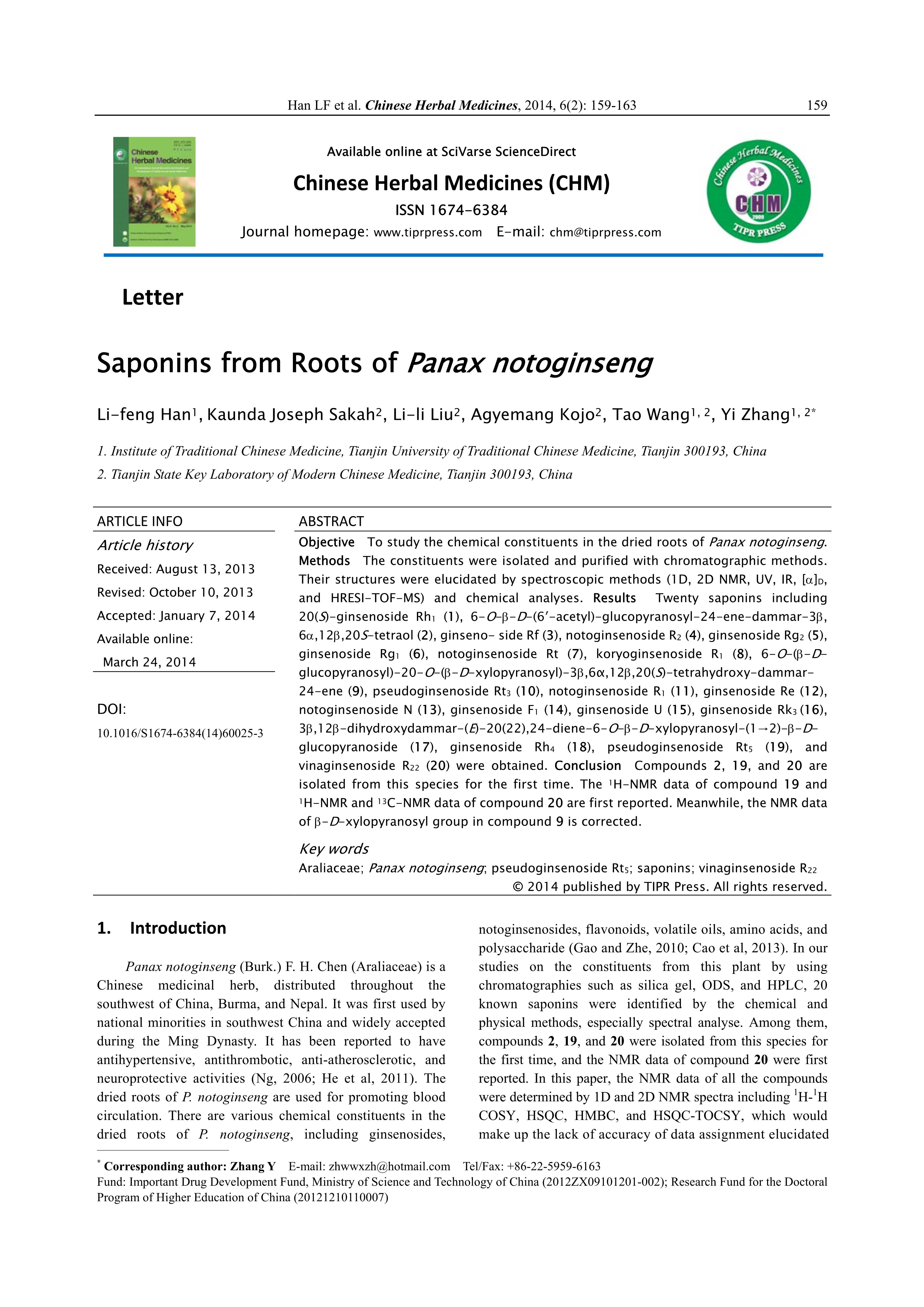 Li-feng Han, Kaunda Joseph Sakah, Li-li Liu, Agyemang Kojo, Tao Wang, Yi Zhang. Saponins from Roots of Panax notoginseng[J]. Chinese Herbal Medicines (CHM),2014,6(2):159-163