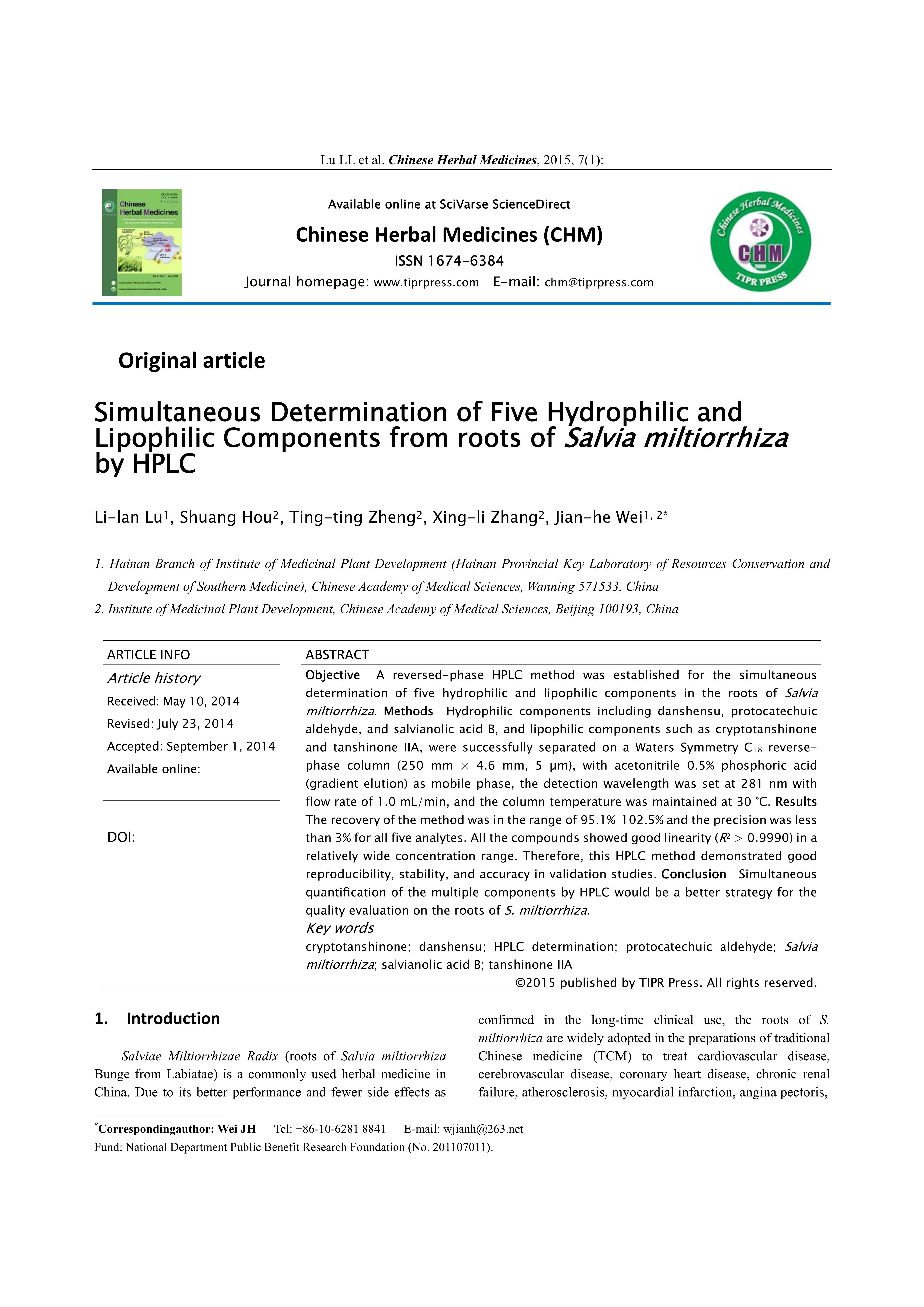 Li-lan Lu, Shuang Hou, Ting-ting Zheng, Xing-li Zhang, Jian-he Wei. Simultaneous Determination of Five Hydrophilic and Lipophilic Components from roots of Salvia miltiorrhiza by HPLC[J]. Chinese Herbal Medicines (CHM),2015,7():