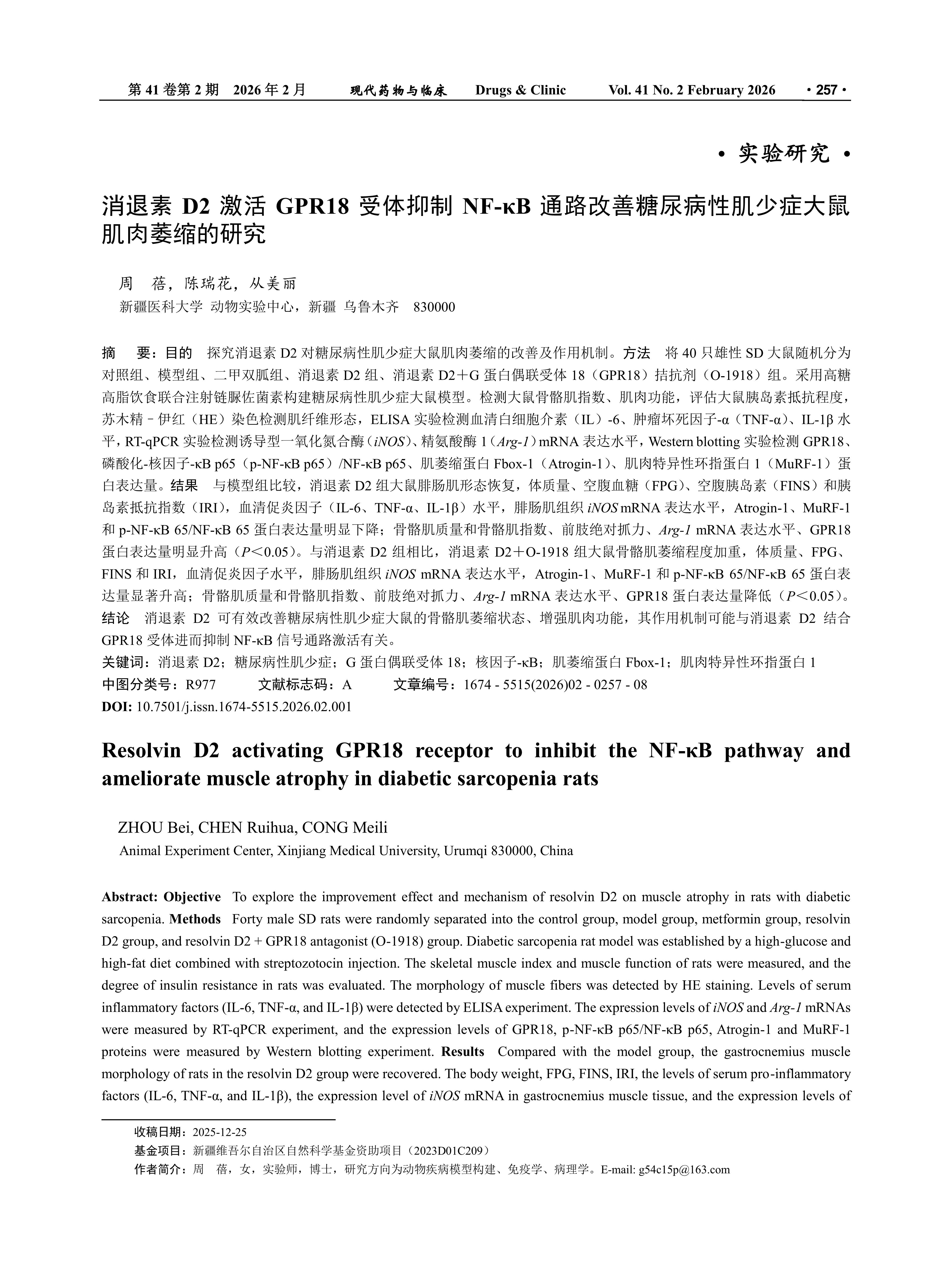 消退素D2激活GPR18受体抑制NF-κB通路改善糖尿病性肌少症大鼠肌肉萎缩的研究