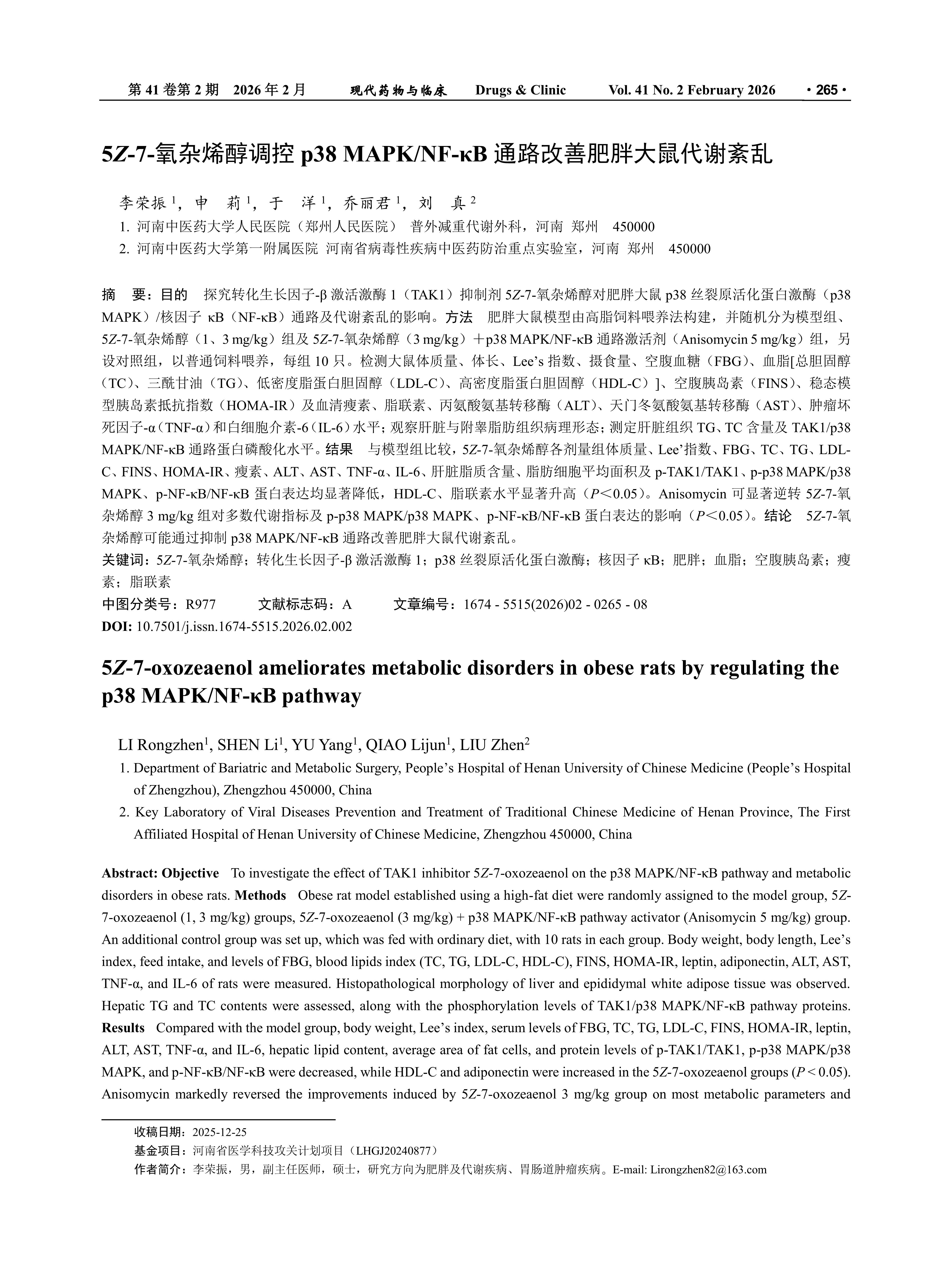 5Z-7-氧杂烯醇调控p38 MAPK/NF-κB通路改善肥胖大鼠代谢紊乱