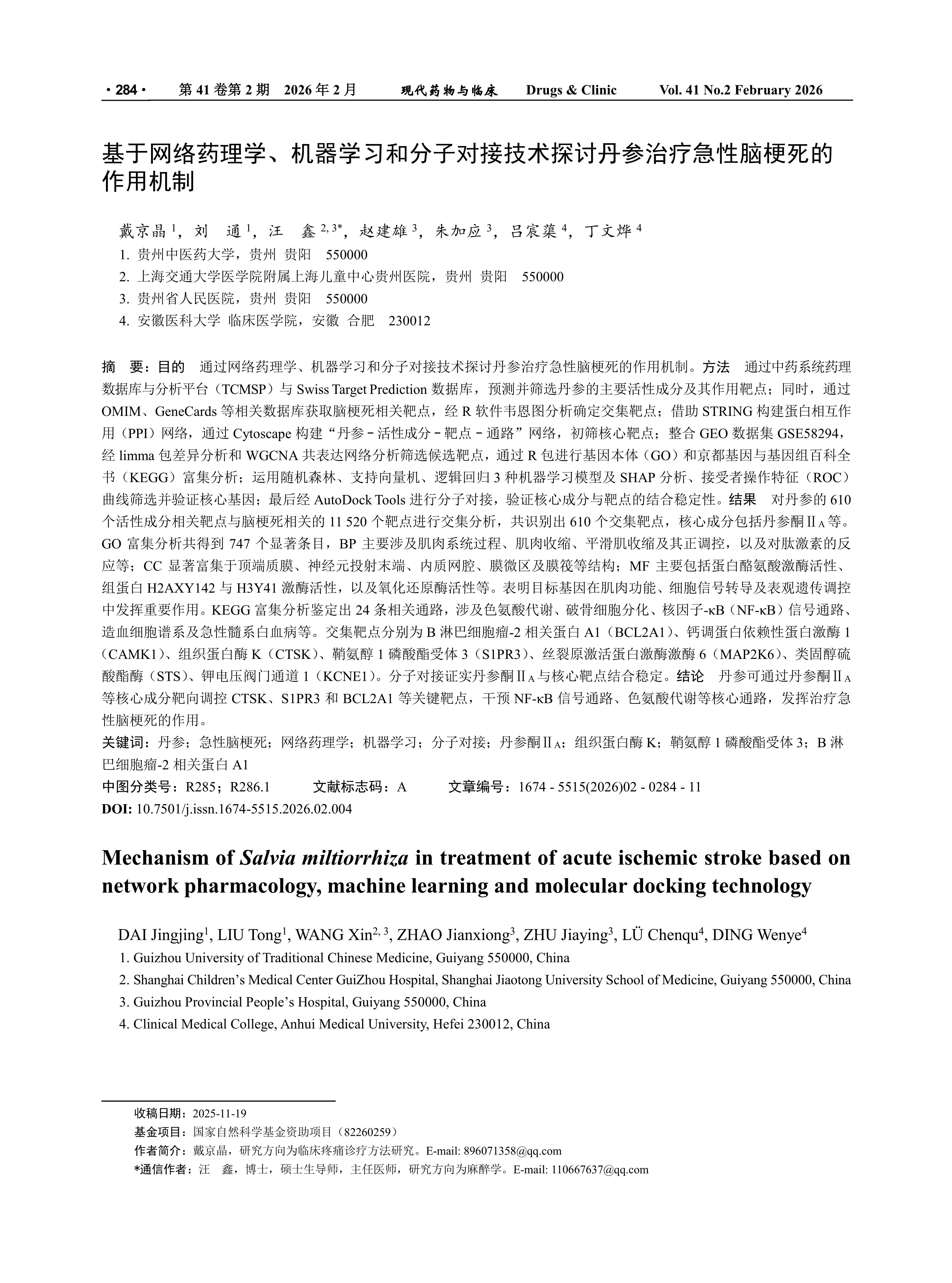 目的 通过网络药理学、机器学习和分子对接技术探讨丹参治疗急性脑梗死的作用机制。方法 通过中药系统药理数据库与分析平台(TCMSP)与Swiss Target Prediction数据库,预测并筛选丹参的主要活性成分及其作用靶点;同时,通过OMIM、GeneCards等相关数据库获取脑梗死相关靶点,经R软件韦恩图分析确定交集靶点;借助STRING构建蛋白相互作用(PPI)网络,通过Cytoscape构建“丹参-活性成分-靶点-通路”网络,初筛核心靶点;整合GEO数据集GSE58294,经limma包差异分析和WGCNA共表达网络分析筛选候选靶点,通过R包进行基因本体(GO)和京都基因与基因组百科全书(KEGG)富集分析;运用随机森林、支持向量机、逻辑回归3种机器学习模型及SHAP分析、接受者操作特征(ROC)曲线筛选并验证核心基因;最后经AutoDock Tools进行分子对接,验证核心成分与靶点的结合稳定性。结果 对丹参的610个活性成分相关靶点与脑梗死相关的11 520个靶点进行交集分析,共识别出610个交集靶点,核心成分包括丹参酮ⅡA等。GO富集分析共得到747个显著条目,BP主要涉及肌肉系统过程、肌肉收缩、平滑肌收缩及其正调控,以及对肽激素的反应等;CC显著富集于顶端质膜、神经元投射末端、内质网腔、膜微区及膜筏等结构;MF主要包括蛋白酪氨酸激酶活性、组蛋白H2AXY142与H3Y41激酶活性,以及氧化还原酶活性等。表明目标基因在肌肉功能、细胞信号转导及表观遗传调控中发挥重要作用。KEGG富集分析鉴定出24条相关通路,涉及色氨酸代谢、破骨细胞分化、核因子-κB(NF-κB)信号通路、造血细胞谱系及急性髓系白血病等。交集靶点分别为B淋巴细胞瘤-2相关蛋白A1(BCL2A1)、钙调蛋白依赖性蛋白激酶1(CAMK1)、组织蛋白酶K(CTSK)、鞘氨醇1磷酸酯受体3(S1PR3)、丝裂原激活蛋白激酶激酶6(MAP2K6)、类固醇硫酸酯酶(STS)、钾电压阀门通道1(KCNE1)。分子对接证实丹参酮ⅡA与核心靶点结合稳定。结论 丹参可通过丹参酮ⅡA等核心成分靶向调控CTSK、S1PR3和BCL2A1等关键靶点,干预NF-κB信号通路、色氨酸代谢等核心通路,发挥治疗急性脑梗死的作用。