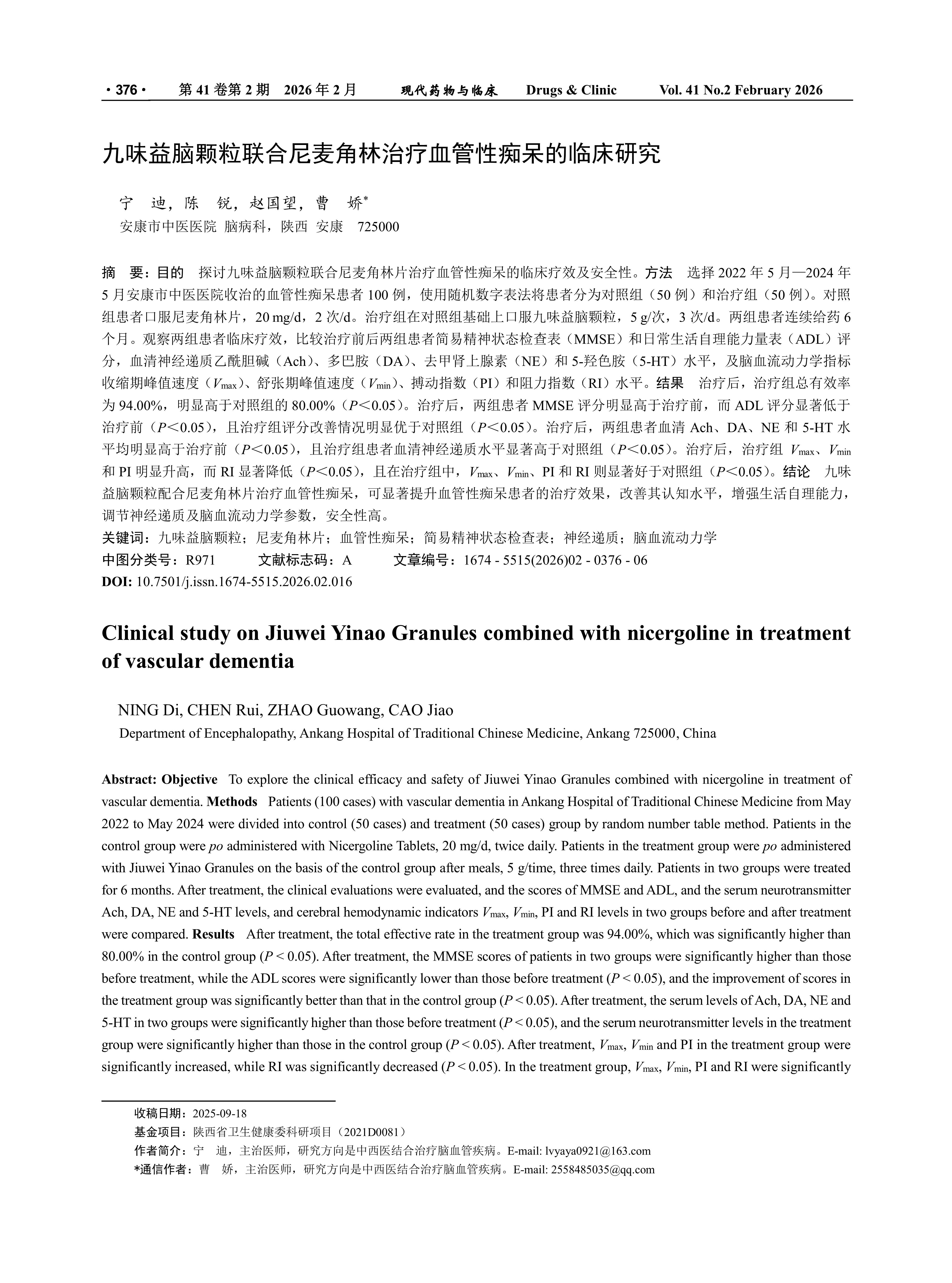 Objective To explore the clinical efficacy and safety of Jiuwei Yinao Granules combined with nicergoline in treatment of vascular dementia. Methods Patients (100 cases) with vascular dementia in Ankang Hospital of Traditional Chinese Medicine from May 2022 to May 2024 were divided into control (50 cases) and treatment (50 cases) group by random number table method. Patients in the control group were po administered with Nicergoline Tablets, 20 mg/d, twice daily. Patients in the treatment group were po administered with Jiuwei Yinao Granules on the basis of the control group after meals, 5 g/time, three times daily. Patients in two groups were treated for 6 months. After treatment, the clinical evaluations were evaluated, and the scores of MMSE and ADL, and the serum neurotransmitter Ach, DA, NE and 5-HT levels, and cerebral hemodynamic indicators Vmax, Vmin, PI and RI levels in two groups before and after treatment were compared. Results After treatment, the total effective rate in the treatment group was 94.00%, which was significantly higher than 80.00% in the control group (P < 0.05). After treatment, the MMSE scores of patients in two groups were significantly higher than those before treatment, while the ADL scores were significantly lower than those before treatment (P < 0.05), and the improvement of scores in the treatment group was significantly better than that in the control group (P < 0.05). After treatment, the serum levels of Ach, DA, NE and 5-HT in two groups were significantly higher than those before treatment (P < 0.05), and the serum neurotransmitter levels in the treatment group were significantly higher than those in the control group (P < 0.05). After treatment, Vmax, Vmin and PI in the treatment group were significantly increased, while RI was significantly decreased (P < 0.05). In the treatment group, Vmax, Vmin, PI and RI were significantly better than those in the control group (P < 0.05). Conclusion The combination of Jiuwei Yinao Granules and Nicergoline Tablets can significantly improve the clinical efficacy of vascular dementia patients, enhance their cognitive function, improve their self-care ability, regulate neurotransmitters and cerebral hemodynamic indicators, and has high safety.