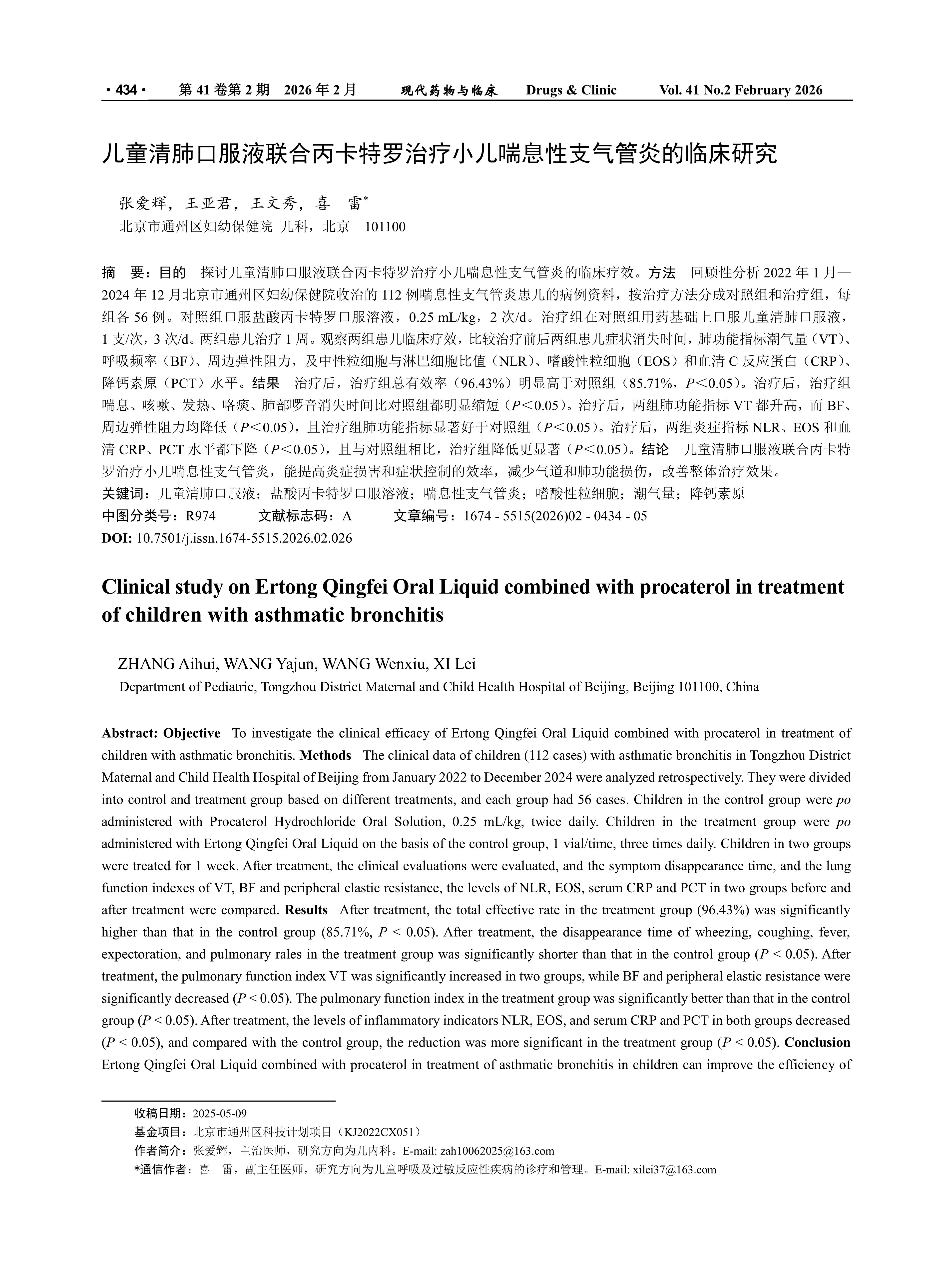 Objective To investigate the clinical efficacy of Ertong Qingfei Oral Liquid combined with procaterol in treatment of children with asthmatic bronchitis. Methods The clinical data of children (112 cases) with asthmatic bronchitis in Tongzhou District Maternal and Child Health Hospital of Beijing from January 2022 to December 2024 were analyzed retrospectively. They were divided into control and treatment group based on different treatments, and each group had 56 cases. Children in the control group were po administered with Procaterol Hydrochloride Oral Solution, 0.25 mL/kg, twice daily. Children in the treatment group were po administered with Ertong Qingfei Oral Liquid on the basis of the control group, 1 vial/time, three times daily. Children in two groups were treated for 1 week. After treatment, the clinical evaluations were evaluated, and the symptom disappearance time, and the lung function indexes of VT, BF and peripheral elastic resistance, the levels of NLR, EOS, serum CRP and PCT in two groups before and after treatment were compared. Results After treatment, the total effective rate in the treatment group (96.43%) was significantly higher than that in the control group (85.71%, P < 0.05). After treatment, the disappearance time of wheezing, coughing, fever, expectoration, and pulmonary rales in the treatment group was significantly shorter than that in the control group (P < 0.05). After treatment, the pulmonary function index VT was significantly increased in two groups, while BF and peripheral elastic resistance were significantly decreased (P < 0.05). The pulmonary function index in the treatment group was significantly better than that in the control group (P < 0.05). After treatment, the levels of inflammatory indicators NLR, EOS, and serum CRP and PCT in both groups decreased (P < 0.05), and compared with the control group, the reduction was more significant in the treatment group (P < 0.05). Conclusion Ertong Qingfei Oral Liquid combined with procaterol in treatment of asthmatic bronchitis in children can improve the efficiency of inflammation damage and symptom control, reduce airway and lung function damage, and promote the improvement of the overall treatment effect.