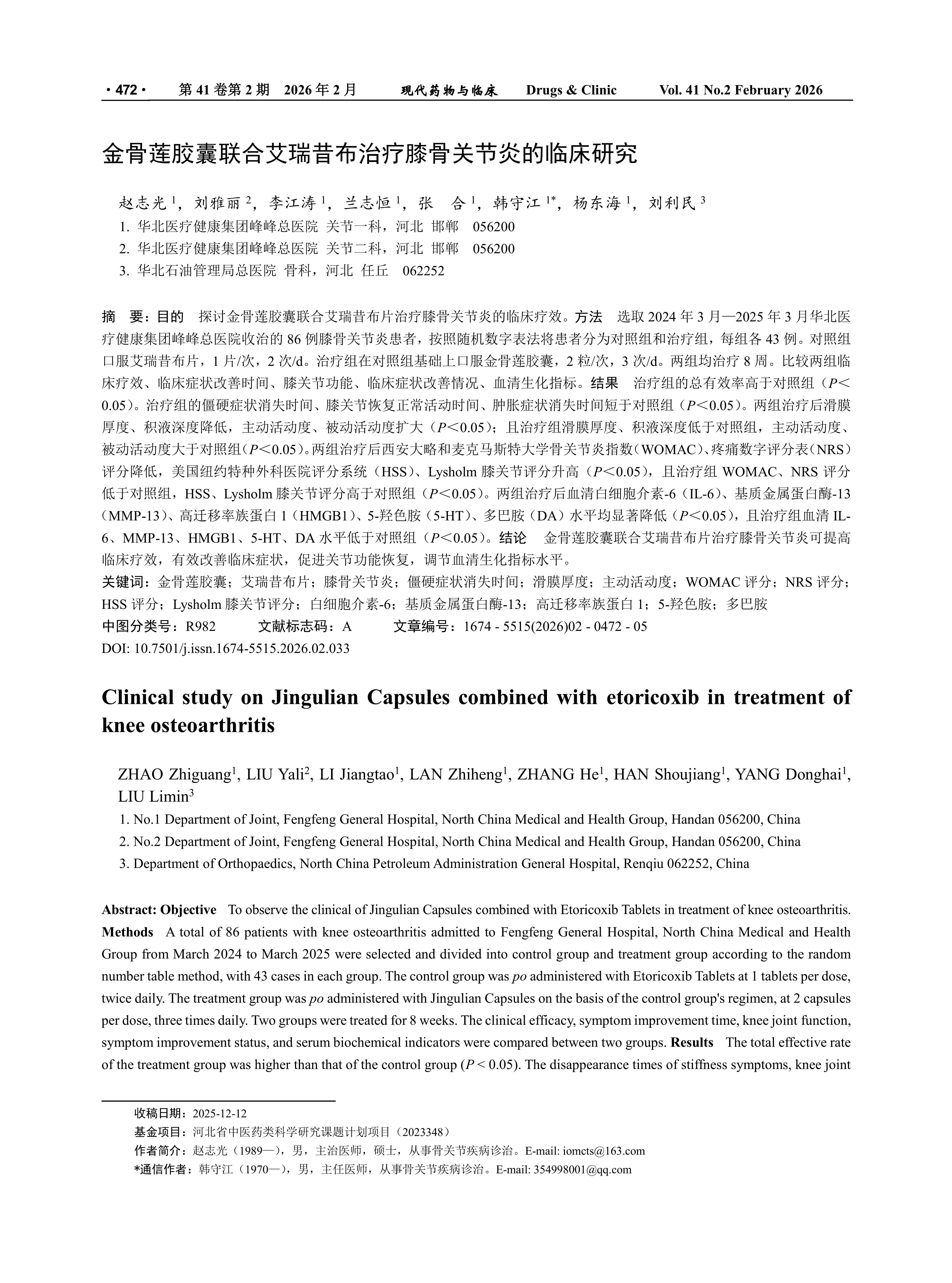 Objective To observe the clinical of Jingulian Capsules combined with Etoricoxib Tablets in treatment of knee osteoarthritis. Methods A total of 86 patients with knee osteoarthritis admitted to Fengfeng General Hospital, North China Medical and Health Group from March 2024 to March 2025 were selected and divided into control group and treatment group according to the random number table method, with 43 cases in each group. The control group was po administered with Etoricoxib Tablets at 1 tablets per dose, twice daily. The treatment group was po administered with Jingulian Capsules on the basis of the control group's regimen, at 2 capsules per dose, three times daily. Two groups were treated for 8 weeks. The clinical efficacy, symptom improvement time, knee joint function, symptom improvement status, and serum biochemical indicators were compared between two groups. Results The total effective rate of the treatment group was higher than that of the control group (P < 0.05). The disappearance times of stiffness symptoms, knee joint recovery time, and swelling symptoms in the treatment group were shorter than those in the control group (P < 0.05). After treatment, the synovium thickness and depth of fluid accumulation decreased in two groups, while the active and passive mobility increased (P < 0.05). And the synovial thickness and depth of fluid accumulation in the treatment group were lower than those in the control group, while the active and passive activity were higher than those in the control group (P < 0.05). After treatment, the Western Ontario and McMaster University Osteoarthritis Index (WOMAC) scale and Pain Numerical Rating Scale (NRS) decreased, while the New York Hospital for Special Surgery (HSS) and Lysholm knee joint scores increased (P < 0.05). The WOMAC and NRS scores of the treatment group were lower than those of the control group, while the HSS and Lysholm knee joint scores were higher than those of the control group (P < 0.05). After treatment, the serum levels of interleukin-6 (IL-6), matrix metalloproteinase-13 (MMP-13), high mobility group protein 1 (HMGB1), serotonin (5-HT), and dopamine (DA) were significantly reduced in two groups (P < 0.05), and the serum levels of IL-6, MMP-13, HMGB1, 5-HT, and DA in the treatment group were lower than those in the control group (P < 0.05). Conclusion The combination of Jingulian Capsules and Etoricoxib Tablets can improve clinical efficacy in treatment of knee osteoarthritis, effectively alleviate clinical symptoms, promote joint function recovery, and regulate serum biochemical indicators.