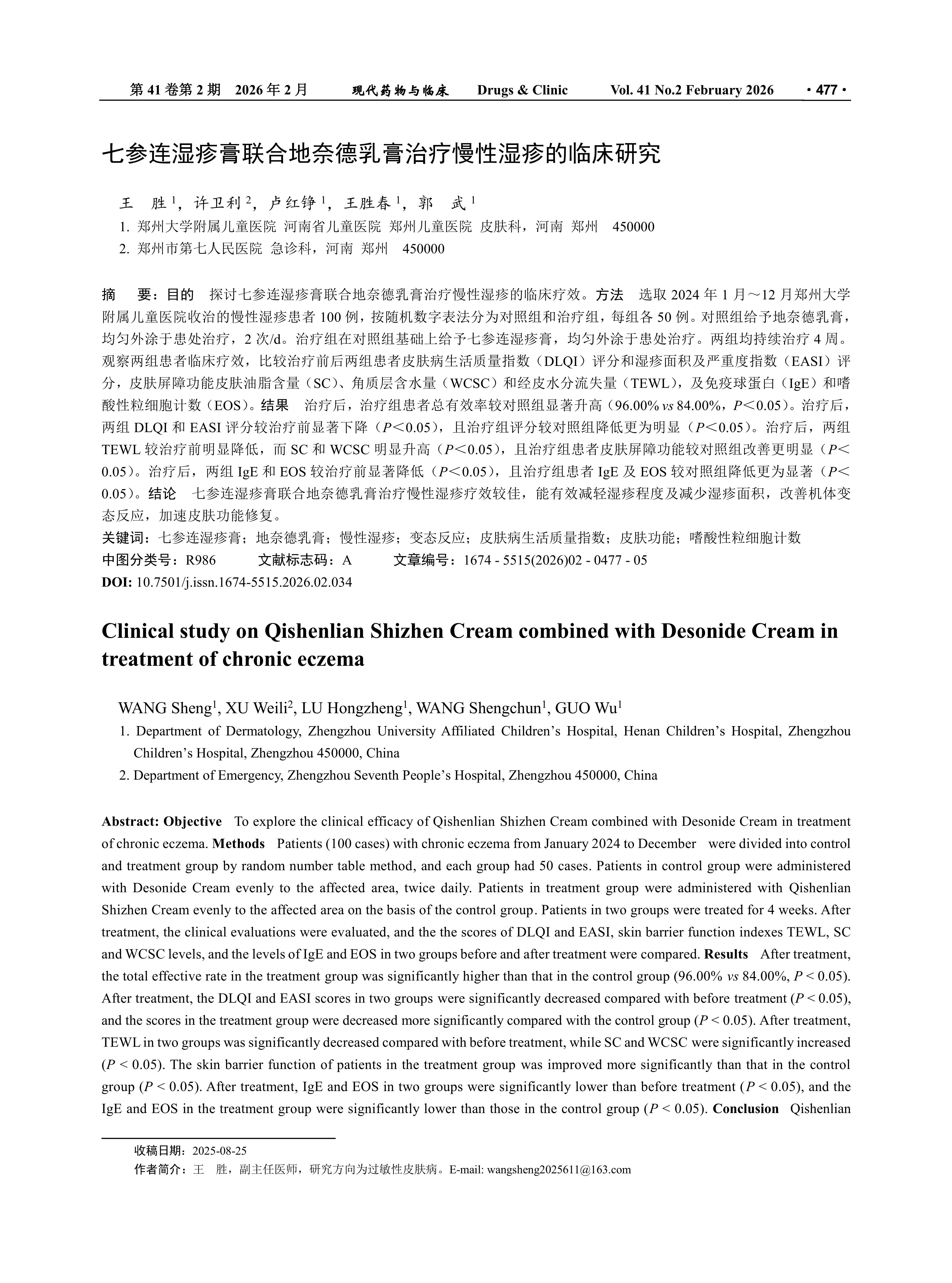 目的 探讨七参连湿疹膏联合地奈德乳膏治疗慢性湿疹的临床疗效。方法 选取2024年1月~12月郑州大学附属儿童医院收治的慢性湿疹患者100例,按随机数字表法分为对照组和治疗组,每组各50例。对照组给予地奈德乳膏,均匀外涂于患处治疗,2次/d。治疗组在对照组基础上给予七参连湿疹膏,均匀外涂于患处治疗。两组均持续治疗4周。观察两组患者临床疗效,比较治疗前后两组患者皮肤病生活质量指数(DLQI)评分和湿疹面积及严重度指数(EASI)评分,皮肤屏障功能皮肤油脂含量(SC)、角质层含水量(WCSC)和经皮水分流失量(TEWL),及免疫球蛋白(IgE)和嗜酸性粒细胞计数(EOS)。结果 治疗后,治疗组患者总有效率较对照组显著升高(96.00% vs 84.00%,P<0.05)。治疗后,两组DLQI和EASI评分较治疗前显著下降(P<0.05),且治疗组评分较对照组降低更为明显(P<0.05)。治疗后,两组TEWL较治疗前明显降低,而SC和WCSC明显升高(P<0.05),且治疗组患者皮肤屏障功能较对照组改善更明显(P<0.05)。治疗后,两组IgE和EOS较治疗前显著降低(P<0.05),且治疗组患者IgE及EOS较对照组降低更为显著(P<0.05)。结论 七参连湿疹膏联合地奈德乳膏治疗慢性湿疹疗效较佳,能有效减轻湿疹程度及减少湿疹面积,改善机体变态反应,加速皮肤功能修复。