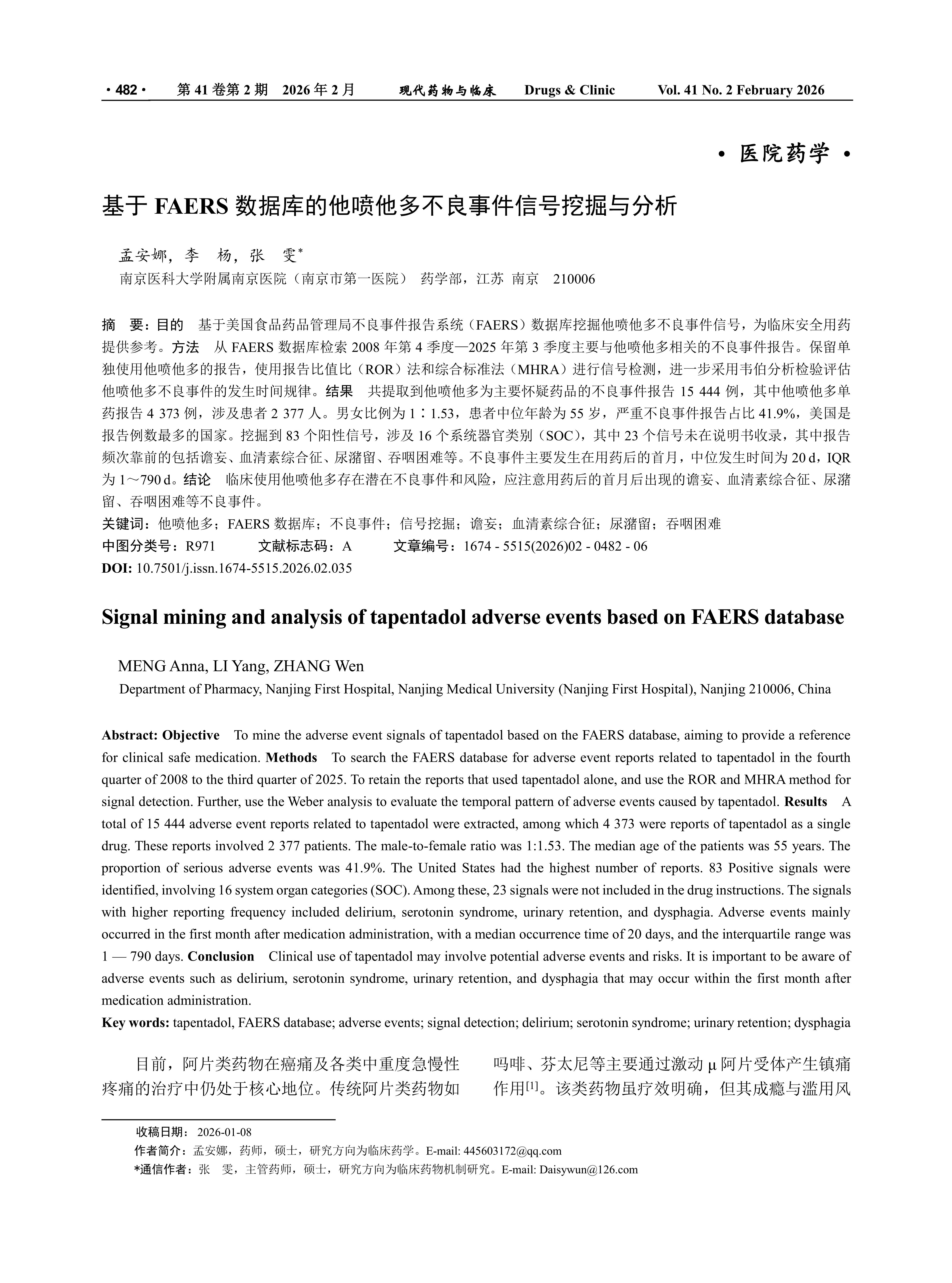 目的 基于美国食品药品管理局不良事件报告系统(FAERS)数据库挖掘他喷他多不良事件信号,为临床安全用药提供参考。方法 从FAERS数据库检索2008年第4季度—2025年第3季度主要与他喷他多相关的不良事件报告。保留单独使用他喷他多的报告,使用报告比值比(ROR)法和综合标准法(MHRA)进行信号检测,进一步采用韦伯分析检验评估他喷他多不良事件的发生时间规律。结果 共提取到他喷他多为主要怀疑药品的不良事件报告15 444例,其中他喷他多单药报告4 373例,涉及患者2 377人。男女比例为1∶1.53,患者中位年龄为55岁,严重不良事件报告占比41.9%,美国是报告例数最多的国家。挖掘到83个阳性信号,涉及16个系统器官类别(SOC),其中23个信号未在说明书收录,其中报告频次靠前的包括谵妄、血清素综合征、尿潴留、吞咽困难等。不良事件主要发生在用药后的首月,中位发生时间为20 d,IQR为1~790 d。结论 临床使用他喷他多存在潜在不良事件和风险,应注意用药后的首月后出现的谵妄、血清素综合征、尿潴留、吞咽困难等不良事件。