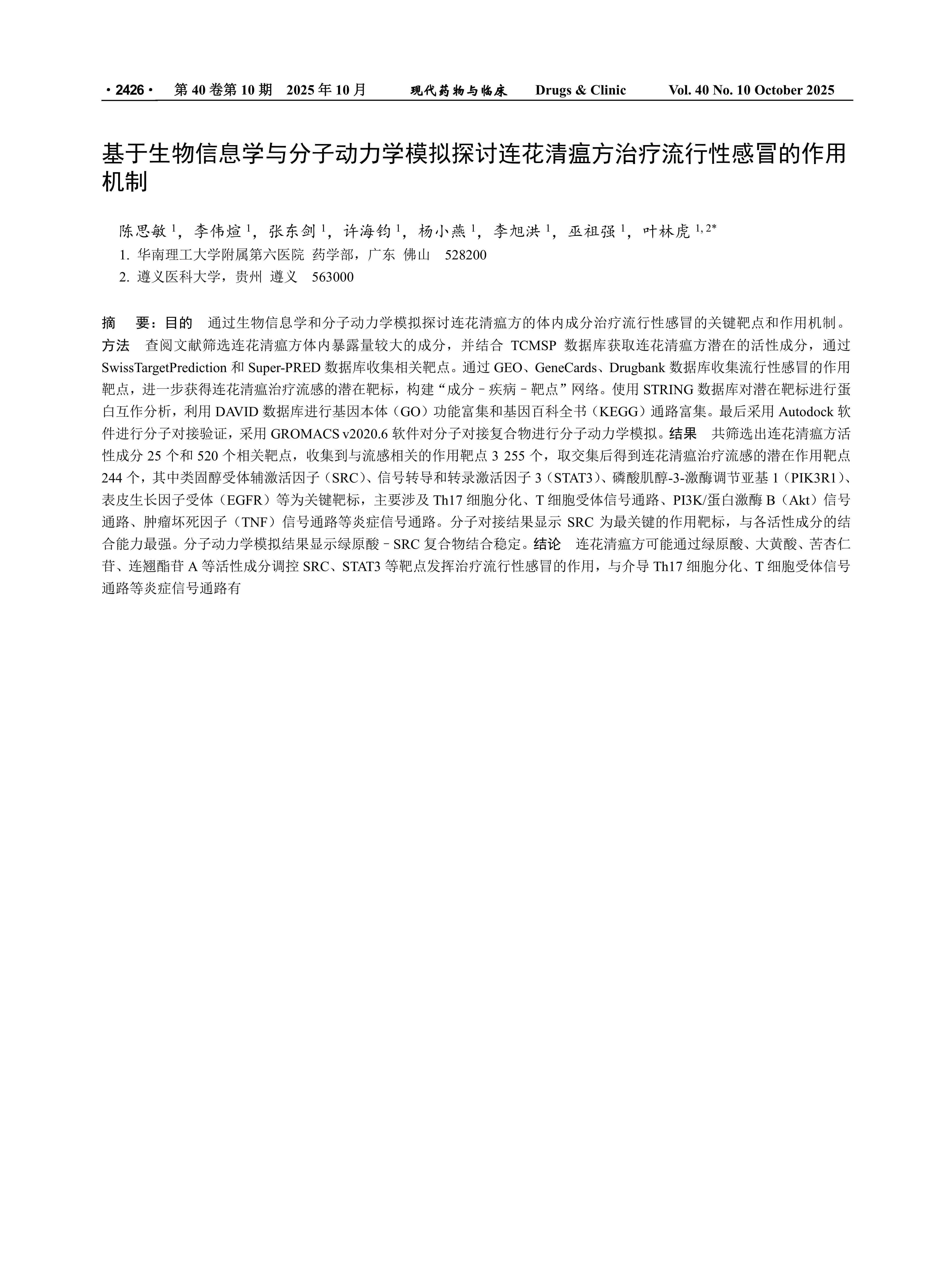 目的 通过生物信息学和分子动力学模拟探讨连花清瘟方的体内成分治疗流行性感冒的关键靶点和作用机制。方法 查阅文献筛选连花清瘟方体内暴露量较大的成分,并结合TCMSP数据库获取连花清瘟方潜在的活性成分,通过SwissTargetPrediction和Super-PRED数据库收集相关靶点。通过GEO、GeneCards、Drugbank数据库收集流行性感冒的作用靶点,进一步获得连花清瘟治疗流感的潜在靶标,构建“成分–疾病–靶点”网络。使用STRING数据库对潜在靶标进行蛋白互作分析,利用DAVID数据库进行基因本体(GO)功能富集和基因百科全书(KEGG)通路富集。最后采用Autodock软件进行分子对接验证,采用GROMACS v2020.6软件对分子对接复合物进行分子动力学模拟。结果 共筛选出连花清瘟方活性成分25个和520个相关靶点,收集到与流感相关的作用靶点3 255个,取交集后得到连花清瘟治疗流感的潜在作用靶点244个,其中类固醇受体辅激活因子(SRC)、信号转导和转录激活因子3(STAT3)、磷酸肌醇-3-激酶调节亚基1(PIK3R1)、表皮生长因子受体(EGFR)等为关键靶标,主要涉及Th17细胞分化、T细胞受体信号通路、PI3K/蛋白激酶B(Akt)信号通路、肿瘤坏死因子(TNF)信号通路等炎症信号通路。分子对接结果显示SRC为最关键的作用靶标,与各活性成分的结合能力最强。分子动力学模拟结果显示绿原酸–SRC复合物结合稳定。结论 连花清瘟方可能通过绿原酸、大黄酸、苦杏仁苷、连翘酯苷A等活性成分调控SRC、STAT3等靶点发挥治疗流行性感冒的作用,与介导Th17细胞分化、T细胞受体信号通路等炎症信号通路有关,为临床应用与研究提供理论基础。