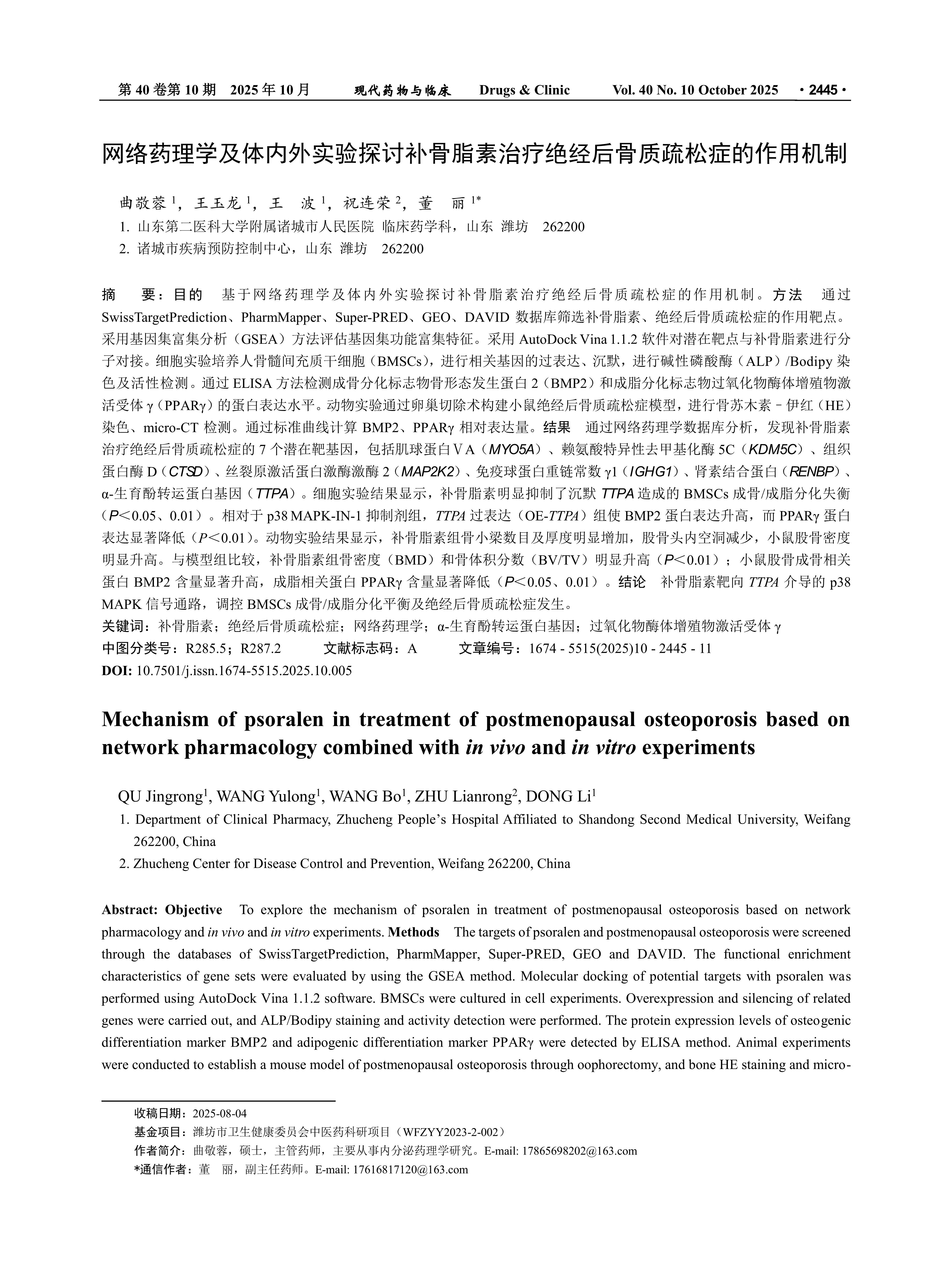 目的 基于网络药理学及体内外实验探讨补骨脂素治疗绝经后骨质疏松症的作用机制。方法 通过SwissTargetPrediction、PharmMapper、Super-PRED、GEO、DAVID数据库筛选补骨脂素、绝经后骨质疏松症的作用靶点。采用基因集富集分析(GSEA)方法评估基因集功能富集特征。采用AutoDock Vina 1.1.2软件对潜在靶点与补骨脂素进行分子对接。细胞实验培养人骨髓间充质干细胞(BMSCs),进行相关基因的过表达、沉默,进行碱性磷酸酶(ALP)/Bodipy染色及活性检测。通过ELISA方法检测成骨分化标志物骨形态发生蛋白2(BMP2)和成脂分化标志物过氧化物酶体增殖物激活受体γ(PPARγ)的蛋白表达水平。动物实验通过卵巢切除术构建小鼠绝经后骨质疏松症模型,进行骨苏木素–伊红(HE)染色、micro-CT检测。通过标准曲线计算BMP2、PPARγ相对表达量。结果 通过网络药理学数据库分析,发现补骨脂素治疗绝经后骨质疏松症的7个潜在靶基因,包括肌球蛋白ⅤA(MYO5A)、赖氨酸特异性去甲基化酶5C(KDM5C)、组织蛋白酶D(CTSD)、丝裂原激活蛋白激酶激酶2(MAP2K2)、免疫球蛋白重链常数γ1(IGHG1)、肾素结合蛋白(RENBP)、α-生育酚转运蛋白基因(TTPA)。细胞实验结果显示,补骨脂素明显抑制了沉默TTPA造成的BMSCs成骨/成脂分化失衡(P<0.05、0.01)。相对于p38 MAPK-IN-1抑制剂组,TTPA过表达(OE-TTPA)组使BMP2蛋白表达升高,而PPARγ蛋白表达显著降低(P<0.01)。动物实验结果显示,补骨脂素组骨小梁数目及厚度明显增加,股骨头内空洞减少,小鼠股骨密度明显升高。与模型组比较,补骨脂素组骨密度(BMD)和骨体积分数(BV/TV)明显升高(P<0.01);小鼠股骨成骨相关蛋白BMP2含量显著升高,成脂相关蛋白PPARγ含量显著降低(P<0.05、0.01)。结论 补骨脂素靶向TTPA介导的p38 MAPK信号通路,调控BMSCs成骨/成脂分化平衡及绝经后骨质疏松症发生。