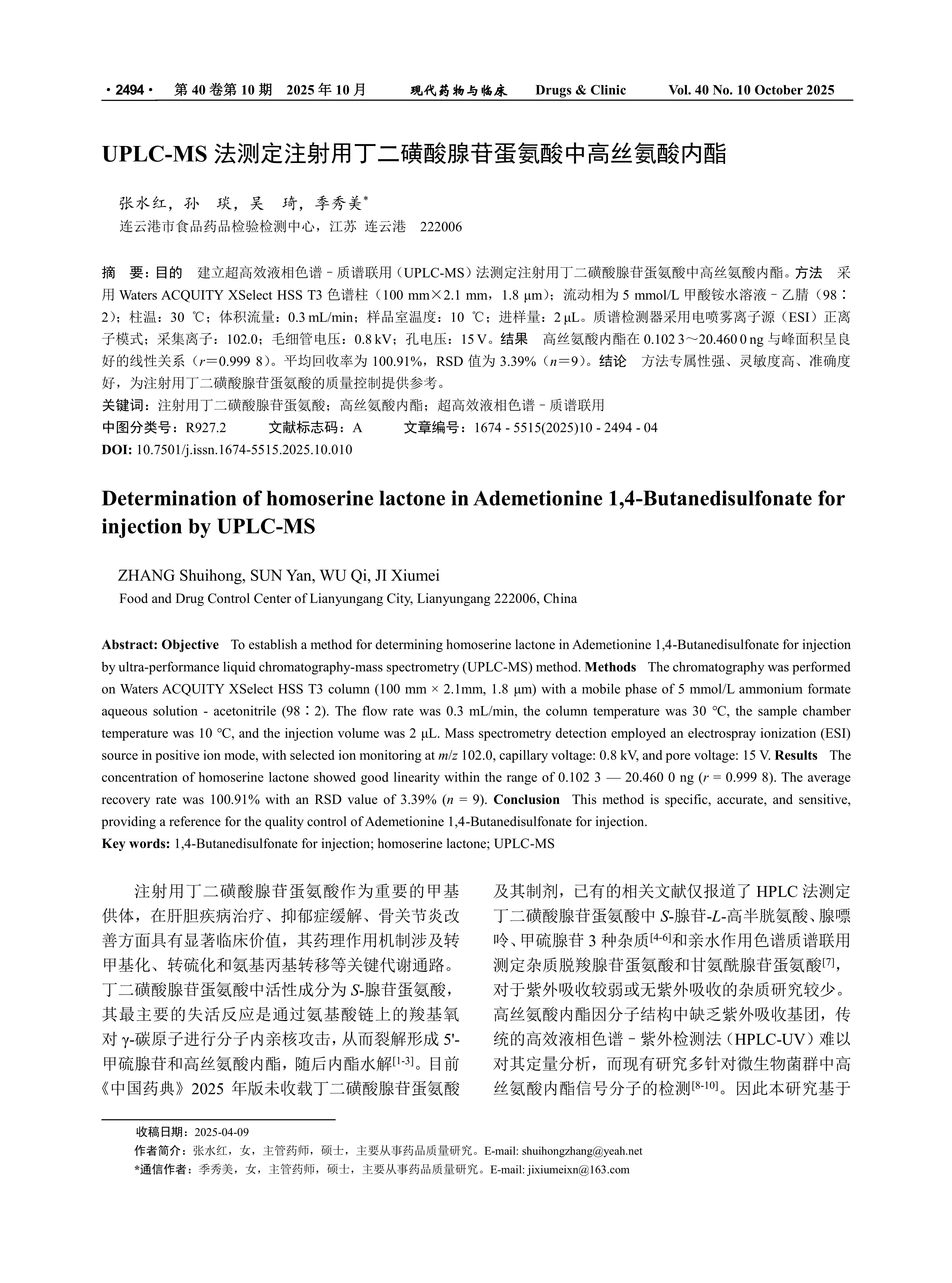 Objective To establish a method for determining homoserine lactone in Ademetionine 1,4-Butanedisulfonate for injection by ultra-performance liquid chromatography-mass spectrometry (UPLC-MS) method. Methods The chromatography was performed on Waters ACQUITY XSelect HSS T3 column (100 mm × 2.1mm, 1.8 μm) with a mobile phase of 5 mmol/L ammonium formate aqueous solution - acetonitrile (98∶2). The flow rate was 0.3 mL/min, the column temperature was 30 ℃, the sample chamber temperature was 10 ℃, and the injection volume was 2 μL. Mass spectrometry detection employed an electrospray ionization (ESI) source in positive ion mode, with selected ion monitoring at m/z 102.0, capillary voltage: 0.8 kV, and pore voltage: 15 V. Results The concentration of homoserine lactone showed good linearity within the range of 0.102 3 — 20.460 0 ng (r = 0.999 8). The average recovery rate was 100.91% with an RSD value of 3.39% (n = 9). Conclusion This method is specific, accurate, and sensitive, providing a reference for the quality control of Ademetionine 1,4-Butanedisulfonate for injection.
