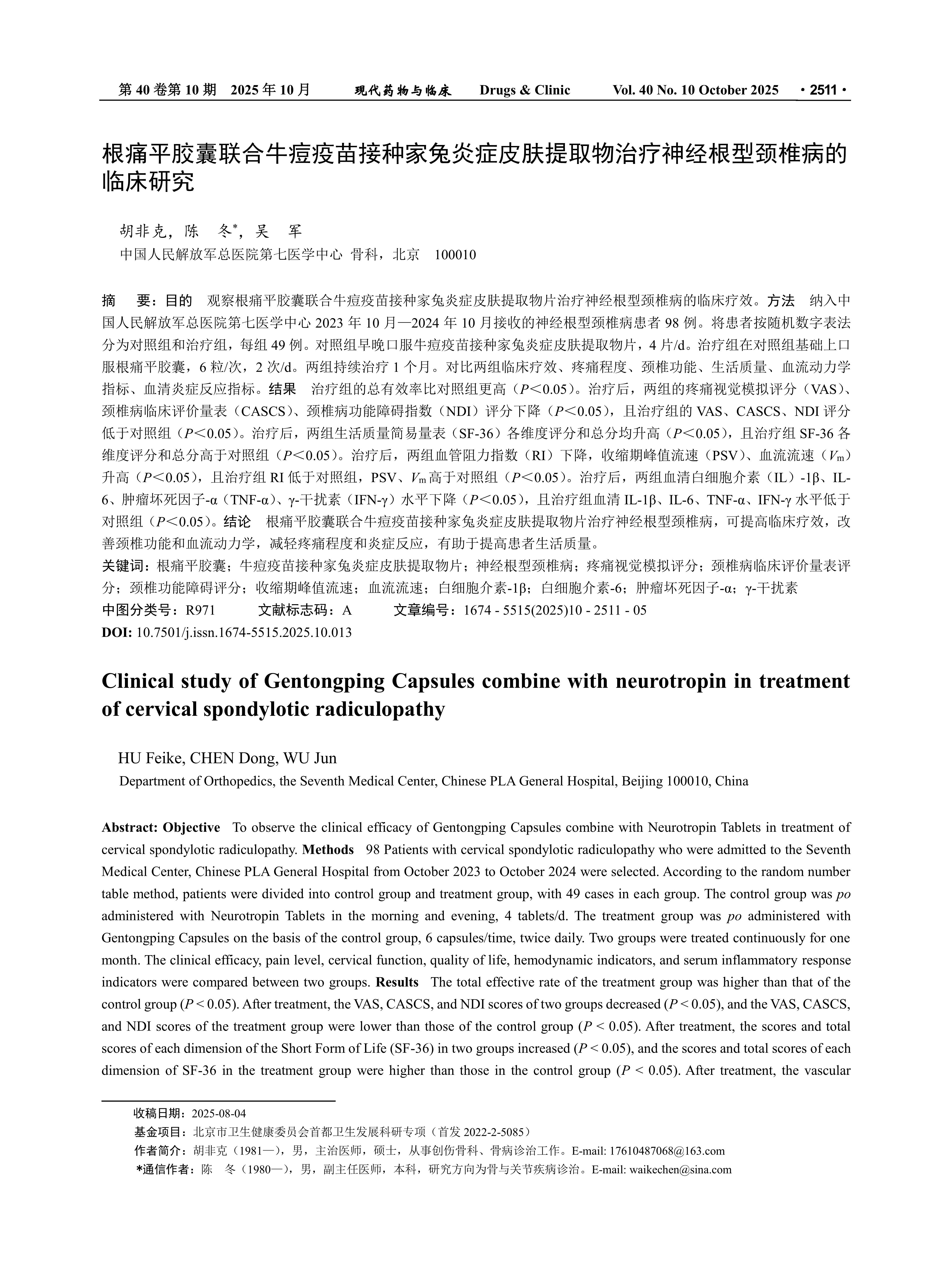 Objective To observe the clinical efficacy of Gentongping Capsules combine with Neurotropin Tablets in treatment of cervical spondylotic radiculopathy. Methods 98 Patients with cervical spondylotic radiculopathy who were admitted to the Seventh Medical Center, Chinese PLA General Hospital from October 2023 to October 2024 were selected. According to the random number table method, patients were divided into control group and treatment group, with 49 cases in each group. The control group was po administered with Neurotropin Tablets in the morning and evening, 4 tablets/d. The treatment group was po administered with Gentongping Capsules on the basis of the control group, 6 capsules/time, twice daily. Two groups were treated continuously for one month. The clinical efficacy, pain level, cervical function, quality of life, hemodynamic indicators, and serum inflammatory response indicators were compared between two groups. Results The total effective rate of the treatment group was higher than that of the control group (P < 0.05). After treatment, the VAS, CASCS, and NDI scores of two groups decreased (P < 0.05), and the VAS, CASCS, and NDI scores of the treatment group were lower than those of the control group (P< 0.05). After treatment, the scores and total scores of each dimension of the Short Form of Life (SF-36) in two groups increased (P < 0.05), and the scores and total scores of each dimension of SF-36 in the treatment group were higher than those in the control group (P < 0.05). After treatment, the vascular resistance index (RI) of two groups decreased, while the peak systolic velocity (PSV) and blood flow velocity (Vm) increased (P < 0.05). The RI of the treatment group was lower than that of the control group, while the PSV and Vm were higher than those of the control group (P < 0.05). After treatment, the serum levels of interleukin (IL)-1β, IL-6, tumor necrosis factor-α (TNF-α), and interferon-γ (IFN-γ) decreased in two groups (P < 0.05), and the serum levels of IL-1β, IL-6, TNF-α, and IFN-γ in the treatment group were lower than those in the control group (P < 0.05). Conclusion The combination of Gentongping Capsules and Neurotropin Tablets can improve clinical efficacy, enhance cervical function and hemodynamics, alleviate pain and inflammatory reactions, and contribute to improve the quality of life of patients with cervical spondylotic radiculopathy.