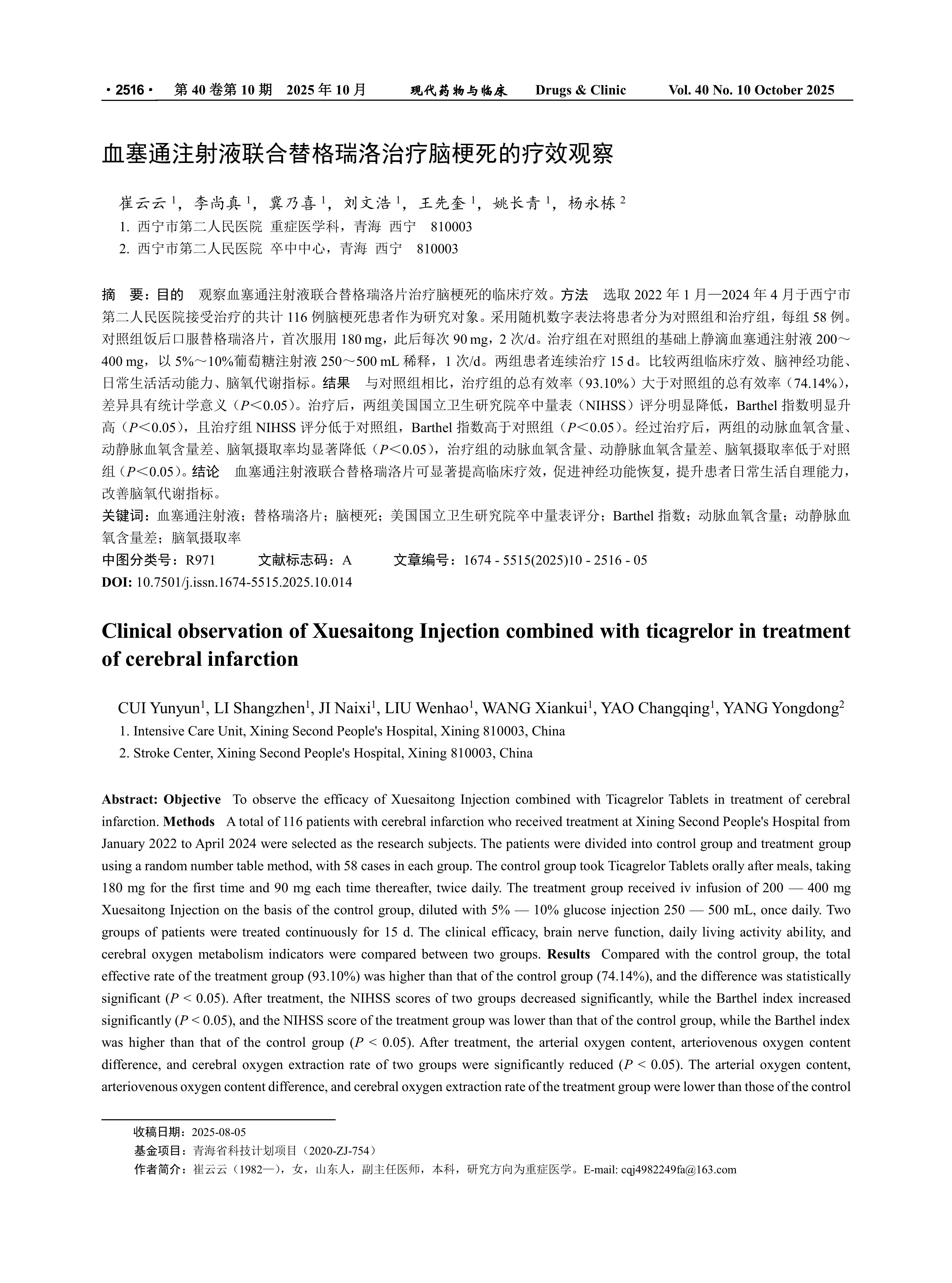 Objective To observe the efficacy of Xuesaitong Injection combined with Ticagrelor Tablets in treatment of cerebral infarction. Methods A total of 116 patients with cerebral infarction who received treatment at Xining Second People's Hospital from January 2022 to April 2024 were selected as the research subjects. The patients were divided into control group and treatment group using a random number table method, with 58 cases in each group. The control group took Ticagrelor Tablets orally after meals, taking 180 mg for the first time and 90 mg each time thereafter, twice daily. The treatment group received iv infusion of 200 — 400 mg Xuesaitong Injection on the basis of the control group, diluted with 5%— 10% glucose injection 250 — 500 mL, once daily. Two groups of patients were treated continuously for 15 d. The clinical efficacy, brain nerve function, daily living activity ability, and cerebral oxygen metabolism indicators were compared between two groups. Results Compared with the control group, the total effective rate of the treatment group (93.10%) was higher than that of the control group (74.14%), and the difference was statistically significant (P < 0.05). After treatment, the NIHSS scores of two groups decreased significantly, while the Barthel index increased significantly (P < 0.05), and the NIHSS score of the treatment group was lower than that of the control group, while the Barthel index was higher than that of the control group (P < 0.05). After treatment, the arterial oxygen content, arteriovenous oxygen content difference, and cerebral oxygen extraction rate of two groups were significantly reduced (P < 0.05). The arterial oxygen content, arteriovenous oxygen content difference, and cerebral oxygen extraction rate of the treatment group were lower than those of the control group (P < 0.05). Conclusion The combination of Xuesaitong Injection and Ticagrelor Tablets can significantly improve clinical efficacy, promote neurological function recovery, enhance patients' daily self-care ability, and improve cerebral oxygen metabolism indicators.