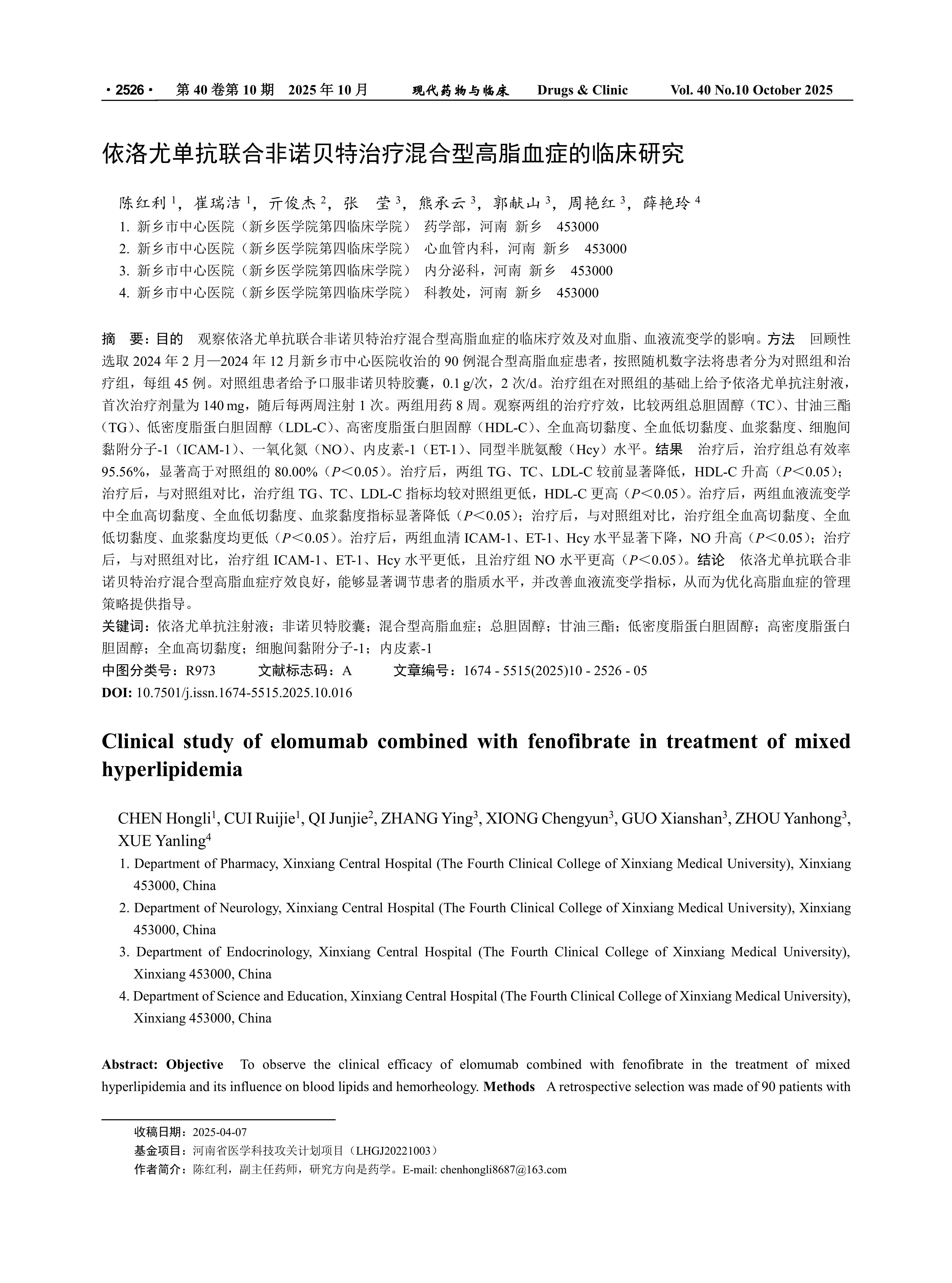Objective To observe the clinical efficacy of elomumab combined with fenofibrate in the treatment of mixed hyperlipidemia and its influence on blood lipids and hemorheology. Methods A retrospective selection was made of 90 patients with mixed hyperlipidemia admitted to Xinxiang Central Hospital from February 2024 to December 2024. The patients were divided into control group and treatment group according to random number method, with 45 cases in each group. Patients in control group were po administered with Fenofibrate Capsules, 0.1 g each time, twice daily. Patients in treatment group were given Evolocumab Injection on basis of control group, the initial treatment dose was 140 mg, followed by injections every two weeks. Both groups were treated with medication for 8 weeks. The therapeutic effects of two groups was observed, levels of TC, TG, LDL-C, HDL-C, high shear viscosity of whole blood, low shear viscosity of whole blood, plasma viscosity, ICAM-1, NO, ET-1, and Hcy were compared between two groups. Results After treatment, the total effective rate of the treatment group was 95.56%, significantly higher than that of the control group (80.00%, P < 0.05). After treatment, TG, TC, and LDL-C in both groups decreased significantly compared with before, while HDL-C increased (P < 0.05). After treatment, compared with control group, the indicators of TG, TC, and LDL-C in treatment group were all lower than those in control group, and HDL-C was higher (P < 0.05). After treatment, high shear viscosity of whole blood, low shear viscosity of whole blood, and plasma viscosity in hemorheology of both groups decreased significantly (P < 0.05). After treatment, compared with control group, high shear viscosity of whole blood, low shear viscosity of whole blood, and plasma viscosity in treatment group were all lower (P < 0.05). After treatment, the levels of serum ICAM-1, ET-1, and Hcy in both groups decreased significantly, while NO increased (P < 0.05). After treatment, compared with control group, the levels of ICAM-1, ET-1, and Hcy in treatment group were lower, and the level of NO in treatment group was higher (P< 0.05). Conclusion Elomumab combined with fenofibrate has a good therapeutic effect in treatment of mixed hyperlipidemia, and can significantly regulate the lipid levels of patients and improve hemorheological indicators, thereby providing guidance for optimizing the management strategies of hyperlipidemia.