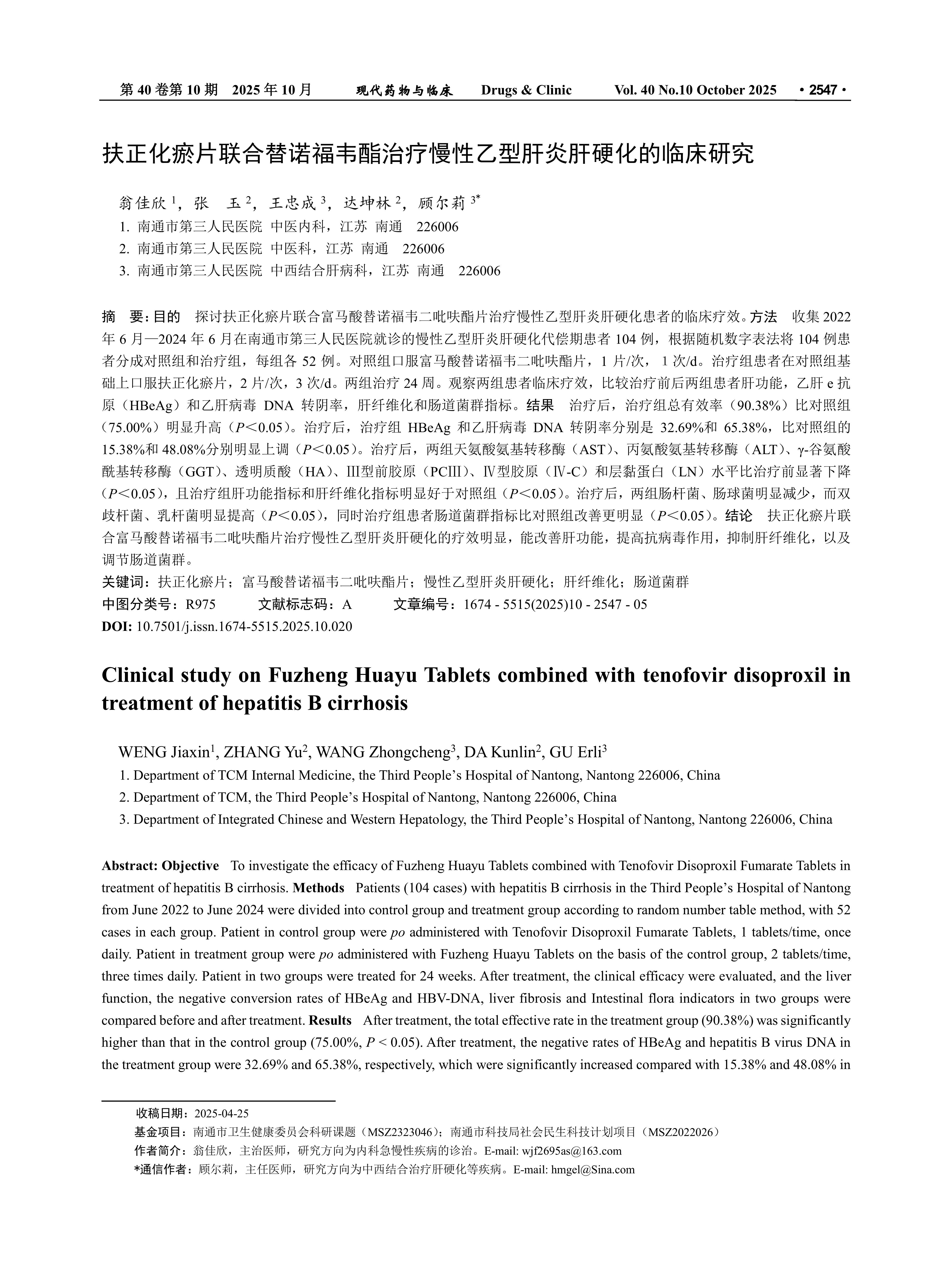 Objective To investigate the efficacy of Fuzheng Huayu Tablets combined with Tenofovir Disoproxil Fumarate Tablets in treatment of hepatitis B cirrhosis. Methods Patients (104 cases) with hepatitis B cirrhosis in the Third People’s Hospital of Nantong from June 2022 to June 2024 were divided into control group and treatment group according to random number table method, with 52 cases in each group. Patient in control group werepo administered with Tenofovir Disoproxil Fumarate Tablets, 1 tablets/time, once daily. Patient in treatment group were po administered with Fuzheng Huayu Tablets on the basis of the control group, 2 tablets/time, three times daily. Patient in two groups were treated for 24 weeks. After treatment, the clinical efficacy were evaluated, and the liver function, the negative conversion rates of HBeAg and HBV-DNA, liver fibrosis and Intestinal flora indicators in two groups were compared before and after treatment. Results After treatment, the total effective rate in the treatment group (90.38%) was significantly higher than that in the control group (75.00%, P< 0.05). After treatment, the negative rates of HBeAg and hepatitis B virus DNA in the treatment group were 32.69% and 65.38%, respectively, which were significantly increased compared with 15.38% and 48.08% in the control group (P < 0.05). After treatment, the levels of AST, ALT, GGT, HA, PCⅢ, Ⅳ-C and LN in two groups were significantly decreased compared with those before treatment, and the liver function indicators and liver fibrosis indicators in the treatment group were significantly better than those in the control group (P < 0.05). After treatment, the number of enterobacteria and enterococci in two groups were significantly decreased, while the number of bifidobacterium and lactobacilli were significantly increased (P < 0.05). At the same time, the intestinal flora indicators of patients in the treatment group were improved more significantly than that in the control group (P < 0.05).Conclusion The efficacy of Fuzheng Huayu Tablets combined with Tenofovir Disoproxil Fumarate Tablets has an definite efficacy in treatment of chronic hepatitis B cirrhosis, can improve liver function and antiviral effect, inhibit liver fibrosis, regulate intestinal flora.