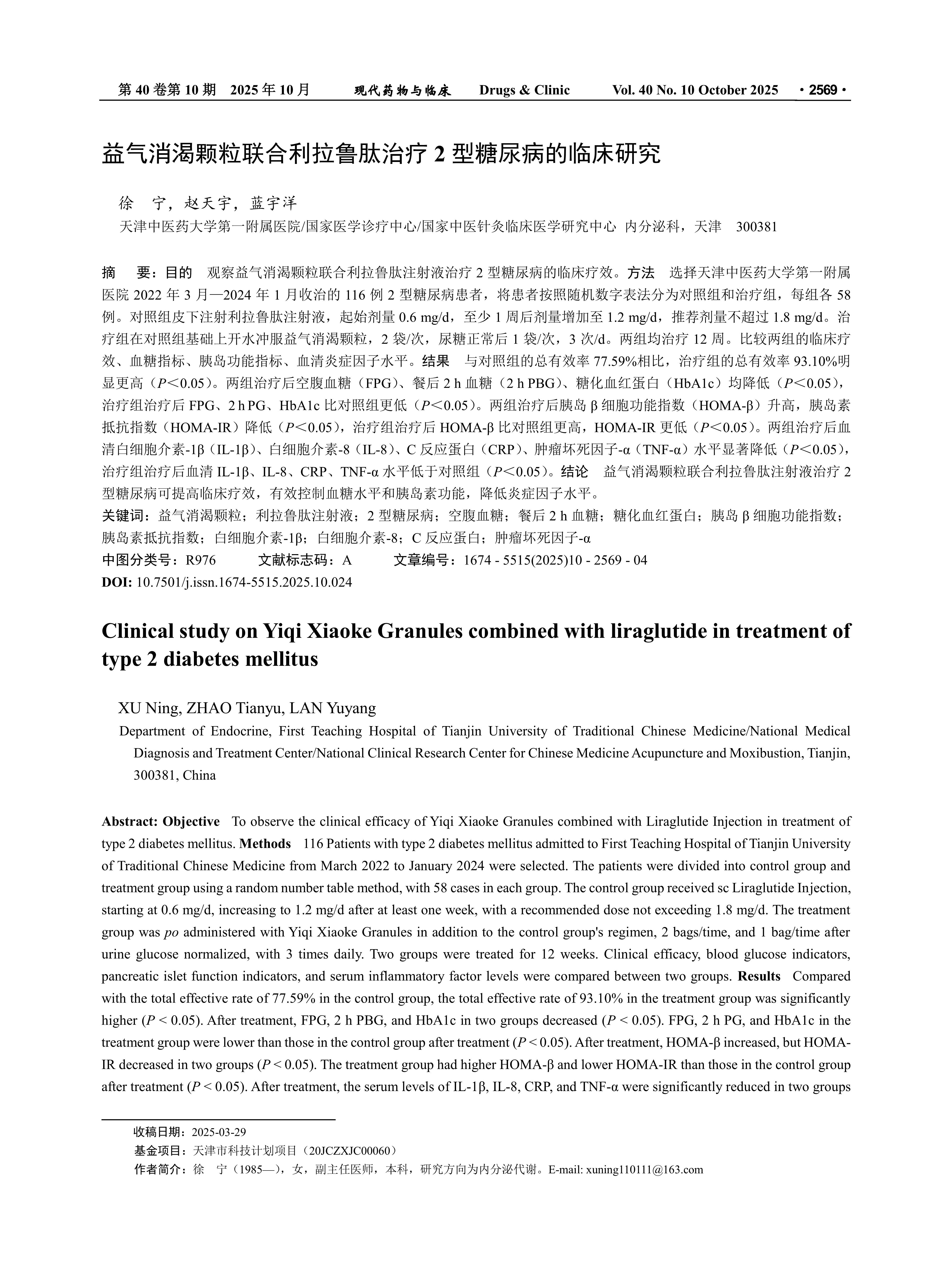 Objective To observe the clinical efficacy of Yiqi Xiaoke Granules combined with Liraglutide Injection in treatment of type 2 diabetes mellitus. Methods 116 Patients with type 2 diabetes mellitus admitted to First Teaching Hospital of Tianjin University of Traditional Chinese Medicine from March 2022 to January 2024 were selected. The patients were divided into control group and treatment group using a random number table method, with 58 cases in each group. The control group received sc Liraglutide Injection, starting at 0.6 mg/d, increasing to 1.2 mg/d after at least one week, with a recommended dose not exceeding 1.8 mg/d. The treatment group was po administered with Yiqi Xiaoke Granules in addition to the control group's regimen, 2 bags/time, and 1 bag/time after urine glucose normalized, with 3 times daily. Two groups were treated for 12 weeks. Clinical efficacy, blood glucose indicators, pancreatic islet function indicators, and serum inflammatory factor levels were compared between two groups. Results Compared with the total effective rate of 77.59% in the control group, the total effective rate of 93.10% in the treatment group was significantly higher (P < 0.05). After treatment, FPG, 2 h PBG, and HbA1c in two groups decreased (P < 0.05). FPG, 2 h PG, and HbA1c in the treatment group were lower than those in the control group after treatment (P < 0.05). After treatment, HOMA-β increased, but HOMA-IR decreased in two groups (P < 0.05). The treatment group had higher HOMA-β and lower HOMA-IR than those in the control group after treatment (P< 0.05). After treatment, the serum levels of IL-1β, IL-8, CRP, and TNF-α were significantly reduced in two groups (P < 0.05). The serum levels of IL-1β, IL-8, CRP, and TNF-α in the treatment group were lower than those in the control group after treatment (P < 0.05). Conclusion Yiqi Xiaoke Granule combined with Lilalutide Injection can improve the clinical efficacy of type 2 diabetes, effectively control the blood sugar level and insulin function, and reduce the level of inflammatory factors.