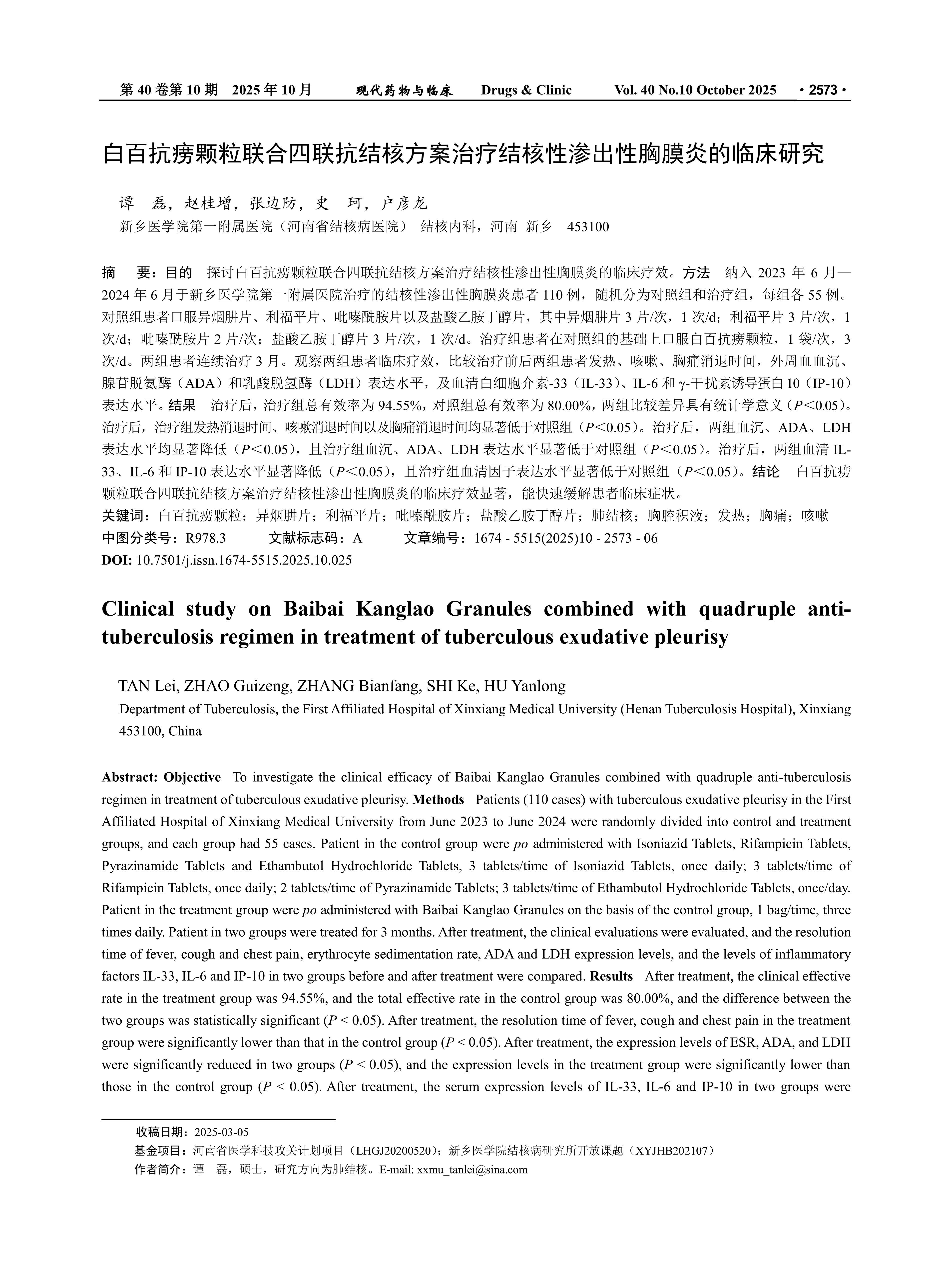 Objective To investigate the clinical efficacy of Baibai Kanglao Granules combined with quadruple anti-tuberculosis regimen in treatment of tuberculous exudative pleurisy. Methods Patients (110 cases) with tuberculous exudative pleurisy in the First Affiliated Hospital of Xinxiang Medical University from June 2023 to June 2024 were randomly divided into control and treatment groups, and each group had 55 cases. Patient in the control group were po administered with Isoniazid Tablets, Rifampicin Tablets, Pyrazinamide Tablets and Ethambutol Hydrochloride Tablets, 3 tablets/time of Isoniazid Tablets, once daily; 3 tablets/time of Rifampicin Tablets, once daily; 2 tablets/time of Pyrazinamide Tablets; 3 tablets/time of Ethambutol Hydrochloride Tablets, once/day. Patient in the treatment group were po administered with Baibai Kanglao Granules on the basis of the control group, 1 bag/time, three times daily. Patient in two groups were treated for 3 months. After treatment, the clinical evaluations were evaluated, and the resolution time of fever, cough and chest pain, erythrocyte sedimentation rate, ADA and LDH expression levels, and the levels of inflammatory factors IL-33, IL-6 and IP-10 in two groups before and after treatment were compared. Results After treatment, the clinical effective rate in the treatment group was 94.55%, and the total effective rate in the control group was 80.00%, and the difference between the two groups was statistically significant (P < 0.05). After treatment, the resolution time of fever, cough and chest pain in the treatment group were significantly lower than that in the control group (P < 0.05). After treatment, the expression levels of ESR, ADA, and LDH were significantly reduced in two groups (P < 0.05), and the expression levels in the treatment group were significantly lower than those in the control group (P< 0.05). After treatment, the serum expression levels of IL-33, IL-6 and IP-10 in two groups were significantly reduced (P < 0.05), and the serum factor expression levels in the treatment group were significantly lower than those in the control group (P < 0.05).Conclusion Baibai Kanglao Granules combined with anti-tuberculosis drugs could significantly improve clinical efficacy in tuberculous exudative pleurisy, rapidly alleviating symptoms.
