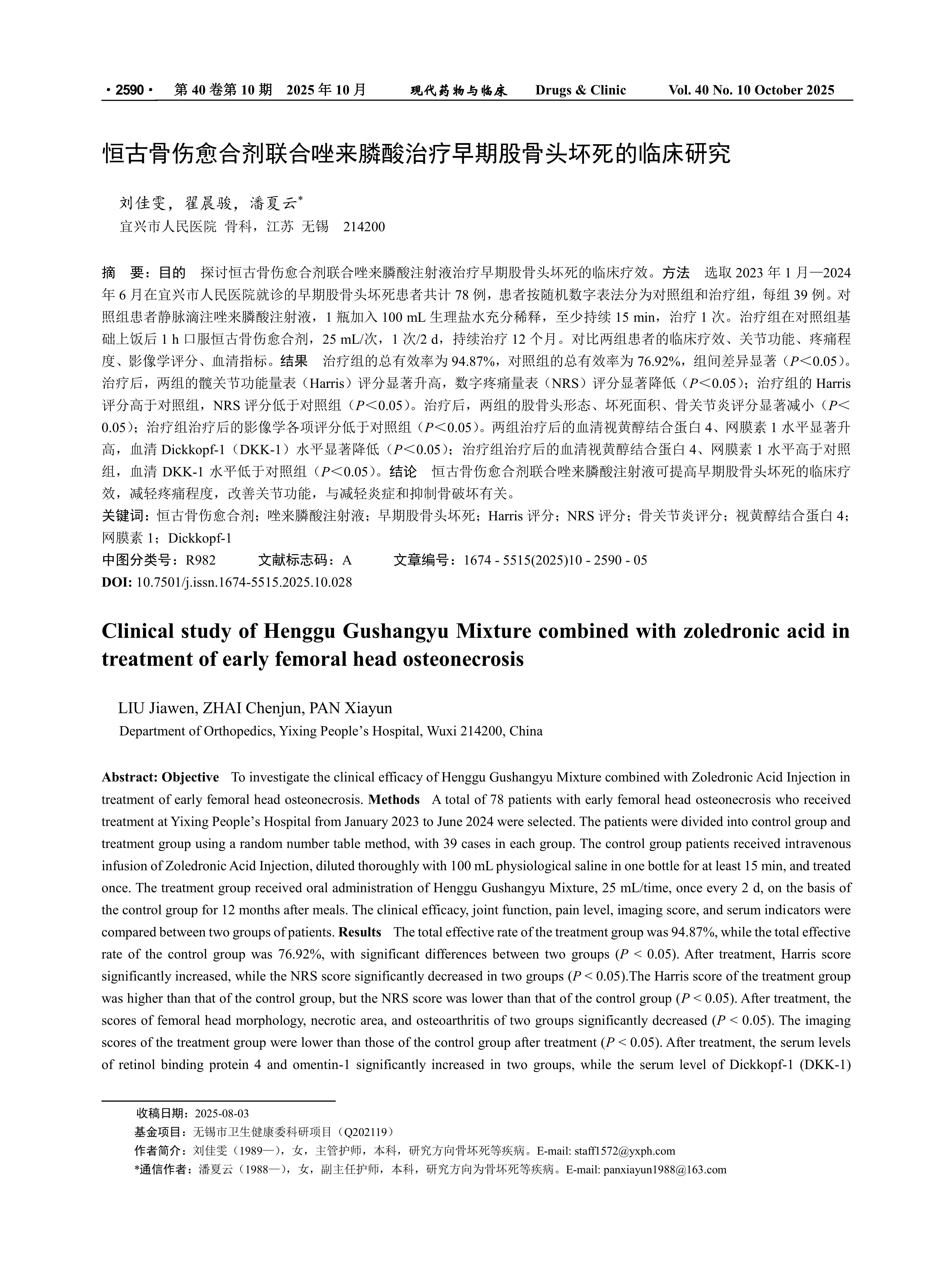 Objective To investigate the clinical efficacy of Henggu Gushangyu Mixture combined with Zoledronic Acid Injection in treatment of early femoral head osteonecrosis. Methods A total of 78 patients with early femoral head osteonecrosis who received treatment at Yixing People’s Hospital from January 2023 to June 2024 were selected. The patients were divided into control group and treatment group using a random number table method, with 39 cases in each group. The control group patients received intravenous infusion of Zoledronic Acid Injection, diluted thoroughly with 100 mL physiological saline in one bottle for at least 15 min, and treated once. The treatment group received oral administration of Henggu Gushangyu Mixture, 25 mL/time, once every 2 d, on the basis of the control group for 12 months after meals. The clinical efficacy, joint function, pain level, imaging score, and serum indicators were compared between two groups of patients. Results The total effective rate of the treatment group was 94.87%, while the total effective rate of the control group was 76.92%, with significant differences between two groups (P< 0.05). After treatment, Harris score significantly increased, while the NRS score significantly decreased in two groups (P < 0.05).The Harris score of the treatment group was higher than that of the control group, but the NRS score was lower than that of the control group (P < 0.05). After treatment, the scores of femoral head morphology, necrotic area, and osteoarthritis of two groups significantly decreased (P < 0.05). The imaging scores of the treatment group were lower than those of the control group after treatment (P < 0.05). After treatment, the serum levels of retinol binding protein 4 and omentin-1 significantly increased in two groups, while the serum level of Dickkopf-1 (DKK-1) significantly decreased (P < 0.05). The serum levels of retinol binding protein 4 and omentin-1 in the treatment group were higher than those in the control group after treatment, but the serum level of DKK-1 was lower than that in the control group (P < 0.05). Conclusion The combination of Henggu Gushangyu Mixture and Zoledronic Acid Injection can improve the clinical efficacy of early femoral head osteonecrosis, alleviate pain, improve joint function, and is related to reducing inflammation and inhibiting bone destruction.