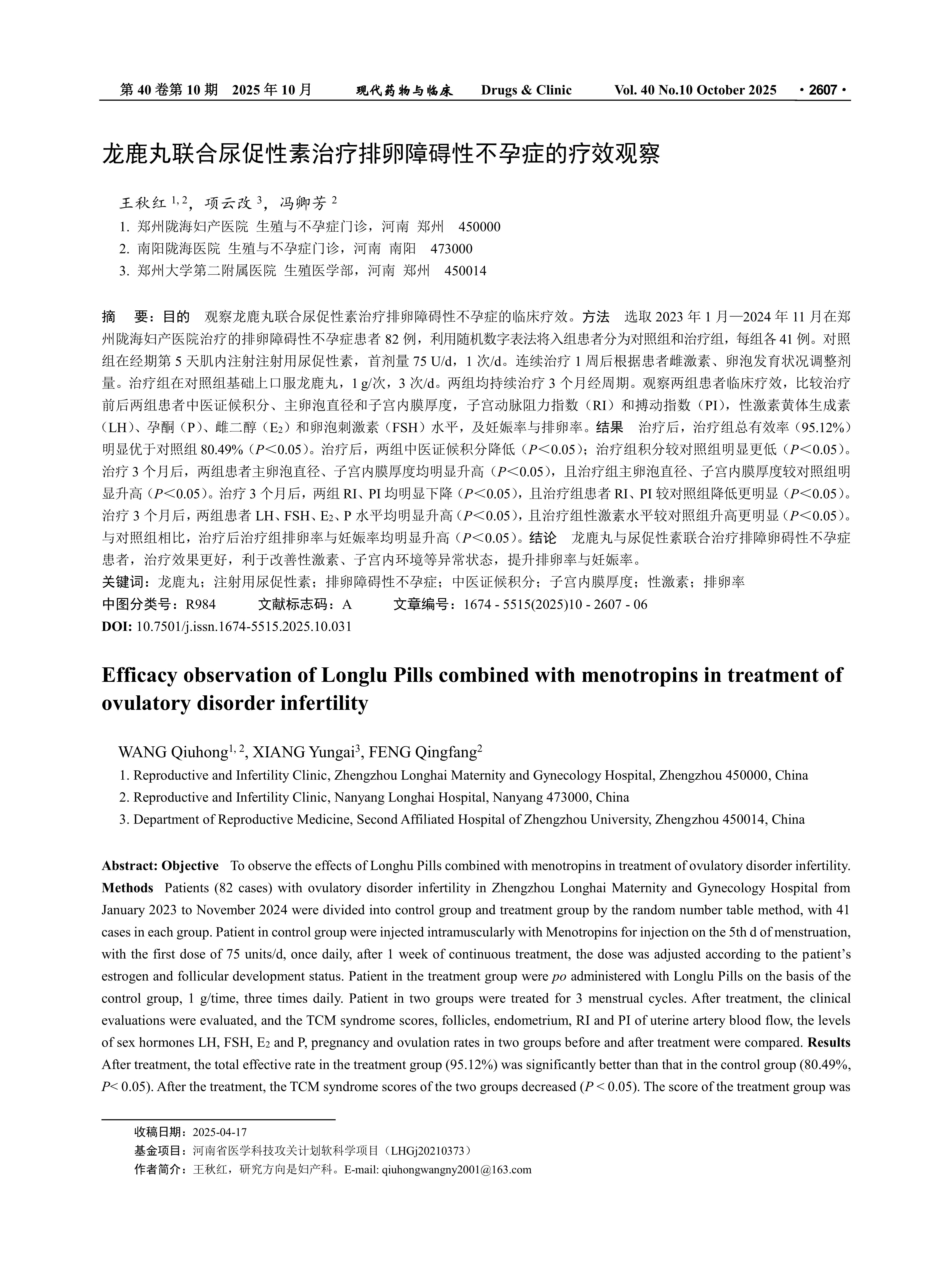 Objective To observe the effects of Longhu Pills combined with menotropins in treatment of ovulatory disorder infertility. Methods Patients (82 cases) with ovulatory disorder infertility in Zhengzhou Longhai Maternity and Gynecology Hospital from January 2023 to November 2024 were divided into control group and treatment group by the random number table method, with 41 cases in each group. Patient in control group were injected intramuscularly with Menotropins for injection on the 5th d of menstruation, with the first dose of 75 units/d, once daily, after 1 week of continuous treatment, the dose was adjusted according to the patient’s estrogen and follicular development status. Patient in the treatment group were po administered with Longlu Pills on the basis of the control group, 1 g/time, three times daily. Patient in two groups were treated for 3 menstrual cycles. After treatment, the clinical evaluations were evaluated, and the TCM syndrome scores, follicles, endometrium, RI and PI of uterine artery blood flow, the levels of sex hormones LH, FSH, E2 and P, pregnancy and ovulation rates in two groups before and after treatment were compared. Results After treatment, the total effective rate in the treatment group (95.12%) was significantly better than that in the control group (80.49%, P< 0.05). After the treatment, the TCM syndrome scores of the two groups decreased (P < 0.05). The score of the treatment group was significantly lower than that of the control group (P < 0.05). After 3 months of treatment, the main follicle diameter and endometrial thickness in two groups were significantly increased (P < 0.05), and the main follicle diameter and endometrial thickness of the treatment group were significantly higher than those of the control group (P < 0.05). After 3 months of treatment, RI and PI were significantly decreased in two groups (P < 0.05), and RI and PI were decreased more significantly in the treatment group than in the control group (P < 0.05). After 3 months of treatment, the levels of LH, FSH, E2, and P in two groups were significantly increased (P < 0.05), and the levels of sex hormones in the treatment group were more significantly increased than those in the control group (P < 0.05). Compared with the control group, the ovulation rate and pregnancy rate in the treatment group were significantly increased after treatment (P < 0.05). Conclusion Longlu Pills combined with menotropins achieves better therapeutic effects in patients with ovulatory disorder infertility, effectively improving sex hormone levels, uterine environment, and enhancing ovulation and pregnancy rates.