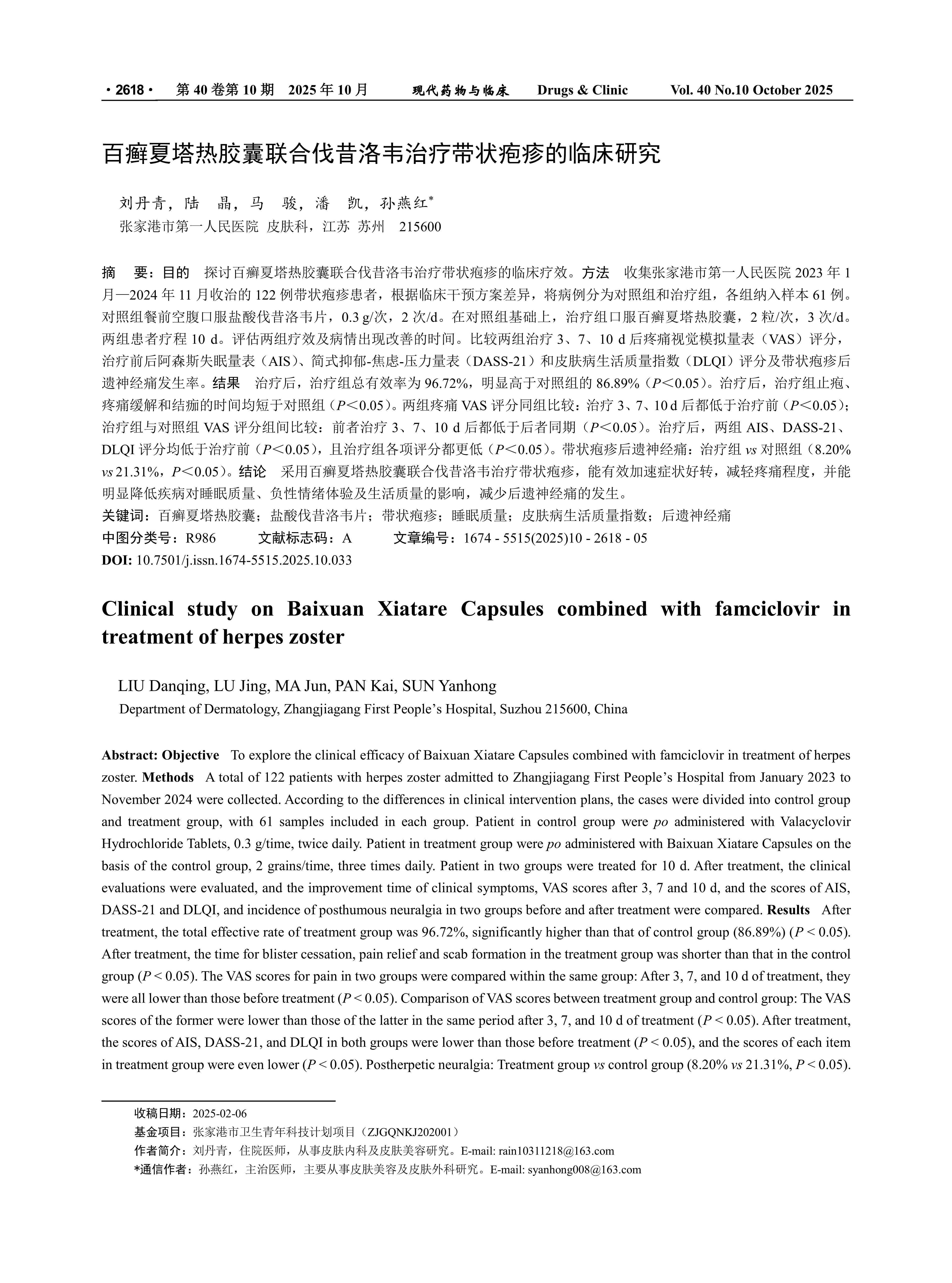 Objective To explore the clinical efficacy of Baixuan Xiatare Capsules combined with famciclovir in treatment of herpes zoster. Methods A total of 122 patients with herpes zoster admitted to Zhangjiagang First People’s Hospital from January 2023 to November 2024 were collected. According to the differences in clinical intervention plans, the cases were divided into control group and treatment group, with 61 samples included in each group. Patient in control group were po administered with Valacyclovir Hydrochloride Tablets, 0.3 g/time, twice daily. Patient in treatment group were po administered with Baixuan Xiatare Capsules on the basis of the control group, 2 grains/time, three times daily. Patient in two groups were treated for 10 d. After treatment, the clinical evaluations were evaluated, and the improvement time of clinical symptoms, VAS scores after 3, 7 and 10 d, and the scores of AIS, DASS-21 and DLQI, and incidence of posthumous neuralgia in two groups before and after treatment were compared. Results After treatment, the total effective rate of treatment group was 96.72%, significantly higher than that of control group (86.89%) (P < 0.05). After treatment, the time for blister cessation, pain relief and scab formation in the treatment group was shorter than that in the control group (P< 0.05). The VAS scores for pain in two groups were compared within the same group: After 3, 7, and 10 d of treatment, they were all lower than those before treatment (P < 0.05). Comparison of VAS scores between treatment group and control group: The VAS scores of the former were lower than those of the latter in the same period after 3, 7, and 10 d of treatment (P < 0.05). After treatment, the scores of AIS, DASS-21, and DLQI in both groups were lower than those before treatment (P < 0.05), and the scores of each item in treatment group were even lower (P < 0.05). Postherpetic neuralgia: Treatment group vs control group (8.20% vs 21.31%, P< 0.05). Conclusion The combination of Baixuan Xiatare capsules and famciclovir can effectively accelerate symptom improvement of herpes zoster, reduce pain levels, and significantly reduce the impact of the disease on sleep quality, negative emotional experiences, and quality of life. It also reduces the occurrence of postherpetic neuralgia.