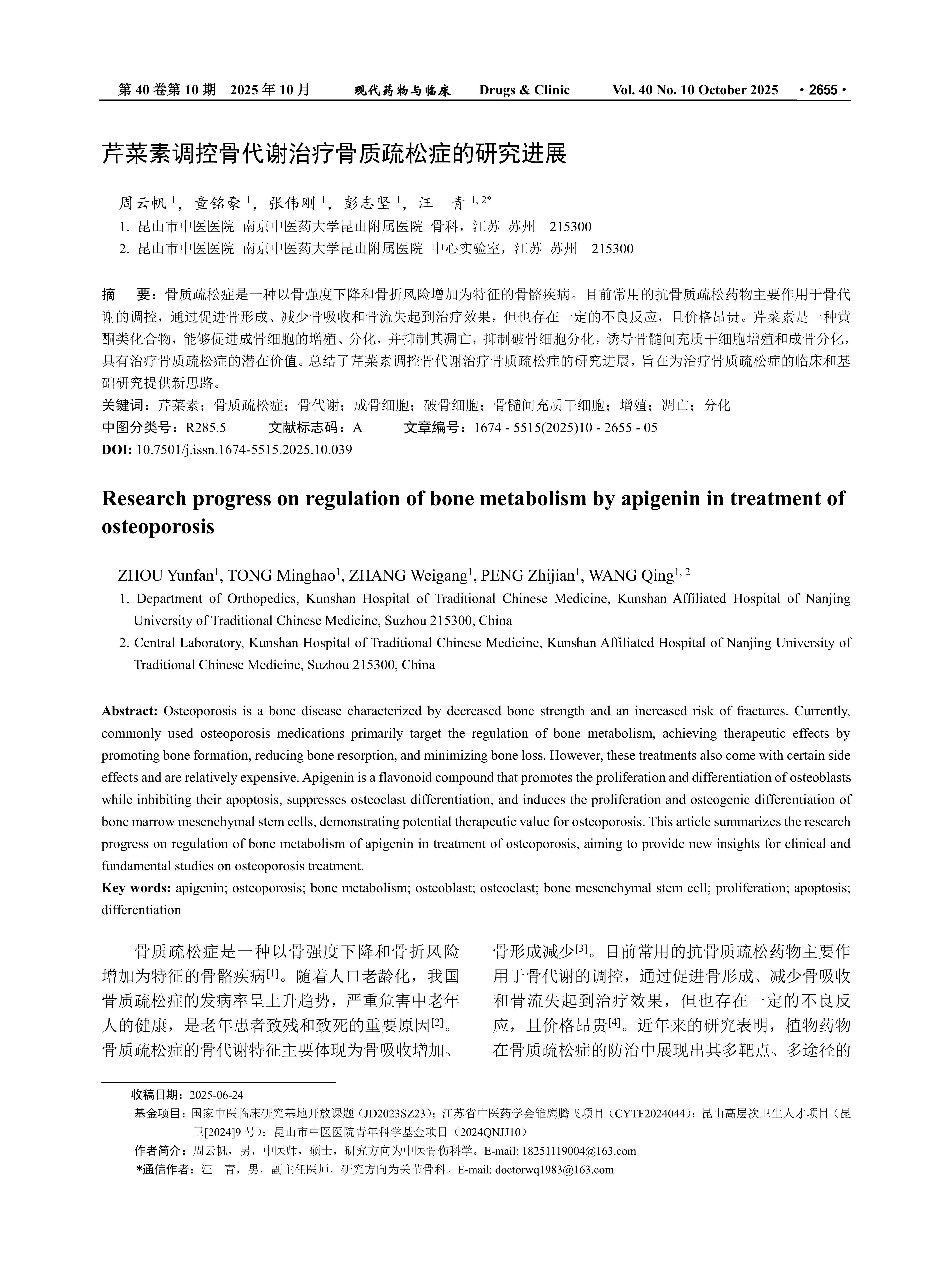 Osteoporosis is a bone disease characterized by decreased bone strength and an increased risk of fractures. Currently, commonly used osteoporosis medications primarily target the regulation of bone metabolism, achieving therapeutic effects by promoting bone formation, reducing bone resorption, and minimizing bone loss. However, these treatments also come with certain side effects and are relatively expensive. Apigenin is a flavonoid compound that promotes the proliferation and differentiation of osteoblasts while inhibiting their apoptosis, suppresses osteoclast differentiation, and induces the proliferation and osteogenic differentiation of bone marrow mesenchymal stem cells, demonstrating potential therapeutic value for osteoporosis. This article summarizes the research progress on regulation of bone metabolism of apigenin in treatment of osteoporosis, aiming to provide new insights for clinical and fundamental studies on osteoporosis treatment.