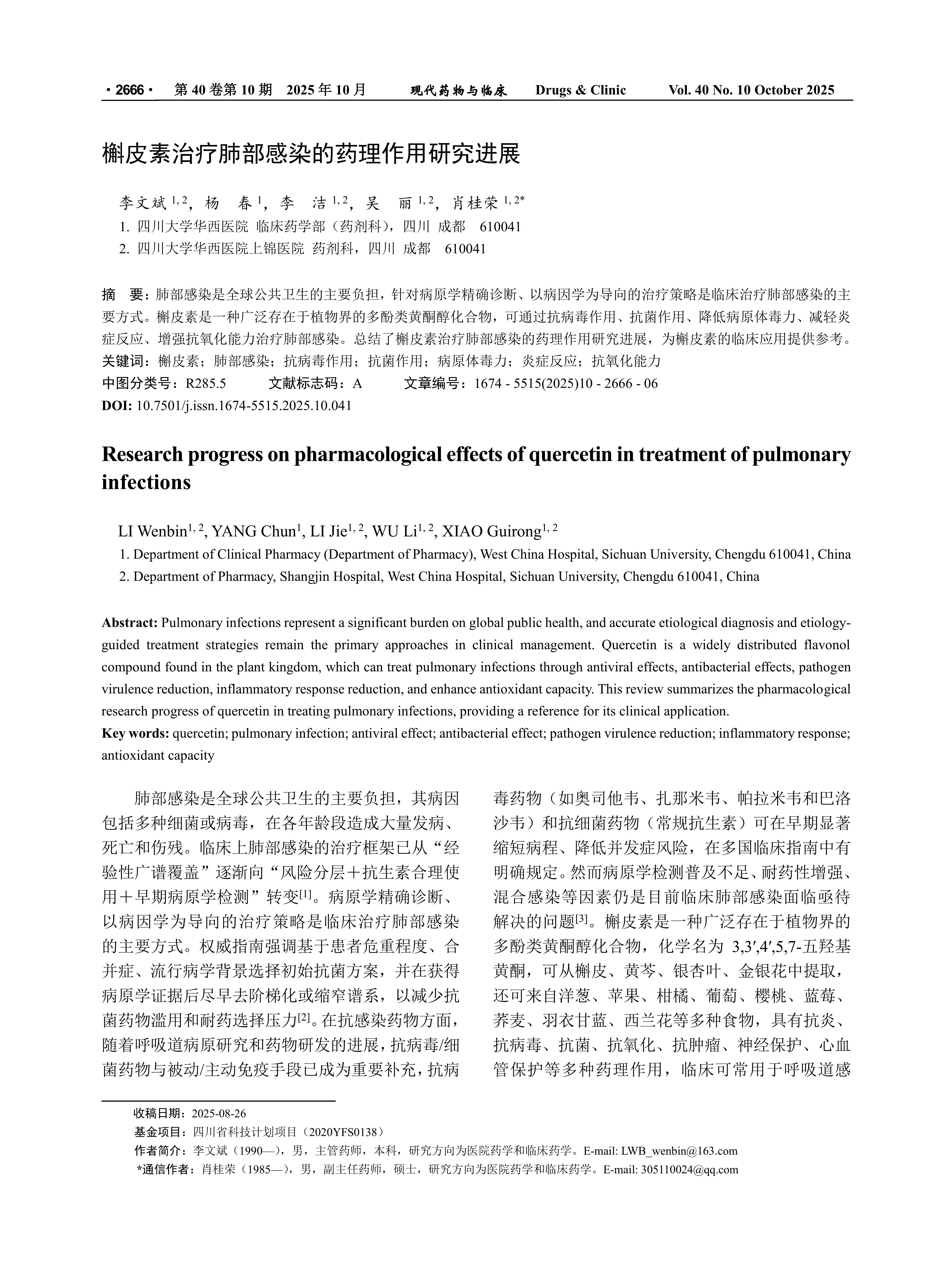 肺部感染是全球公共卫生的主要负担,针对病原学精确诊断、以病因学为导向的治疗策略是临床治疗肺部感染的主要方式。槲皮素是一种广泛存在于植物界的多酚类黄酮醇化合物,可通过抗病毒作用、抗菌作用、降低病原体毒力、减轻炎症反应、增强抗氧化能力治疗肺部感染。总结了槲皮素治疗肺部感染的药理作用研究进展,为槲皮素的临床应用提供参考。