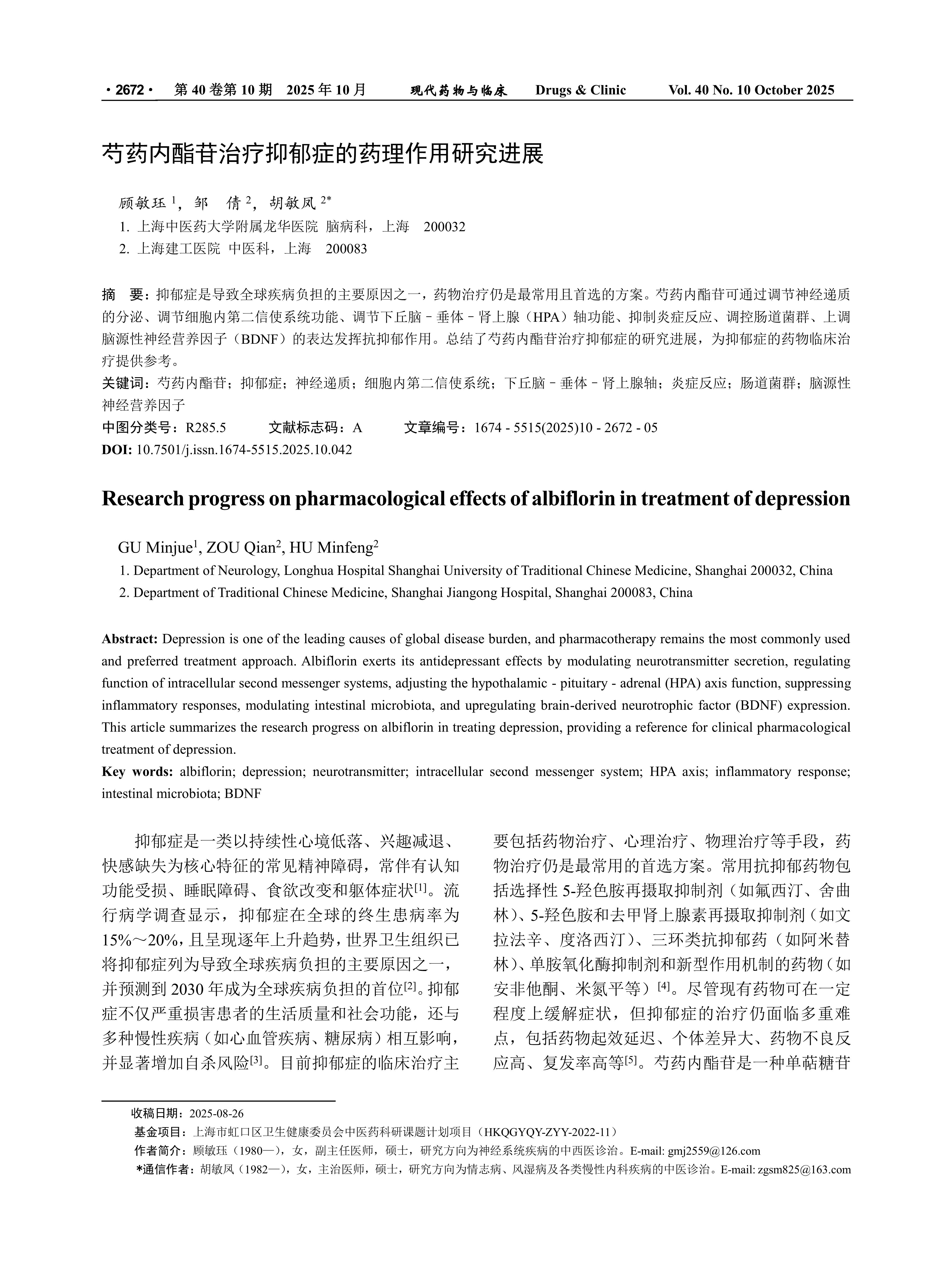 Depression is one of the leading causes of global disease burden, and pharmacotherapy remains the most commonly used and preferred treatment approach. Albiflorin exerts its antidepressant effects by modulating neurotransmitter secretion, regulating function of intracellular second messenger systems, adjusting the hypothalamic- pituitary - adrenal (HPA) axis function, suppressing inflammatory responses, modulating intestinal microbiota, and upregulating brain-derived neurotrophic factor (BDNF) expression. This article summarizes the research progress on albiflorin in treating depression, providing a reference for clinical pharmacological treatment of depression.