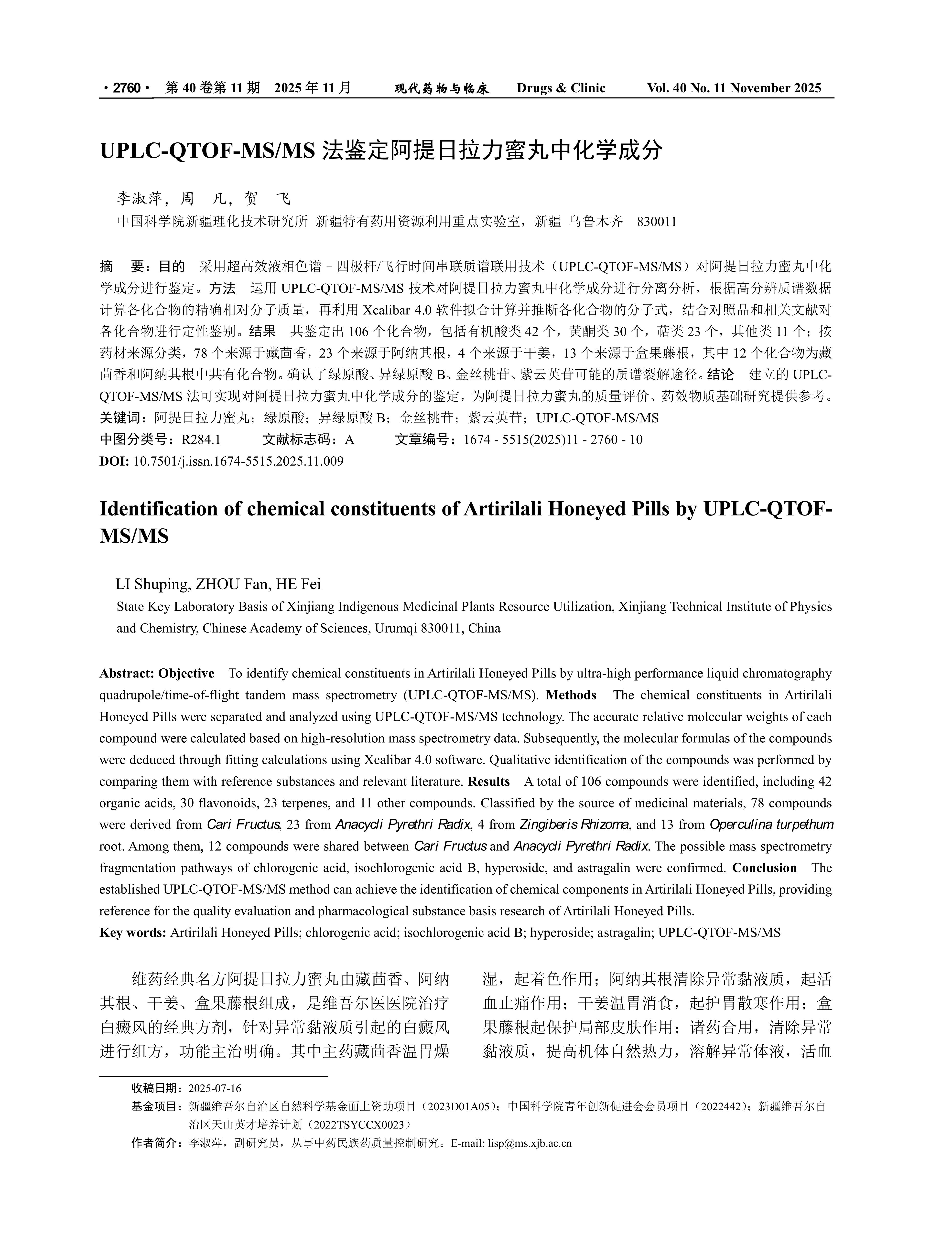 目的 采用超高效液相色谱–四极杆/飞行时间串联质谱联用技术(UPLC-QTOF-MS/MS)对阿提日拉力蜜丸中化学成分进行鉴定。方法 运用UPLC-QTOF-MS/MS技术对阿提日拉力蜜丸中化学成分进行分离分析,根据高分辨质谱数据计算各化合物的精确相对分子质量,再利用Xcalibar 4.0软件拟合计算并推断各化合物的分子式,结合对照品和相关文献对各化合物进行定性鉴别。结果 共鉴定出106个化合物,包括有机酸类42个,黄酮类30个,萜类23个,其他类11个;按药材来源分类,78个来源于藏茴香,23个来源于阿纳其根,4个来源于干姜,13个来源于盒果藤根,其中12个化合物为藏茴香和阿纳其根中共有化合物。确认了绿原酸、异绿原酸B、金丝桃苷、紫云英苷可能的质谱裂解途径。结论 建立的UPLC-QTOF-MS/MS法可实现对阿提日拉力蜜丸中化学成分的鉴定,为阿提日拉力蜜丸的质量评价、药效物质基础研究提供参考。