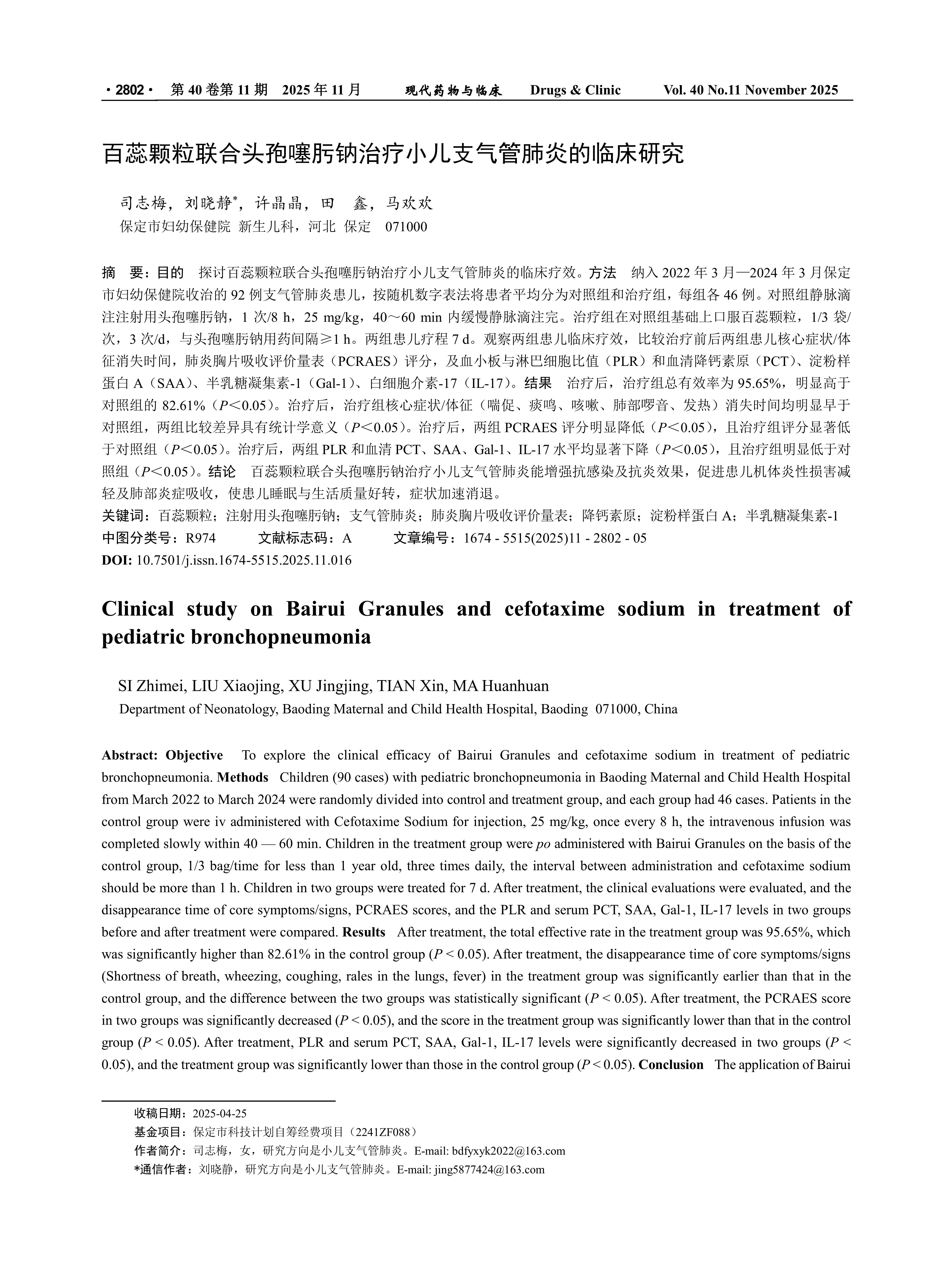 Objective To explore the clinical efficacy of Bairui Granules and cefotaxime sodium in treatment of pediatric bronchopneumonia. Methods Children (90 cases) with pediatric bronchopneumonia in Baoding Maternal and Child Health Hospital from March 2022 to March 2024 were randomly divided into control and treatment group, and each group had 46 cases. Patients in the control group were iv administered with Cefotaxime Sodium for injection, 25 mg/kg, once every 8 h, the intravenous infusion was completed slowly within 40 — 60 min. Children in the treatment group were po administered with Bairui Granules on the basis of the control group, 1/3 bag/time for less than 1 year old, three times daily, the interval between administration and cefotaxime sodium should be more than 1 h. Children in two groups were treated for 7 d. After treatment, the clinical evaluations were evaluated, and the disappearance time of core symptoms/signs, PCRAES scores, and the PLR and serum PCT, SAA, Gal-1, IL-17 levels in two groups before and after treatment were compared. Results After treatment, the total effective rate in the treatment group was 95.65%, which was significantly higher than 82.61% in the control group (P < 0.05). After treatment, the disappearance time of core symptoms/signs (Shortness of breath, wheezing, coughing, rales in the lungs, fever) in the treatment group was significantly earlier than that in the control group, and the difference between the two groups was statistically significant (P < 0.05). After treatment, the PCRAES score in two groups was significantly decreased (P < 0.05), and the score in the treatment group was significantly lower than that in the control group (P < 0.05). After treatment, PLR and serum PCT, SAA, Gal-1, IL-17 levels were significantly decreased in two groups (P < 0.05), and the treatment group was significantly lower than those in the control group (P < 0.05). Conclusion The application of Bairui Granules combined with cefotaxime sodium in treatment of pediatric bronchopneumonia can enhance the anti-infective and anti-inflammatory effects, promote the reduction of inflammatory damage and the absorption of lung inflammation, improve the sleep and quality of life of children, and accelerate the resolution of symptoms.