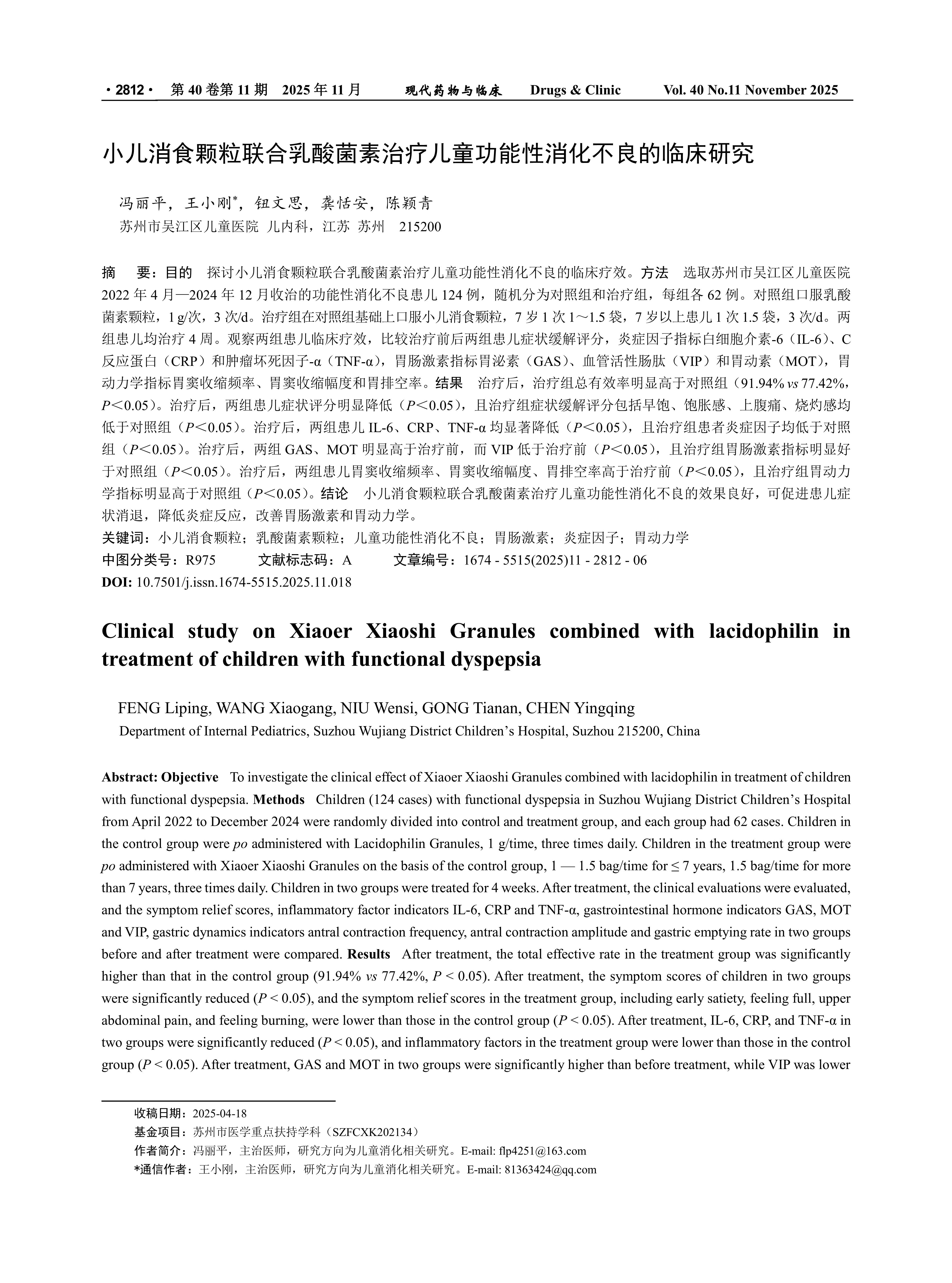 Objective To investigate the clinical effect of Xiaoer Xiaoshi Granules combined with lacidophilin in treatment of children with functional dyspepsia. Methods Children (124 cases) with functional dyspepsia in Suzhou Wujiang District Children’s Hospital from April 2022 to December 2024 were randomly divided into control and treatment group, and each group had 62 cases. Children in the control group were po administered with Lacidophilin Granules, 1 g/time, three times daily. Children in the treatment group were po administered with Xiaoer Xiaoshi Granules on the basis of the control group, 1 — 1.5 bag/time for ≤ 7 years, 1.5 bag/time for more than 7 years, three times daily. Children in two groups were treated for 4 weeks. After treatment, the clinical evaluations were evaluated, and the symptom relief scores, inflammatory factor indicators IL-6, CRP and TNF-α, gastrointestinal hormone indicators GAS, MOT and VIP, gastric dynamics indicators antral contraction frequency, antral contraction amplitude and gastric emptying rate in two groups before and after treatment were compared. Results After treatment, the total effective rate in the treatment group was significantly higher than that in the control group (91.94% vs 77.42%, P < 0.05). After treatment, the symptom scores of children in two groups were significantly reduced (P < 0.05), and the symptom relief scores in the treatment group, including early satiety, feeling full, upper abdominal pain, and feeling burning, were lower than those in the control group (P < 0.05). After treatment, IL-6, CRP, and TNF-α in two groups were significantly reduced (P < 0.05), and inflammatory factors in the treatment group were lower than those in the control group (P < 0.05). After treatment, GAS and MOT in two groups were significantly higher than before treatment, while VIP was lower than before treatment (P < 0.05), and the gastrointestinal hormone indicators in the treatment group were significantly better than those in the control group (P < 0.05). After treatment, the gastric antral contraction frequency, gastric antral contraction amplitude, and gastric emptying rate in two groups were higher than before treatment (P < 0.05), and the gastric dynamic indicators in the treatment group were significantly higher than those in the control group (P < 0.05). Conclusion Xiaoer Xiaoshi Granules combined with lactobacillin has a good effect in the treatment of functional dyspepsia in children, promoting the regression of symptoms, reducing inflammatory response, improving gastrointestinal hormones and gastric dynamics.