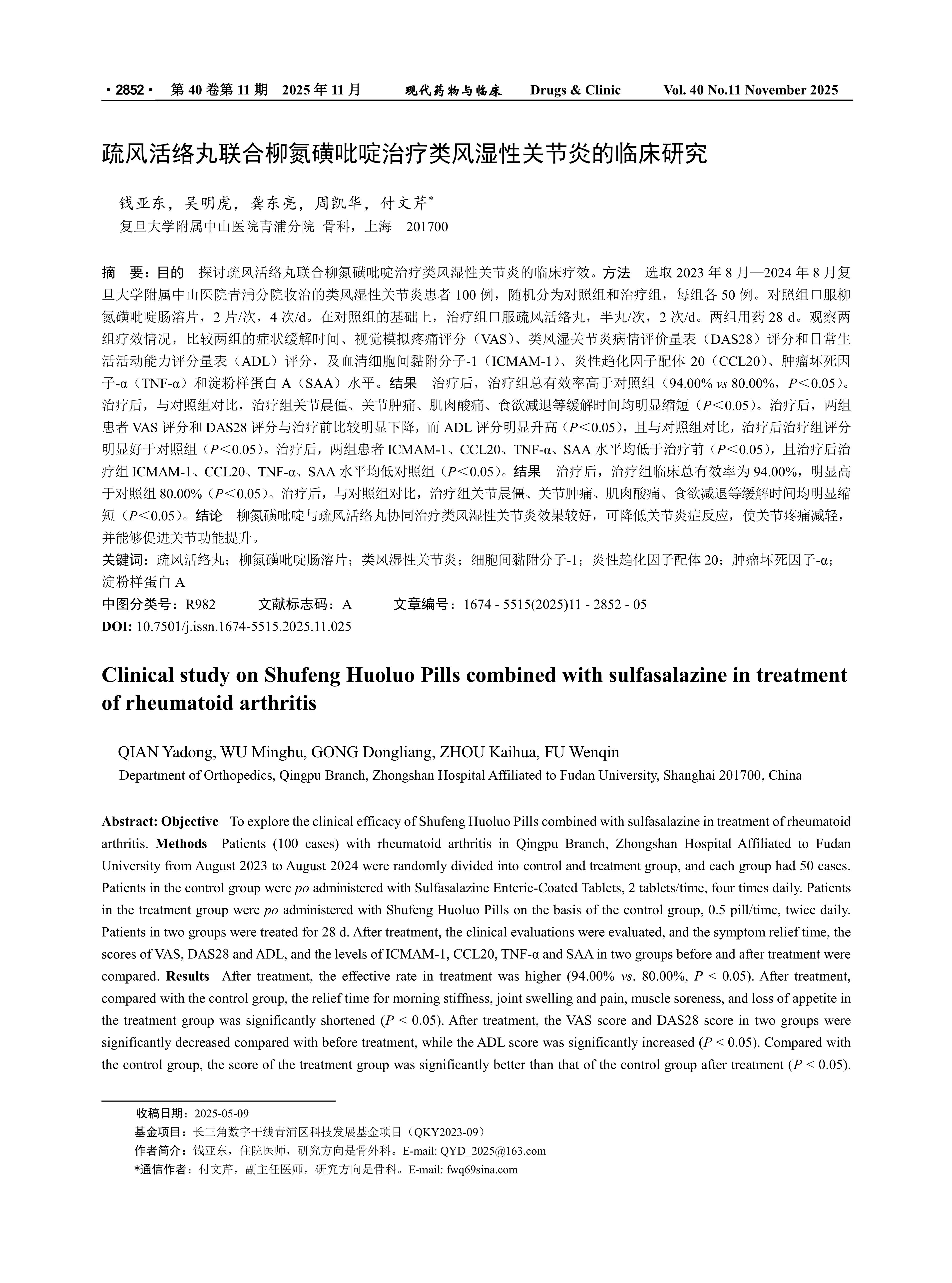 Objective To explore the clinical efficacy of Shufeng Huoluo Pills combined with sulfasalazine in treatment of rheumatoid arthritis. Methods Patients (100 cases) with rheumatoid arthritis in Qingpu Branch, Zhongshan Hospital Affiliated to Fudan University from August 2023 to August 2024 were randomly divided into control and treatment group, and each group had 50 cases. Patients in the control group were po administered with Sulfasalazine Enteric-Coated Tablets, 2 tablets/time, four times daily. Patients in the treatment group were po administered with Shufeng Huoluo Pills on the basis of the control group, 0.5 pill/time, twice daily. Patients in two groups were treated for 28 d. After treatment, the clinical evaluations were evaluated, and the symptom relief time, the scores of VAS, DAS28 and ADL, and the levels of ICMAM-1, CCL20, TNF-α and SAA in two groups before and after treatment were compared. Results After treatment, the effective rate in treatment was higher (94.00% vs. 80.00%, P < 0.05). After treatment, compared with the control group, the relief time for morning stiffness, joint swelling and pain, muscle soreness, and loss of appetite in the treatment group was significantly shortened (P < 0.05). After treatment, the VAS score and DAS28 score in two groups were significantly decreased compared with before treatment, while the ADL score was significantly increased (P < 0.05). Compared with the control group, the score of the treatment group was significantly better than that of the control group after treatment (P < 0.05). After treatment, the levels of ICMAM-1, CCL20, TNF-α, and SAA in two groups were lower than those before treatment (P < 0.05), and which in the treatment group were lower than those in the control group (P < 0.05). Conclusion The synergistic treatment of sulfasalazine and Shufeng Huoluo Pills has a good effect on rheumatoid arthritis, which can reduce joint inflammation response, alleviate joint pain, and promote joint function improvement.
