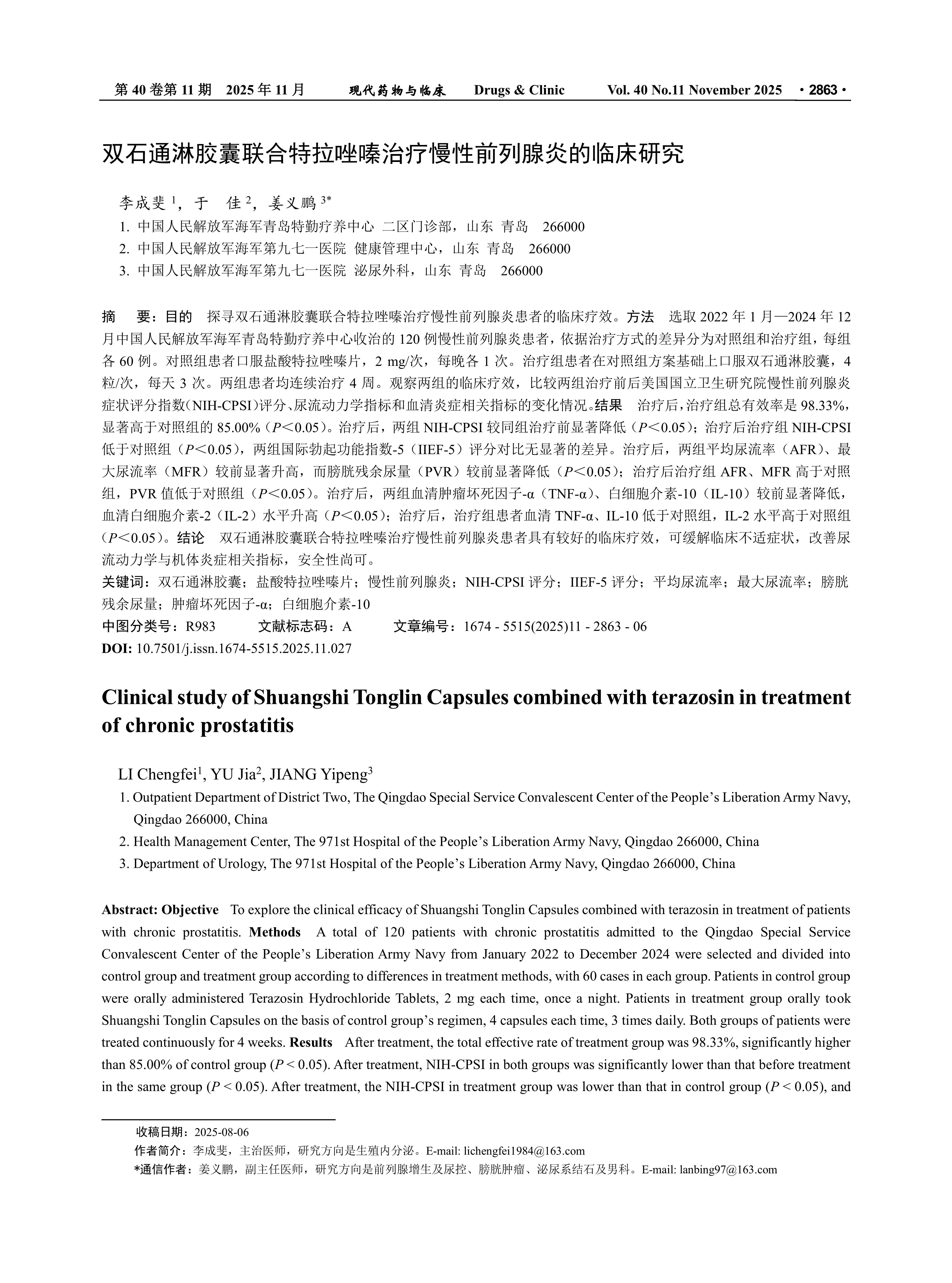 Objective To explore the clinical efficacy of Shuangshi Tonglin Capsules combined with terazosin in treatment of patients with chronic prostatitis. Methods A total of 120 patients with chronic prostatitis admitted to the Qingdao Special Service Convalescent Center of the People’s Liberation Army Navy from January 2022 to December 2024 were selected and divided into control group and treatment group according to differences in treatment methods, with 60 cases in each group. Patients in control group were orally administered Terazosin Hydrochloride Tablets, 2 mg each time, once a night. Patients in treatment group orally took Shuangshi Tonglin Capsules on the basis of control group’s regimen, 4 capsules each time, 3 times daily. Both groups of patients were treated continuously for 4 weeks. Results After treatment, the total effective rate of treatment group was 98.33%, significantly higher than 85.00% of control group (P < 0.05). After treatment, NIH-CPSI in both groups was significantly lower than that before treatment in the same group (P < 0.05). After treatment, the NIH-CPSI in treatment group was lower than that in control group (P < 0.05), and there was no significant difference in IIEF-5 score between two groups. After treatment, the average urinary flow rate (AFR) and maximum urinary flow rate (MFR) in both groups were significantly increased compared with before, but the residual urine volume of the bladder (PVR) was significantly decreased compared with before (P < 0.05). After treatment, the AFR and MFR in treatment group were higher than those in control group, but the PVR value was lower than that in control group (P < 0.05). After treatment, the levels of serum TNF-α and IL-10 in both groups decreased significantly compared with before, and the level of serum IL-2 increased (P < 0.05). After treatment, the levels of serum TNF-α and IL-10 in treatment group were lower than those in control group, and the level of IL-2 was higher than that in control group (P < 0.05). Conclusion Shuangshi Tonglin Capsules combined with terazosin have a good clinical effect in treatment of patients with chronic prostatitis, and can relieve clinical discomfort symptoms, improve urodynamic and inflammation-related indicators of the body, and the safety is acceptable.