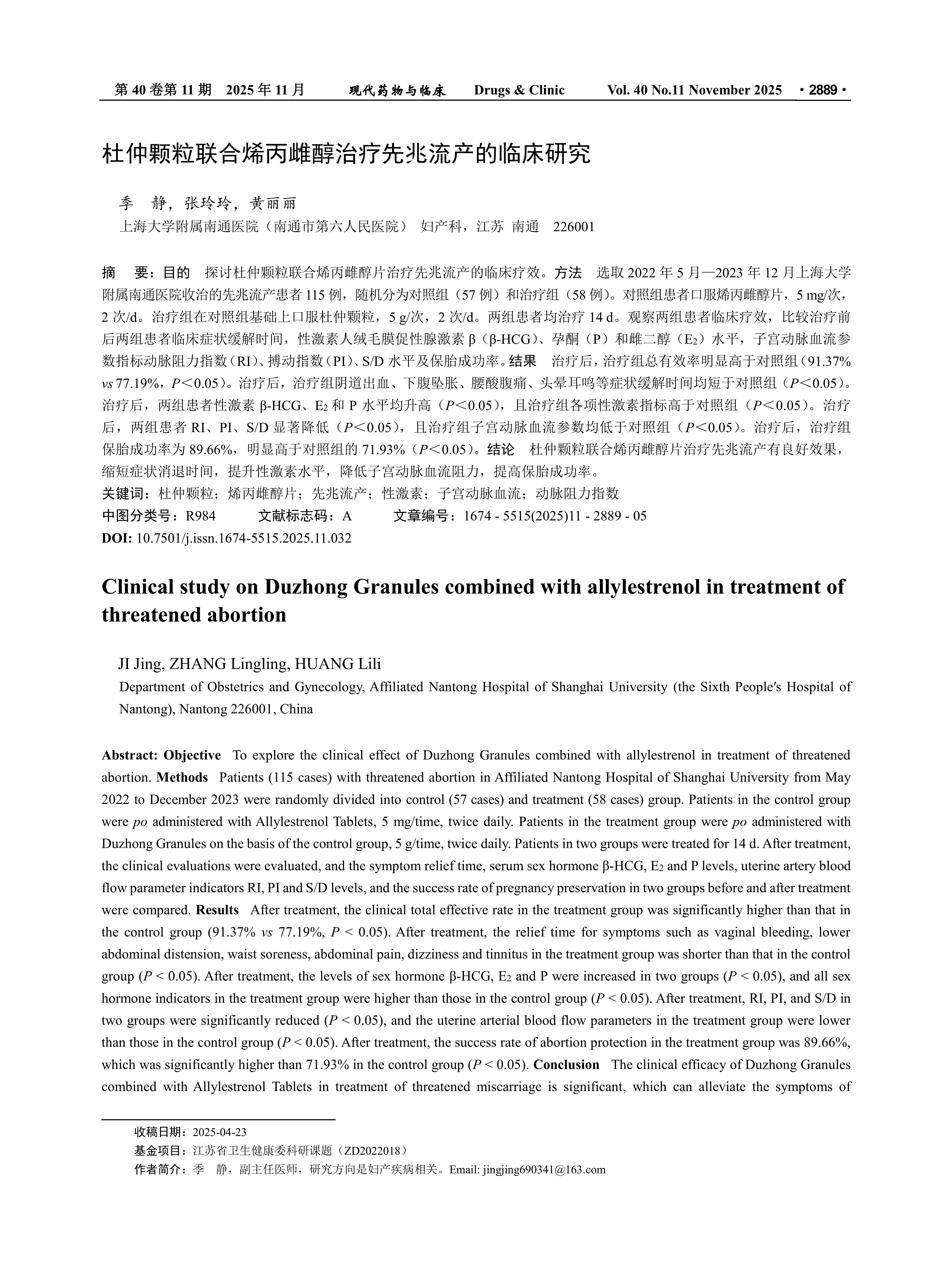 Objective To explore the clinical effect of Duzhong Granules combined with allylestrenol in treatment of threatened abortion. Methods Patients (115 cases) with threatened abortion in Affiliated Nantong Hospital of Shanghai University from May 2022 to December 2023 were randomly divided into control (57 cases) and treatment (58 cases) group. Patients in the control group were po administered with Allylestrenol Tablets, 5 mg/time, twice daily. Patients in the treatment group were po administered with Duzhong Granules on the basis of the control group, 5 g/time, twice daily. Patients in two groups were treated for 14 d. After treatment, the clinical evaluations were evaluated, and the symptom relief time, serum sex hormone β-HCG, E2 and P levels, uterine artery blood flow parameter indicators RI, PI and S/D levels, and the success rate of pregnancy preservation in two groups before and after treatment were compared. Results After treatment, the clinical total effective rate in the treatment group was significantly higher than that in the control group (91.37% vs 77.19%, P < 0.05). After treatment, the relief time for symptoms such as vaginal bleeding, lower abdominal distension, waist soreness, abdominal pain, dizziness and tinnitus in the treatment group was shorter than that in the control group (P < 0.05). After treatment, the levels of sex hormone β-HCG, E2 and P were increased in two groups (P < 0.05), and all sex hormone indicators in the treatment group were higher than those in the control group (P < 0.05). After treatment, RI, PI, and S/D in two groups were significantly reduced (P < 0.05), and the uterine arterial blood flow parameters in the treatment group were lower than those in the control group (P < 0.05). After treatment, the success rate of abortion protection in the treatment group was 89.66%, which was significantly higher than 71.93% in the control group (P < 0.05). Conclusion The clinical efficacy of Duzhong Granules combined with Allylestrenol Tablets in treatment of threatened miscarriage is significant, which can alleviate the symptoms of premature miscarriage, improve sex hormone levels, reduce uterine artery blood flow resistance, increase the success rate of fetal preservation.