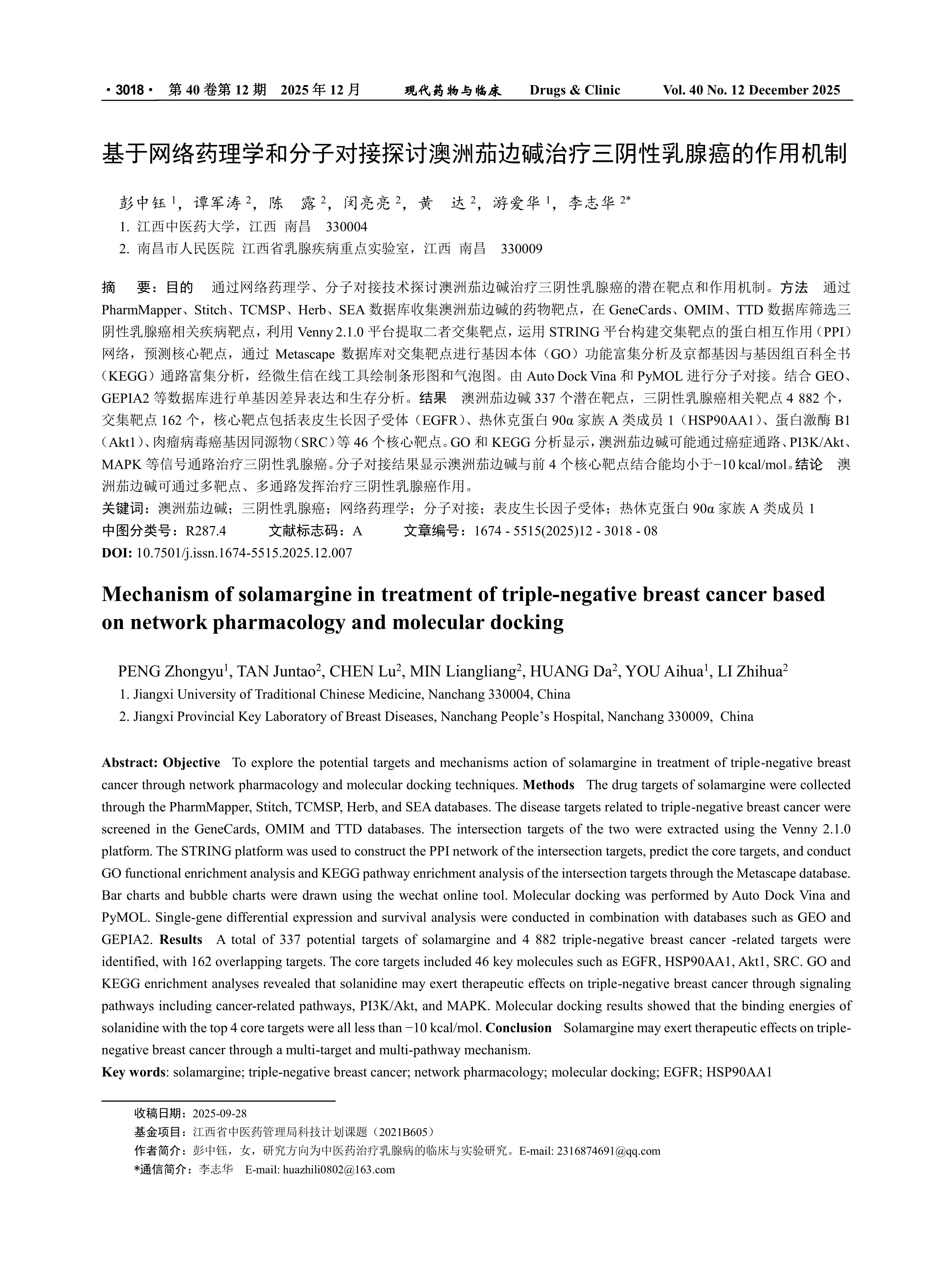 目的 通过网络药理学、分子对接技术探讨澳洲茄边碱治疗三阴性乳腺癌的潜在靶点和作用机制。方法 通过PharmMapper、Stitch、TCMSP、Herb、SEA数据库收集澳洲茄边碱的药物靶点,在GeneCards、OMIM、TTD数据库筛选三阴性乳腺癌相关疾病靶点,利用Venny 2.1.0平台提取二者交集靶点,运用STRING平台构建交集靶点的蛋白相互作用(PPI)网络,预测核心靶点,通过Metascape数据库对交集靶点进行基因本体(GO)功能富集分析及京都基因与基因组百科全书(KEGG)通路富集分析,经微生信在线工具绘制条形图和气泡图。由Auto Dock Vina和PyMOL进行分子对接。结合GEO、GEPIA2等数据库进行单基因差异表达和生存分析。结果 澳洲茄边碱337个潜在靶点,三阴性乳腺癌相关靶点4 882个,交集靶点162个,核心靶点包括表皮生长因子受体(EGFR)、热休克蛋白90α家族A类成员1(HSP90AA1)、蛋白激酶B1(Akt1)、肉瘤病毒癌基因同源物(SRC)等46个核心靶点。GO和KEGG分析显示,澳洲茄边碱可能通过癌症通路、PI3K/Akt、MAPK等信号通路治疗三阴性乳腺癌。分子对接结果显示澳洲茄边碱与前4个核心靶点结合能均小于−10 kcal/mol。结论 澳洲茄边碱可通过多靶点、多通路发挥治疗三阴性乳腺癌作用。