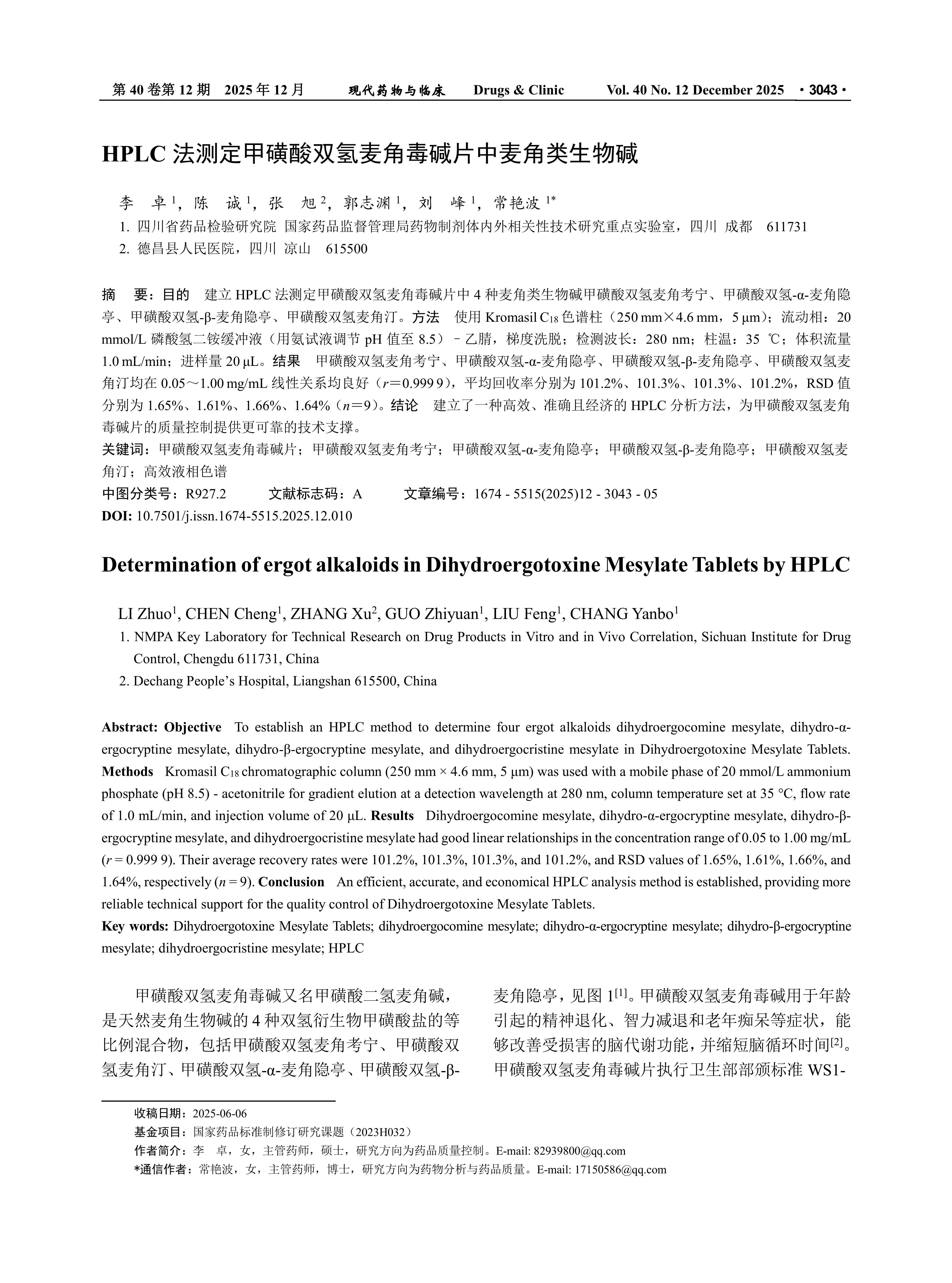 Objective To establish an HPLC method to determine four ergot alkaloids dihydroergocomine mesylate, dihydro-α-ergocryptine mesylate, dihydro-β-ergocryptine mesylate, and dihydroergocristine mesylate in Dihydroergotoxine Mesylate Tablets. Methods Kromasil C18chromatographic column (250 mm × 4.6 mm, 5 μm) was used with a mobile phase of 20 mmol/L ammonium phosphate (pH 8.5) - acetonitrile for gradient elution at a detection wavelength at 280 nm, column temperature set at 35 °C, flow rate of 1.0 mL/min, and injection volume of 20 μL. Results Dihydroergocomine mesylate, dihydro-α-ergocryptine mesylate, dihydro-β-ergocryptine mesylate, and dihydroergocristine mesylate had good linear relationships in the concentration range of 0.05 to 1.00 mg/mL (r = 0.999 9). Their average recovery rates were 101.2%, 101.3%, 101.3%, and 101.2%, and RSD values of 1.65%, 1.61%, 1.66%, and 1.64%, respectively (n = 9). Conclusion An efficient, accurate, and economical HPLC analysis method is established, providing more reliable technical support for the quality control of Dihydroergotoxine Mesylate Tablets.