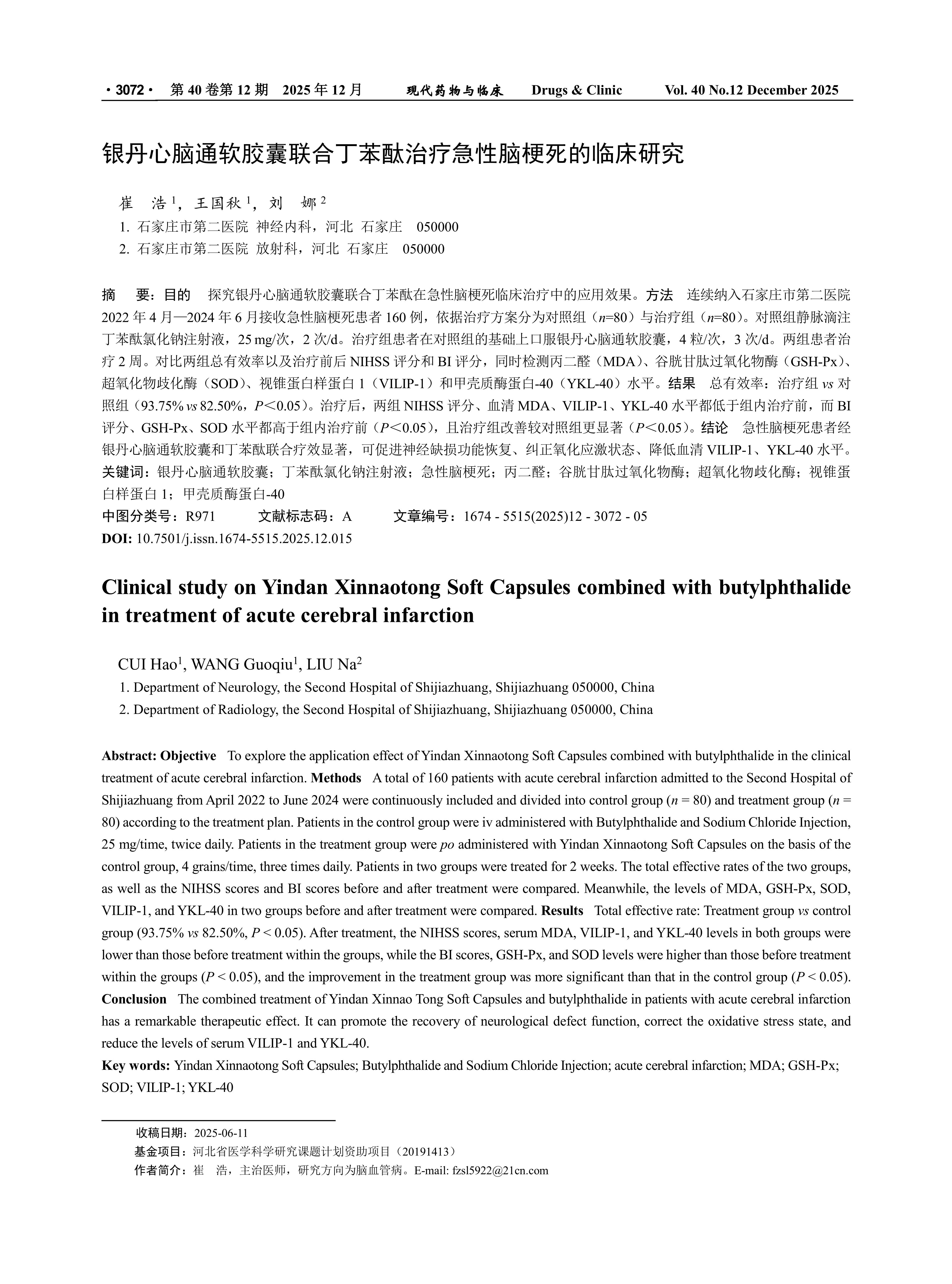 Objective To explore the application effect of Yindan Xinnaotong Soft Capsules combined with butylphthalide in the clinical treatment of acute cerebral infarction. Methods A total of 160 patients with acute cerebral infarction admitted to the Second Hospital of Shijiazhuang from April 2022 to June 2024 were continuously included and divided into control group (n = 80) and treatment group (n = 80) according to the treatment plan. Patients in the control group were iv administered with Butylphthalide and Sodium Chloride Injection, 25 mg/time, twice daily. Patients in the treatment group were po administered with Yindan Xinnaotong Soft Capsules on the basis of the control group, 4 grains/time, three times daily. Patients in two groups were treated for 2 weeks. The total effective rates of the two groups, as well as the NIHSS scores and BI scores before and after treatment were compared. Meanwhile, the levels of MDA, GSH-Px, SOD, VILIP-1, and YKL-40 in two groups before and after treatment were compared. Results Total effective rate: Treatment group vs control group (93.75% vs 82.50%, P < 0.05). After treatment, the NIHSS scores, serum MDA, VILIP-1, and YKL-40 levels in both groups were lower than those before treatment within the groups, while the BI scores, GSH-Px, and SOD levels were higher than those before treatment within the groups (P < 0.05), and the improvement in the treatment group was more significant than that in the control group (P < 0.05). Conclusion The combined treatment of Yindan Xinnao Tong Soft Capsules and butylphthalide in patients with acute cerebral infarction has a remarkable therapeutic effect. It can promote the recovery of neurological defect function, correct the oxidative stress state, and reduce the levels of serum VILIP-1 and YKL-40.