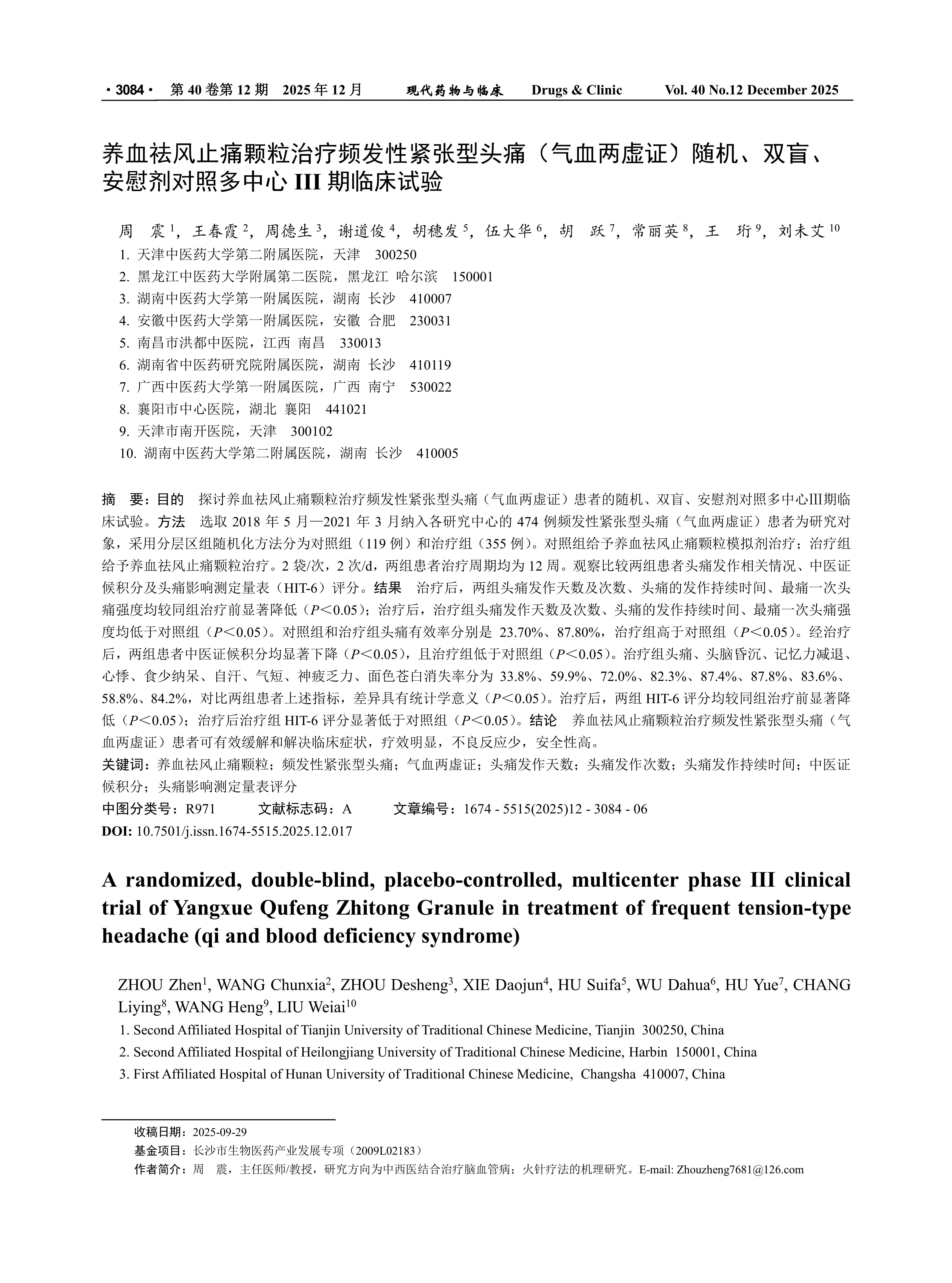 Objective To explore a randomized, double-blind, placebo-controlled multicenter phase III clinical trial of Yangxue Qufeng Zhitong Granules in treatment of patients with frequent tension-type headache (qi and blood deficiency syndrome). Methods A total of 474 patients with frequent tension-type headache (qi and blood deficiency syndrome) included in each research center from May 2018 to March 2021 were selected as the research subjects. They were divided into control group (119 cases) and treatment group (355 cases) by stratified block randomization. Patients in control group were treated with the simulation agent of Yangxue Qufeng Zhitong Granules. Patients in treatment group were given Yangxue Qufeng Zhitong Granules for treatment. They were given 2 bags each time, twice daily. The treatment period for both groups of patients was 12 weeks. The conditions related to headache attacks, TCM syndrome scores and HIT-6 scores of two groups were observed and compared. Results After treatment, the number of days and frequency of headache attacks, the duration of headache attacks, and the intensity of the most severe headache in both groups were significantly lower than those before treatment in the same group (P < 0.05). After treatment, the number of days and frequency of headache attacks, the duration of headache attacks, and the intensity of the most severe headache in the treatment group were all lower than those in the control group (P < 0.05). The effective rates of headache in the control group and the treatment group were 23.70% and 87.80% respectively, and the treatment group was higher than the control group (P < 0.05). After treatment, the TCM syndrome scores of both groups of patients decreased significantly (P < 0.05), and those of the treatment group were lower than those of the control group (P < 0.05). The disappearance rates of headache, dizziness, memory loss, palpitations, poor appetite, spontaneous sweating, shortness of breath, fatigue and pale complexion in the treatment group were 33.8%, 59.9%, 72.0%, 82.3%, 87.4%, 87.8%, 83.6%, 58.8%, and 84.2% respectively. The comparison of the above indicators between the two groups showed statistically significant differences (P < 0.05). After treatment, the HIT-6 scores of both groups were significantly lower than those before treatment in the same group (P < 0.05). After treatment, the HIT-6 score of the treatment group was significantly lower than that of the control group (P < 0.05). Conclusion Yangxue Qufeng Zhitong Granules can effectively relieve and solve the clinical symptoms of patients with frequent tension-type headache (qi and blood deficiency syndrome) with obvious therapeutic effect, few adverse reactions and high safety.