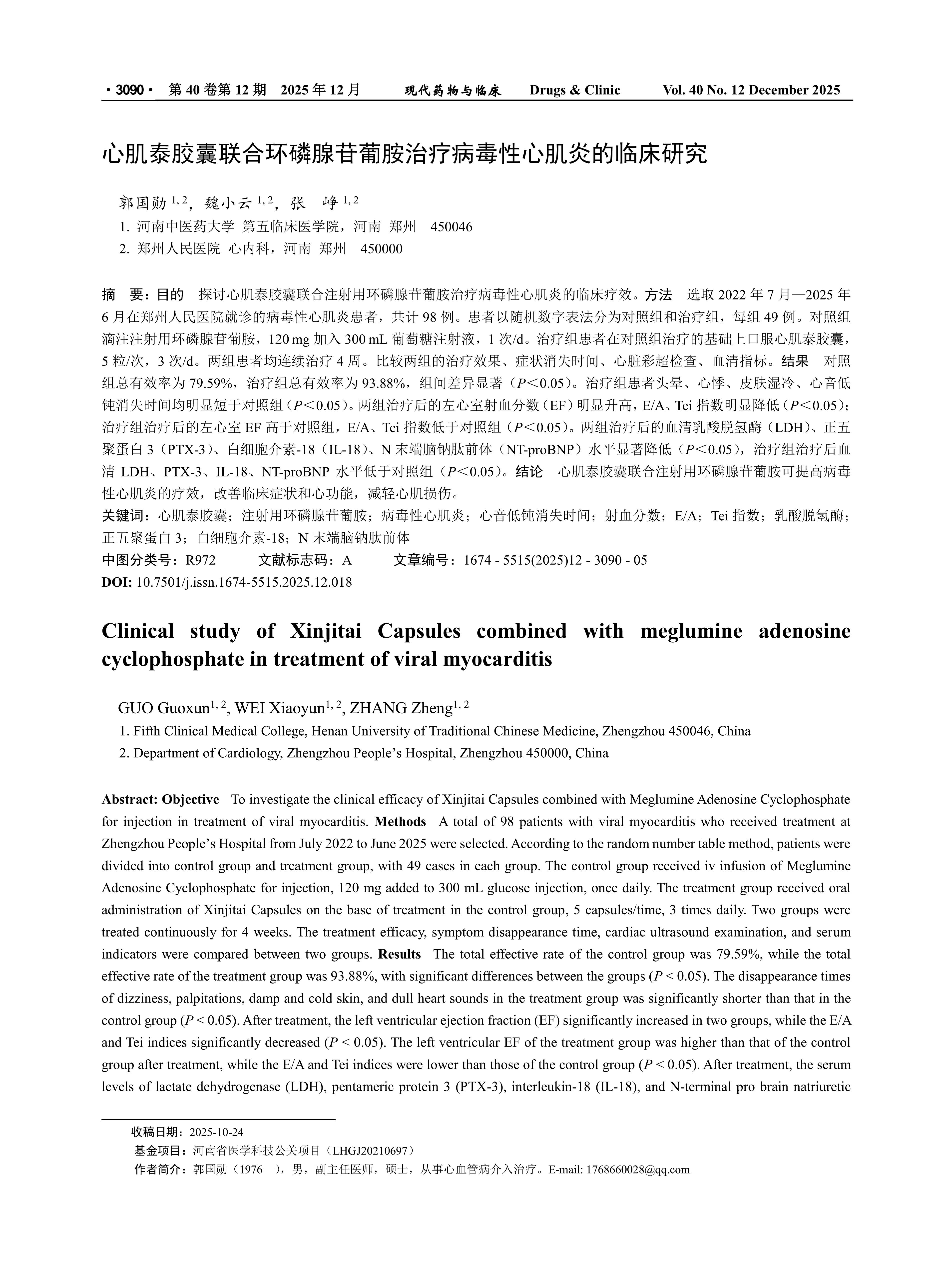 Objective To investigate the clinical efficacy of Xinjitai Capsules combined with Meglumine Adenosine Cyclophosphate for injection in treatment of viral myocarditis. Methods A total of 98 patients with viral myocarditis who received treatment at Zhengzhou People’s Hospital from July 2022 to June 2025 were selected. According to the random number table method, patients were divided into control group and treatment group, with 49 cases in each group. The control group received iv infusion of Meglumine Adenosine Cyclophosphate for injection, 120 mg added to 300 mL glucose injection, once daily. The treatment group received oral administration of Xinjitai Capsules on the base of treatment in the control group, 5 capsules/time, 3 times daily. Two groups were treated continuously for 4 weeks. The treatment efficacy, symptom disappearance time, cardiac ultrasound examination, and serum indicators were compared between two groups. Results The total effective rate of the control group was 79.59%, while the total effective rate of the treatment group was 93.88%, with significant differences between the groups (P < 0.05). The disappearance times of dizziness, palpitations, damp and cold skin, and dull heart sounds in the treatment group was significantly shorter than that in the control group (P < 0.05). After treatment, the left ventricular ejection fraction (EF) significantly increased in two groups, while the E/A and Tei indices significantly decreased (P < 0.05). The left ventricular EF of the treatment group was higher than that of the control group after treatment, while the E/A and Tei indices were lower than those of the control group (P < 0.05). After treatment, the serum levels of lactate dehydrogenase (LDH), pentameric protein 3 (PTX-3), interleukin-18 (IL-18), and N-terminal pro brain natriuretic peptide (NT-proBNP) in two groups were significantly reduced (P < 0.05). The serum levels of LDH, PTX-3, IL-18, and NT-proBNP in the treatment group were lower than those in the control group after treatment (P < 0.05). Conclusion The combination of Xinjitai Capsules and Meglumine Adenosine Cyclophosphate for injection can improve the efficacy of viral myocarditis, improve clinical symptoms and heart function, and alleviate myocardial injury.