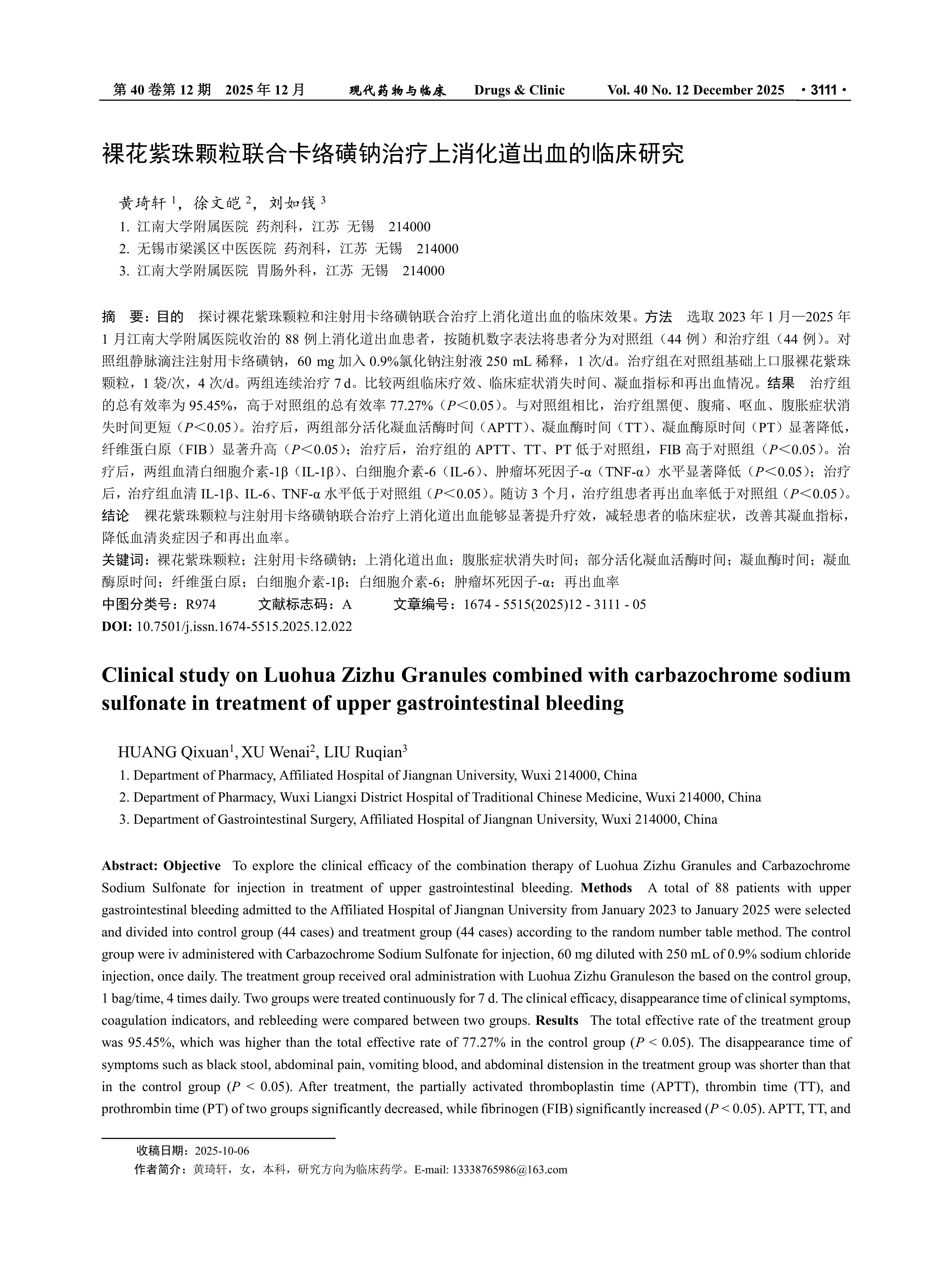 Objective To explore the clinical efficacy of the combination therapy of Luohua Zizhu Granules and Carbazochrome Sodium Sulfonate for injection in treatment of upper gastrointestinal bleeding. Methods A total of 88 patients with upper gastrointestinal bleeding admitted to the Affiliated Hospital of Jiangnan University from January 2023 to January 2025 were selected and divided into control group (44 cases) and treatment group (44 cases) according to the random number table method. The control group were iv administered with Carbazochrome Sodium Sulfonate for injection, 60 mg diluted with 250 mL of 0.9% sodium chloride injection, once daily. The treatment group received oral administration with Luohua Zizhu Granuleson the based on the control group, 1 bag/time, 4 times daily. Two groups were treated continuously for 7 d. The clinical efficacy, disappearance time of clinical symptoms, coagulation indicators, and rebleeding were compared between two groups. Results The total effective rate of the treatment group was 95.45%, which was higher than the total effective rate of 77.27% in the control group (P < 0.05). The disappearance time of symptoms such as black stool, abdominal pain, vomiting blood, and abdominal distension in the treatment group was shorter than that in the control group (P < 0.05). After treatment, the partially activated thromboplastin time (APTT), thrombin time (TT), and prothrombin time (PT) of two groups significantly decreased, while fibrinogen (FIB) significantly increased (P < 0.05). APTT, TT, and PT of the treatment group were lower than those of the control group, while FIB was higher than that of the control group (P < 0.05). After treatment, the serum levels of interleukin-1β (IL-1β), interleukin-6 (IL-6), and tumor necrosis factor-α (TNF-α) were significantly reduced in two groups (P < 0.05), and the serum levels of IL-1β, IL-6, and TNF-α in the treatment group were significantly lower than those in the control group (P < 0.05). After a 3-month follow-up, the treatment group had a lower rebleeding rate than that of the control group (P < 0.05). Conclusion The combination of Luohua Zizhu Granules and Carbazochrome Sodium Sulfonate for injection in treatment of upper gastrointestinal bleeding can significantly improve the clinical efficacy of patients, alleviate clinical symptoms, improve coagulation indicators, and reduce serum inflammatory factors and rebleeding rates.