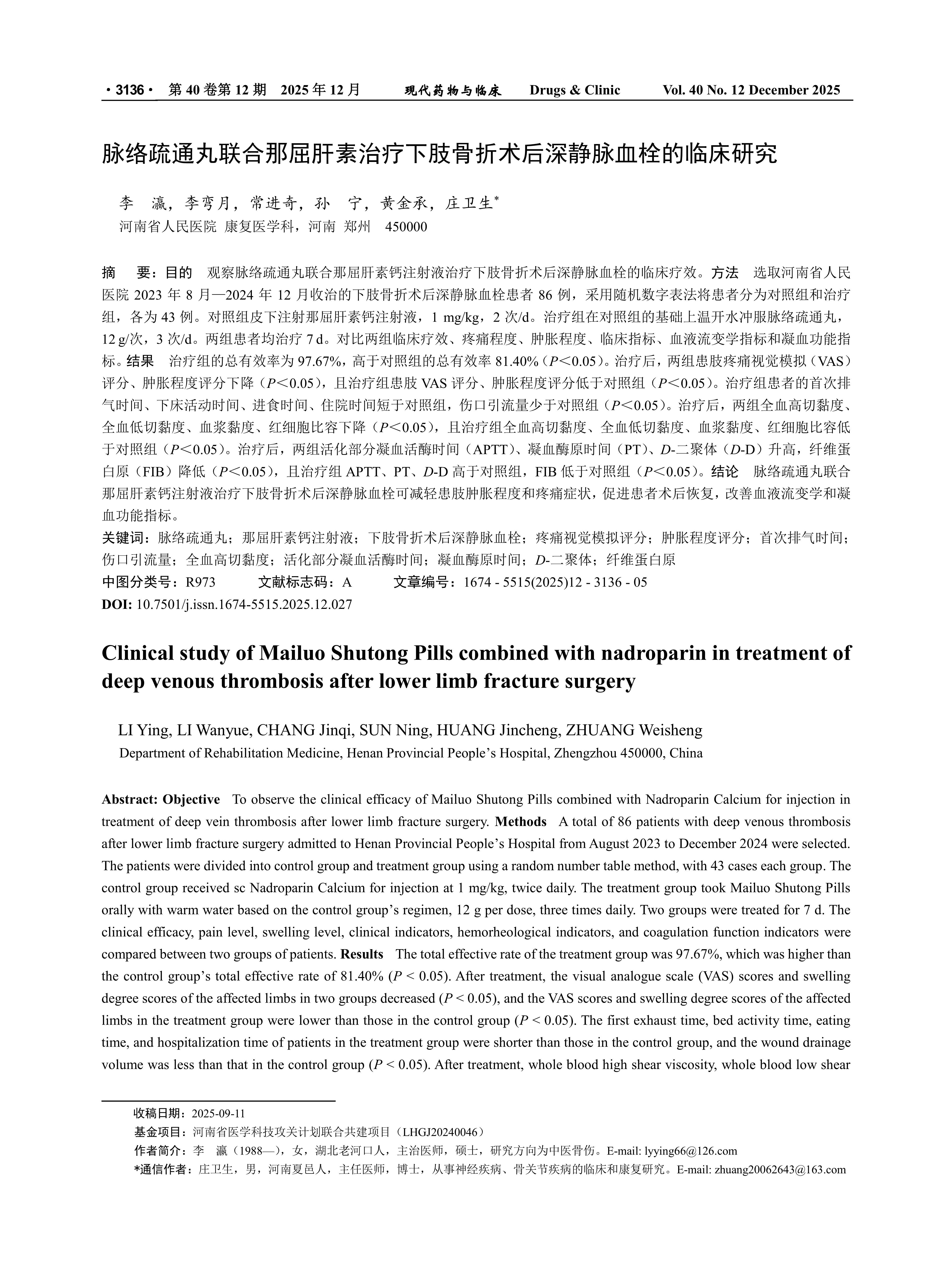 Objective To observe the clinical efficacy of Mailuo Shutong Pills combined with Nadroparin Calcium for injection in treatment of deep vein thrombosis after lower limb fracture surgery. Methods A total of 86 patients with deep venous thrombosis after lower limb fracture surgery admitted to Henan Provincial People’s Hospital from August 2023 to December 2024 were selected. The patients were divided into control group and treatment group using a random number table method, with 43 cases each group. The control group received sc Nadroparin Calcium for injection at 1 mg/kg, twice daily. The treatment group took Mailuo Shutong Pills orally with warm water based on the control group’s regimen, 12 g per dose, three times daily. Two groups were treated for 7 d. The clinical efficacy, pain level, swelling level, clinical indicators, hemorheological indicators, and coagulation function indicators were compared between two groups of patients. Results The total effective rate of the treatment group was 97.67%, which was higher than the control group’s total effective rate of 81.40% (P < 0.05). After treatment, the visual analogue scale (VAS) scores and swelling degree scores of the affected limbs in two groups decreased (P < 0.05), and the VAS scores and swelling degree scores of the affected limbs in the treatment group were lower than those in the control group (P < 0.05). The first exhaust time, bed activity time, eating time, and hospitalization time of patients in the treatment group were shorter than those in the control group, and the wound drainage volume was less than that in the control group (P < 0.05). After treatment, whole blood high shear viscosity, whole blood low shear viscosity, plasma viscosity, and hematocrit of two groups decreased (P < 0.05), and whole blood high shear viscosity, whole blood low shear viscosity, plasma viscosity, and hematocrit of the treatment group were lower than those of the control group (P < 0.05). After treatment, the activated partial thromboplastin time (APTT), prothrombin time (PT), and D-dimer (D-D) in two groups increased, while fibrinogen (FIB) decreased (P < 0.05). Moreover, APTT, PT, and D-D in the treatment group were higher than those in the control group, while FIB was lower than that in the control group (P < 0.05). Conclusion Mailuo Shutong Pills combined with Nadroparin Calcium for injection in treatment of deep vein thrombosis after lower limb fracture surgery can reduce the degree of swelling and pain symptoms of the affected limb, promote postoperative recovery, and improve blood rheology and coagulation function indicators.