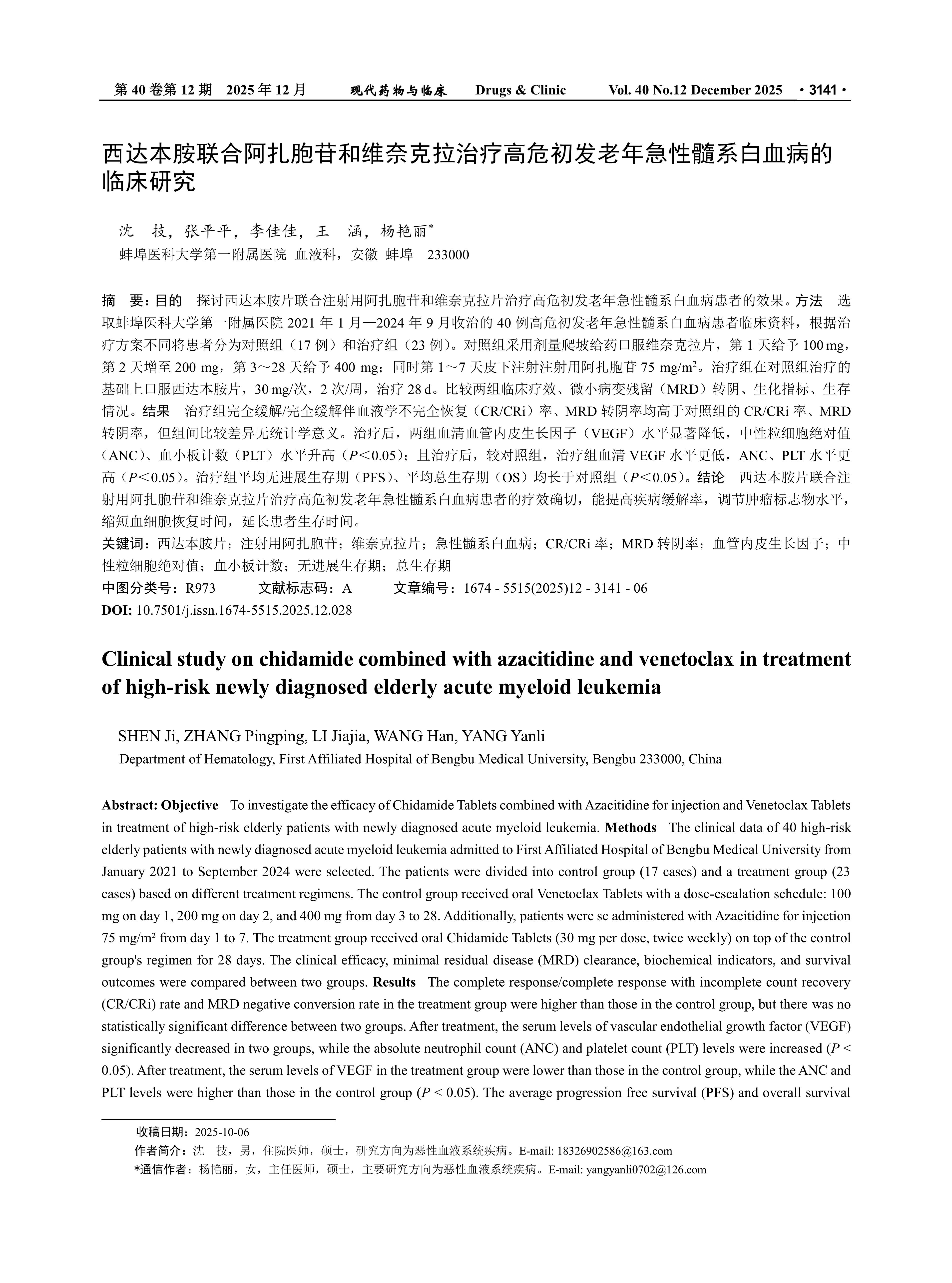 Objective To investigate the efficacy of Chidamide Tablets combined with Azacitidine for injection and Venetoclax Tablets in treatment of high-risk elderly patients with newly diagnosed acute myeloid leukemia. Methods The clinical data of 40 high-risk elderly patients with newly diagnosed acute myeloid leukemia admitted to First Affiliated Hospital of Bengbu Medical University from January 2021 to September 2024 were selected. The patients were divided into control group (17 cases) and a treatment group (23 cases) based on different treatment regimens. The control group received oral Venetoclax Tablets with a dose-escalation schedule: 100 mg on day 1, 200 mg on day 2, and 400 mg from day 3 to 28. Additionally, patients were sc administered with Azacitidine for injection 75 mg/m² from day 1 to 7. The treatment group received oral Chidamide Tablets (30 mg per dose, twice weekly) on top of the control group's regimen for 28 days. The clinical efficacy, minimal residual disease (MRD) clearance, biochemical indicators, and survival outcomes were compared between two groups. Results The complete response/complete response with incomplete count recovery (CR/CRi) rate and MRD negative conversion rate in the treatment group were higher than those in the control group, but there was no statistically significant difference between two groups. After treatment, the serum levels of vascular endothelial growth factor (VEGF) significantly decreased in two groups, while the absolute neutrophil count (ANC) and platelet count (PLT) levels were increased (P < 0.05). After treatment, the serum levels of VEGF in the treatment group were lower than those in the control group, while the ANC and PLT levels were higher than those in the control group (P < 0.05). The average progression free survival (PFS) and overall survival (OS) of the treatment group were longer than those of the control group (P < 0.05). Conclusion The combination of Chidamide Tablets, Azacitidine for injection and Venetoclax Tablets has a definite therapeutic effect on high-risk newly diagnosed elderly patients with acute myeloid leukemia. It can improve disease remission rate, regulate tumor marker levels, shorten blood cell recovery time, and prolong patient survival time.