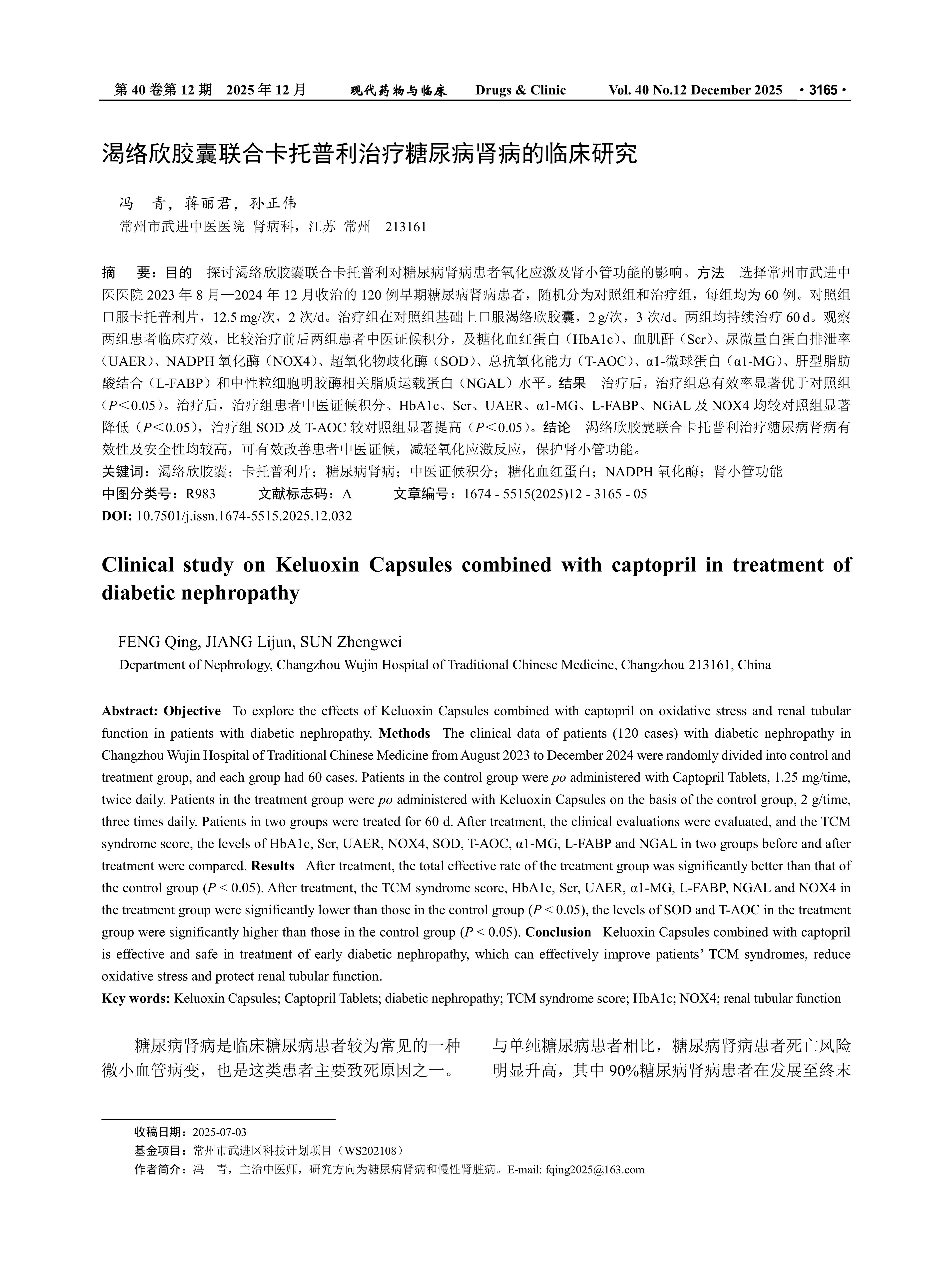 Objective To explore the effects of Keluoxin Capsules combined with captopril on oxidative stress and renal tubular function in patients with diabetic nephropathy. Methods The clinical data of patients (120 cases) with diabetic nephropathy in Changzhou Wujin Hospital of Traditional Chinese Medicine from August 2023 to December 2024 were randomly divided into control and treatment group, and each group had 60 cases. Patients in the control group were po administered with Captopril Tablets, 1.25 mg/time, twice daily. Patients in the treatment group were po administered with Keluoxin Capsules on the basis of the control group, 2 g/time, three times daily. Patients in two groups were treated for 60 d. After treatment, the clinical evaluations were evaluated, and the TCM syndrome score, the levels of HbA1c, Scr, UAER, NOX4, SOD, T-AOC, α1-MG, L-FABP and NGAL in two groups before and after treatment were compared. Results After treatment, the total effective rate of the treatment group was significantly better than that of the control group (P < 0.05). After treatment, the TCM syndrome score, HbA1c, Scr, UAER, α1-MG, L-FABP, NGAL and NOX4 in the treatment group were significantly lower than those in the control group (P < 0.05), the levels of SOD and T-AOC in the treatment group were significantly higher than those in the control group (P < 0.05). Conclusion Keluoxin Capsules combined with captopril is effective and safe in treatment of early diabetic nephropathy, which can effectively improve patients’ TCM syndromes, reduce oxidative stress and protect renal tubular function.